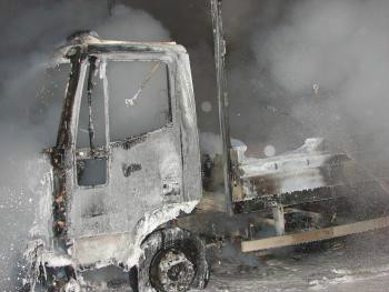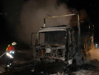 Ein LKW aus dem Baden-Württenbergischen Zulassungsbereich Biberach war in Flammen aufgegangen. Der Fahrer bemerkte, dass aus dem Motorraum Rauch drang. Er stellte daraufhin seinen LKW ab und verständigte die Feuerwehr. Beim Eintreffen der Wehren stand der LKW bereits in Vollbrand. Trotz des schnellen und umsichtigen Eingreifens der Wehren konnte die Ladung, Ersatzteile für Pkws, nicht mehr gerettet werden und der LKW brannte total aus.