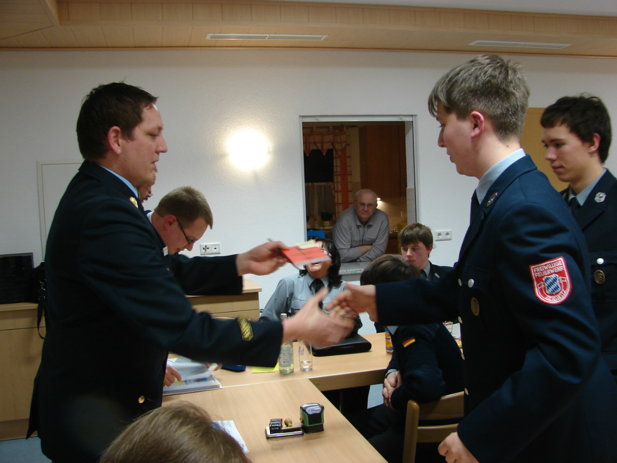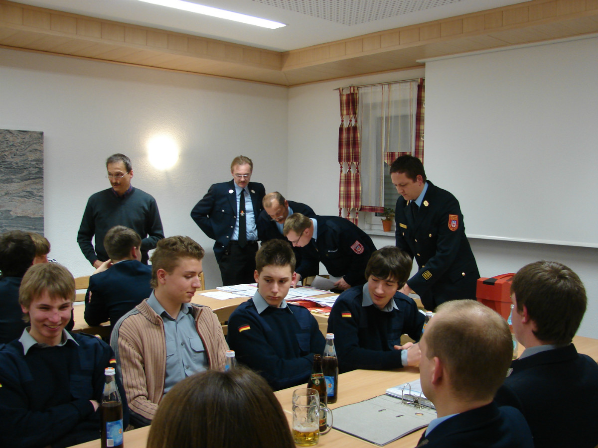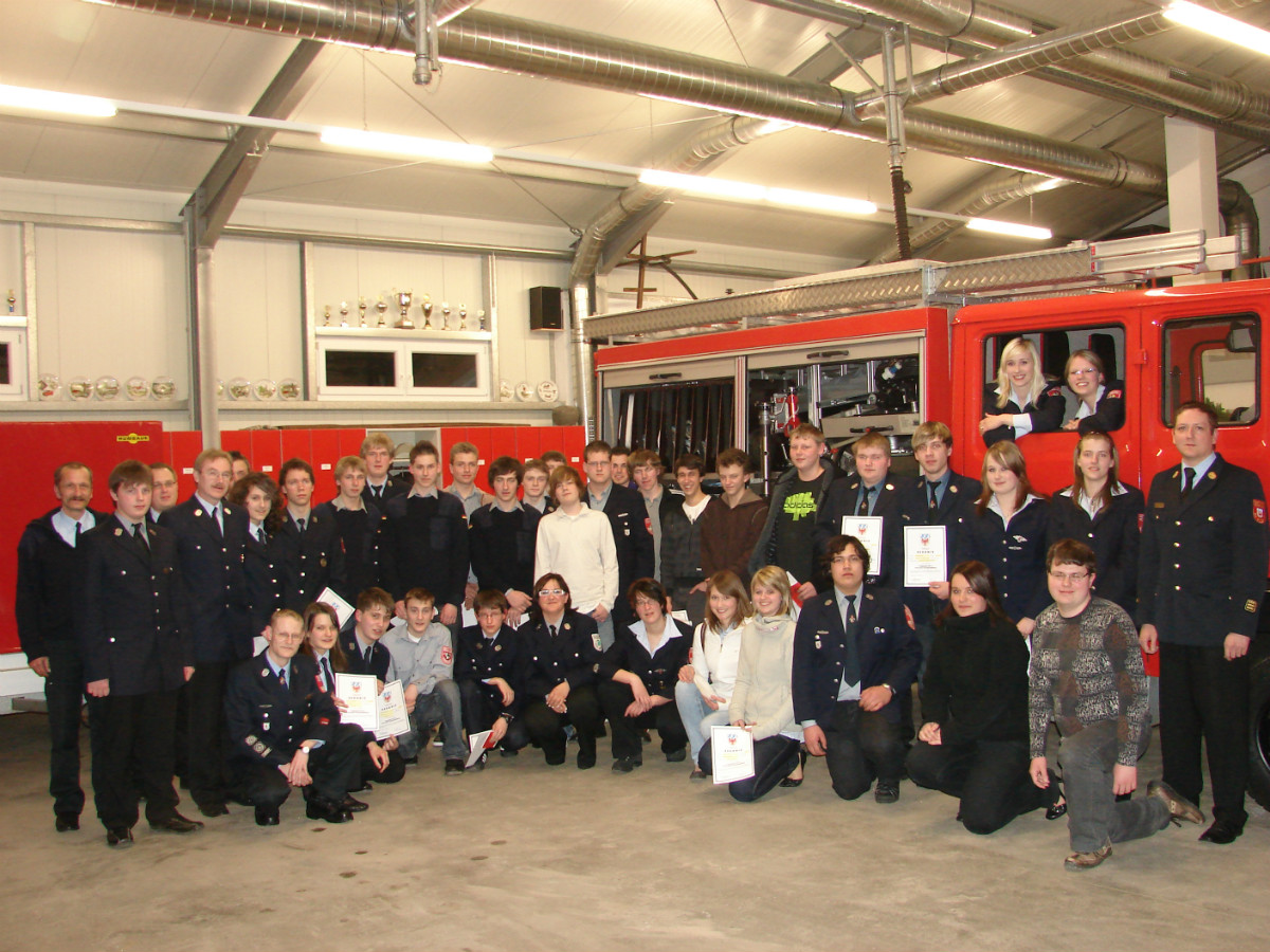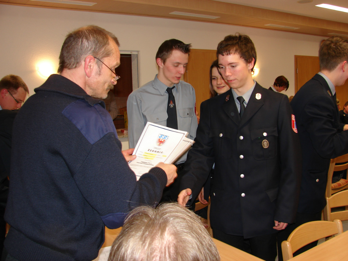 Er blickte in seiner Rede nochmals auf den Lehrgang zurück. Der Lehrgang begann im November 2009 und in fast jeder Woche wurde ein Teilbereich der Ausbildung von zwölf Ausbildern gelehrt. Der Truppmannlehrgang umfasste 70 Stunden und nach jeder Ausbildungseinheit wurde ein Test von den Teilnehmern abgelegt. Am Ende des Lehrganges wurden die Tests zusammen gezählt. Es sollten mindestens 50 Prozent der Fragen richtig beantwortet werden. Andreas Heizmann konnte ein Ergebnis von weit über 80 Prozent verkünden.