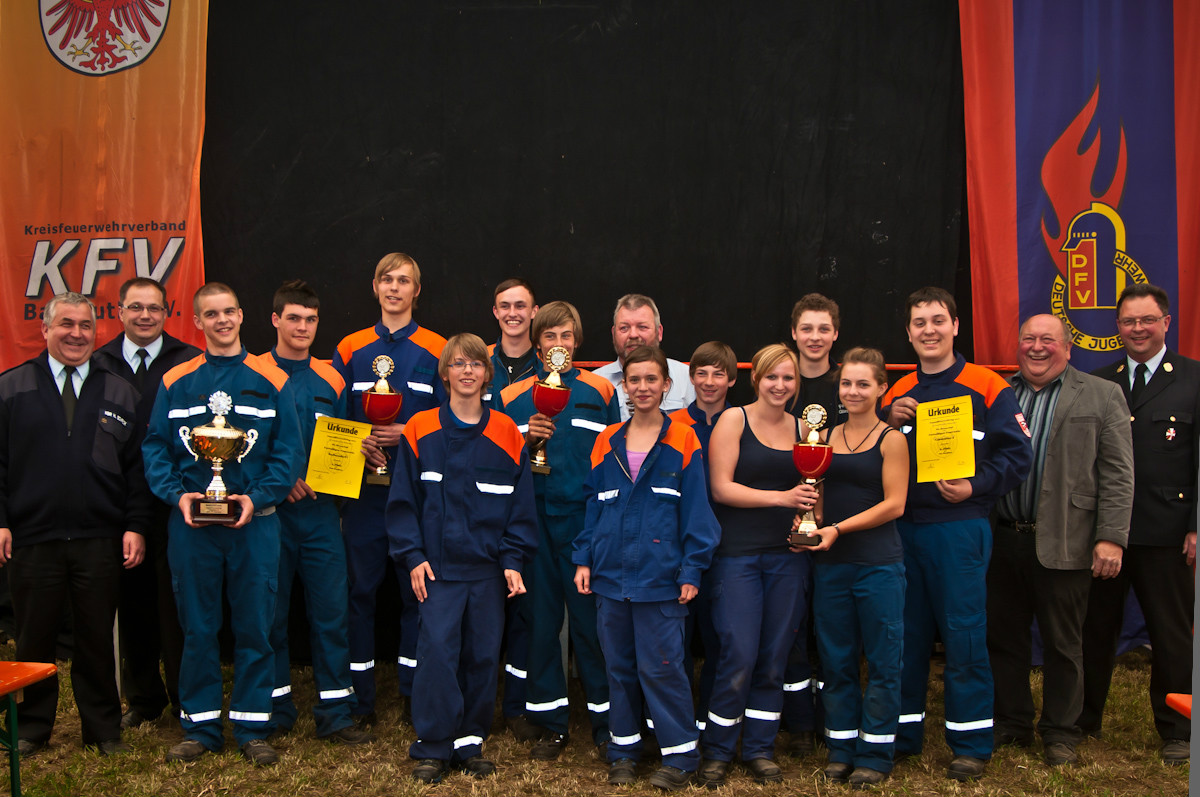 Mit nahezu unglaublichen 800 von 800 möglichen Punkten konnten die Jugendfeuerwehrleute aus Sachsendorf nach einer spannungsgeladenen Auflistung der erreichten Ränge den Pokal für den ersten Platz in Empfang nehmen, ebenso wie den begehrten Wanderpokal der Inspektion II. Diese Mannschaft wird zudem eine von vier Wettbewerbsgruppen bilden, die den Landkreis Bayreuth auf oberfränkischer Ebene beim Bezirksjugendleistungsmarsch am 01.10.2011 in Bad Staffelstein vertreten wird.