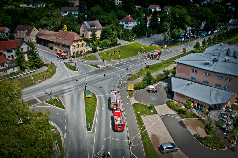 Nachdem die Feuerwehr Bad Berneck bei einer ersten Erkundung der Lage festgestellt hatte, dass sich aus einem dortigen Gully ein stechender, atemwegsreizender Geruch und eine unklare Rauchentwicklung ausbildete, wurden die Alarmstufe für die Feuerwehren auf 7 – Gefahrgut – erhöht. Die Einsatzstelle wurde sofort großräumig abgesichert, mit der Folge, dass auch die B 303 bzw. die B 2 für den Verkehr lokal durch die Polizei gesperrt werden mussten.