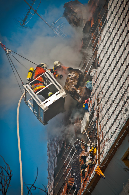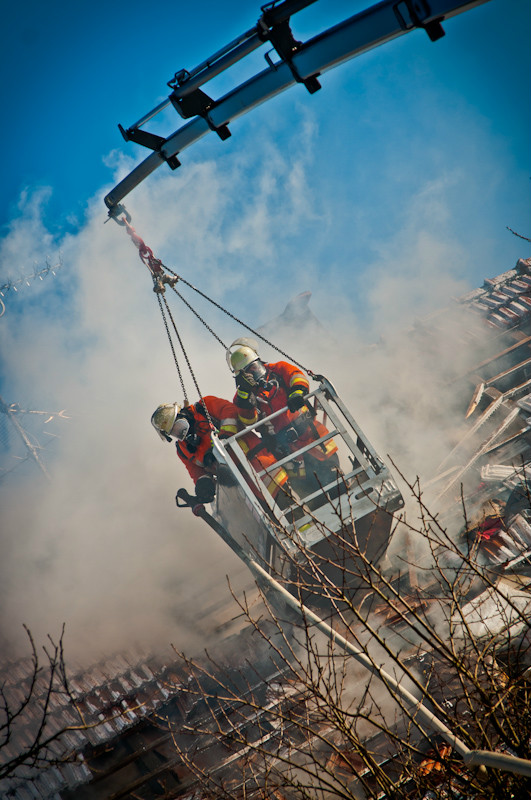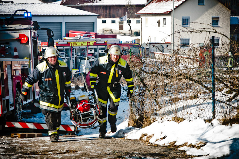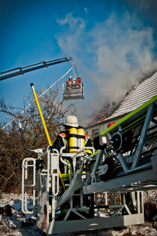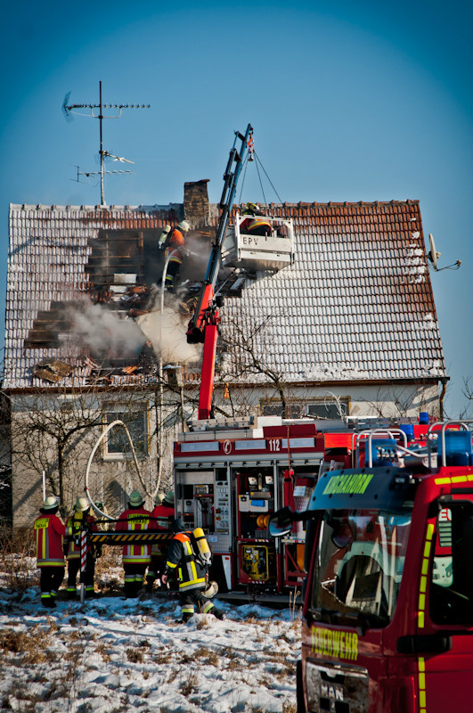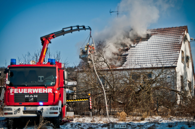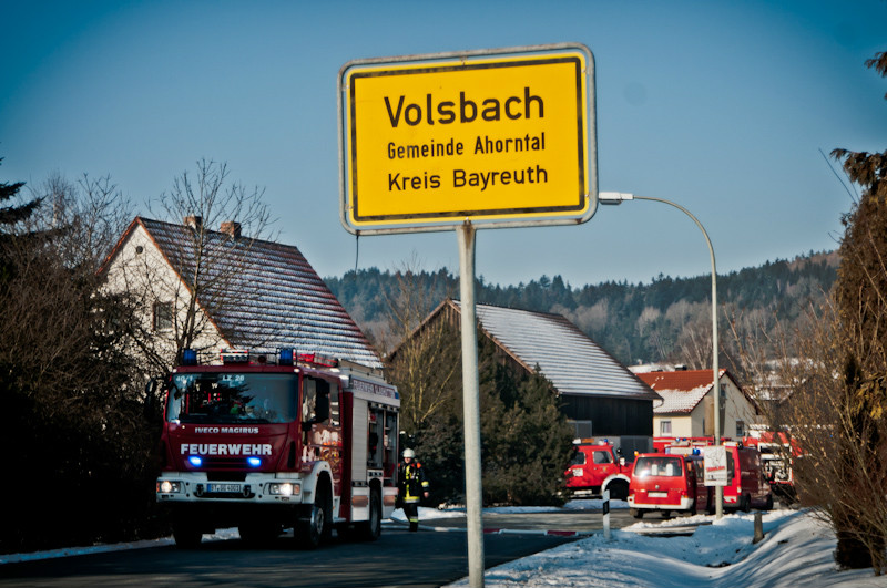 Am Vormittag des 02.02.2012 ereignete sich in Volsbach, Gemeinde Ahorntal, aus bisher unklaren Gründen ein Wohnhausbrand. Nachdem die Einsatzmeldung der Integrierten Leitstelle Bayreuth/Kulmbach für die Feuerwehren zunächst lediglich einen sogenannten Kaminbrand erwarten ließ, stellte sich die Lage jedoch nach der ersten Erkundung durch einen mit schwerem Atemschutzgeräten und Wärmebildkamera ausgestatteten Trupp der Feuerwehr Körzendorf so dar, dass es – unter starker Rauchausbreitung – im ersten Obergeschoss brennt und sich das offene Feuer auf den Dachstuhl ausbreitet. Die Bewohner befanden sich zu diesem Zeitpunkt schon außer Haus. Die Zugänglichkeit zu dem Gebäude bzw. zu dem eigentlichen Brandherd gestaltete sich allerdings für die vorgehenden Kräfte sehr schwierig, so dass die Feuerwehr das Dach öffnete und von außen über eine Drehleiter und einen Rüstwagen mit Kran einen Löschangriff mit Schaum startete.