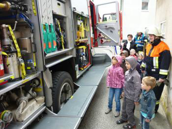 Zum Abschluß der Übung durften diese noch einen Blick in die Feuerwehrfahrzeuge und auf die Gerätschaften werfen.