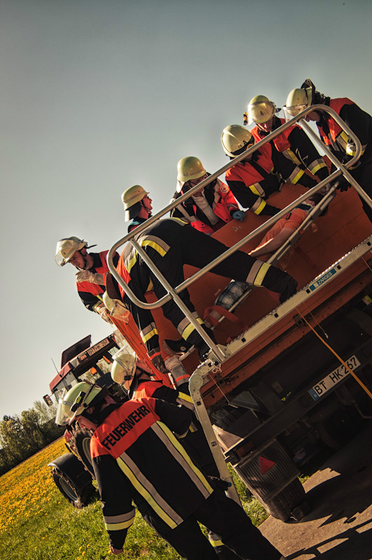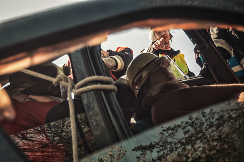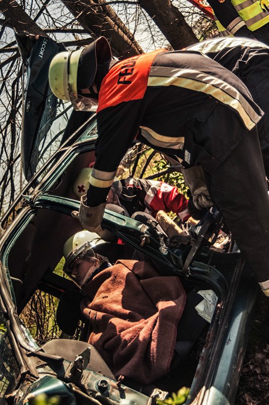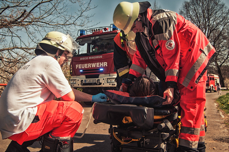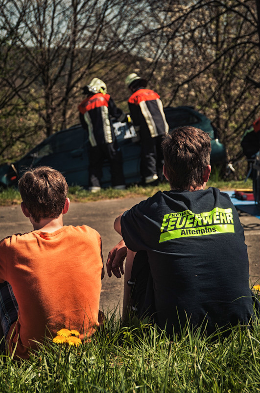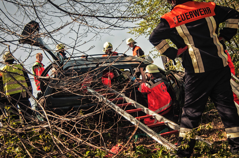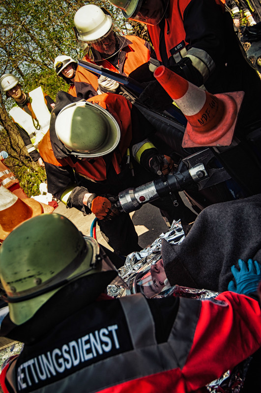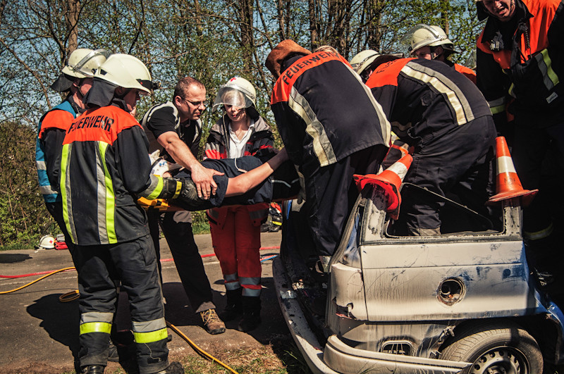 Der anschließende Nachmittag hatte es dann für die Teilnehmer in sich, und das nicht nur wegen der äußerst sommerlichen Temperaturen. Bei einem simulierten Verkehrsunfall zwischen zwei Fahrzeugen wurden mehrere Personen eingeklemmt und dabei zum Teil schwer verletzt. Durch geschickt eingestreute Zwischenfälle, wie beispielsweise dass schon zu Beginn der Übung ein Junge mit einer Handverletzung die anrückenden Einsatzfahrzeuge schon weit vor der eigentlichen Schadensstelle aufhielt, wurde der Spannungsbogen der Teilnehmer über lange Zeit aufrechterhalten.