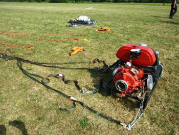 Vom Flugplatz „Zipser Berg“ wurde verschiedenes Material und Gerät wie z.B. eine Tragkraftspritze TS 8/8, Saugschläuche, Schlauchmaterial, Balken, … mit dem Hubschrauber aufgenommen und in das nahegelegene Übungsgebiet gebracht.