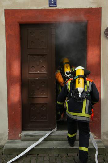 Bereits kurze Zeit nach dem Eintreffen waren die Atemschutzgeräteträger unter Leitung des Abschnittsleiters Otmar Fassold einsatzfertig, um in das stark verrauchte Gebäude vorzudringen.