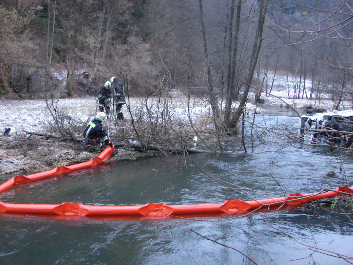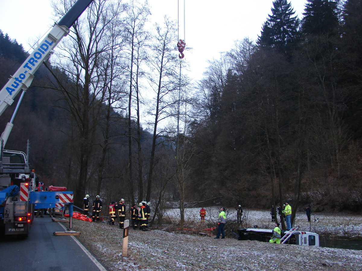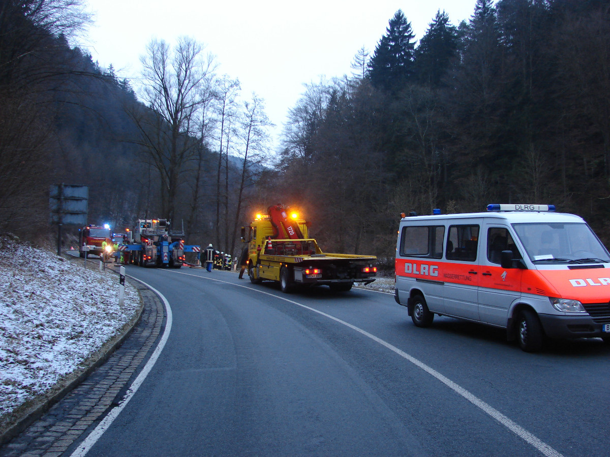 Am Montagmorgen (14.01.2013) wurde die Feuerwehr Tüchersfeld gegen 7 Uhr zur Erkundung eines Unfalles auf der B 470 Richtung Behringersmühle alarmiert. Die Einsatzkräfte unter der Leitung des Kreisbrandmeisters Siegfried Stiefler fanden einen Kleinbus auf der Seite liegend in der Püttlach vor. Neben dem Fahrer befanden sich zwei Rollstuhlfahrer im Fahrzeug. Die Insassen wurden befreit und das alarmierte BRK fuhr sie in ein Krankenhaus. Da der Schadensumfang nicht sofort erkennbar war, wurden durch die Integrierte Leitstelle die Wehren aus Gößweinstein und Pottenstein nachalarmiert. Zudem drohte anfänglich Betriebsmittel auszutreten, deshalb wurde der Kreisbrandmeister für Gefahrgut, Ralf Riedel, zur Einsatzstelle gerufen. Von der Feuerwehr wurde vorsorglich eine Ölsperre auf dem Gewässer eingebaut. Der Kleinbus wurde durch eine Fachfirma mit Hilfe eines Kranfahrzeuges geborgen und abtransportiert. Die Bundesstraße war für die Dauer des Einsatzes total gesperrt. Der Verkehr wurde durch die Feuerwehr großräumig umgeleitet. Die Polizei war mit zwei Streifenbesatzungen vor Ort und nahm die Ermittlungen zur Unfallursache auf. Der Einsatzleiter wurde durch Kreisbrandinspektor Adolf Mendel und Kreisbrandmeister Michael Lorke (Landkreis Forchheim) unterstützt.