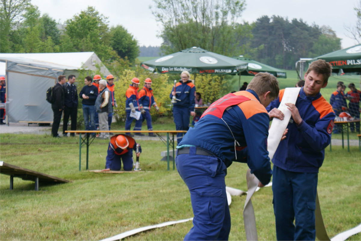 So wurden unter anderem an den Stationen technische Fähigkeiten, wie Saugleitung kuppeln, Leinenzielwurf, Spritzen mit der Kübelspritze, Schlauch ausrollen und Geräte hochziehen geprüft, aber auch theoretisches Wissen bei den Testfragen und Gefahrzeichen abgefragt. An drei Stationen konnten die Jugendlichen ihre Geschicklichkeit mit den Leinen unter Beweis stellen, sie mussten einen Brustbund anlegen, einen Mastwurf fehlerfrei auf Zeit vorführen und am Knotengestell die wichtigsten Knoten zeigen. Schnelligkeit und Fertigkeiten zählten bei der Olympiade, die die Teilnehmer zusätzlich absolvieren konnten.