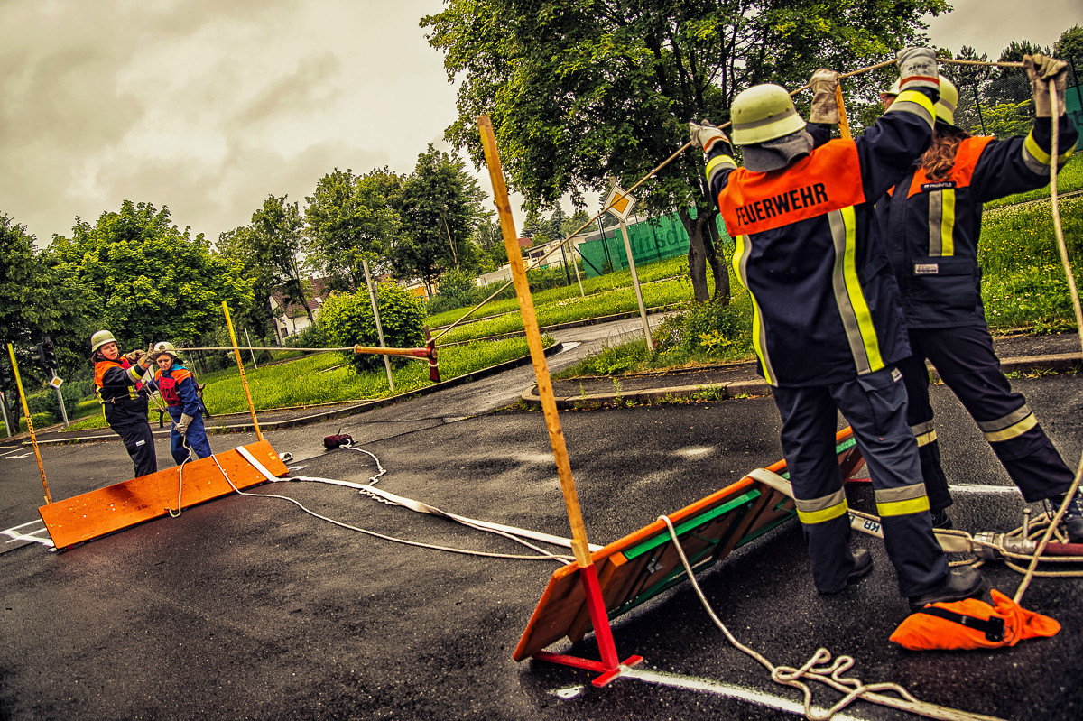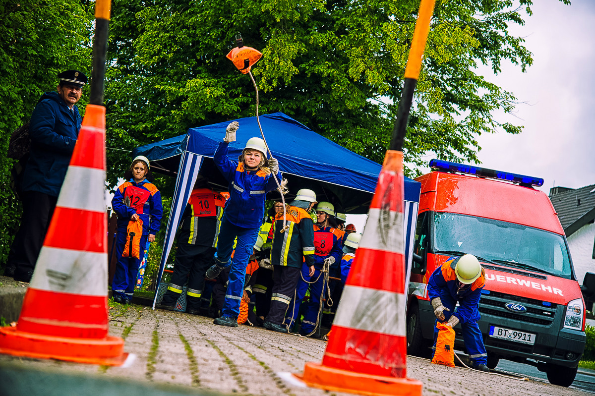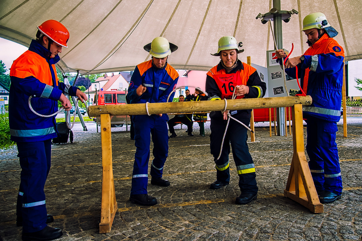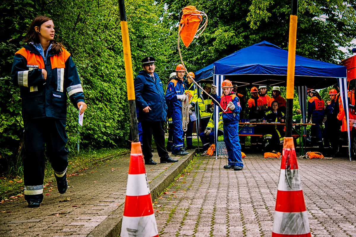 Insgesamt 138 Jugendliche aus 23 Feuerwehren waren in 40 Staffeln angetreten, um ihr feuerwehrtechnisches Wissen und Können an sieben Stationen zu demonstrieren und im kameradschaftlichen Wettstreit untereinander zu messen. Hierzu zählten das Anfertigen eines Brustbundes, der Transport einer Feuerwehraxt sowie eines C-Schlauches über ein gedachtes Hindernis, Zielwerfen mit der Feuerwehrleine, Zusammenkuppeln einer 90-Meter-C-Leitung, Knoten und Stiche, ein theoretischer Test sowie das Erkennen und Zuordnen von wasserführenden Armaturen, Kupplungen und Zubehör. Hinzu kam eine Start- und Zielkontrolle, die ebenso in die Bewertung fiel wie das Auftreten der Gruppen.