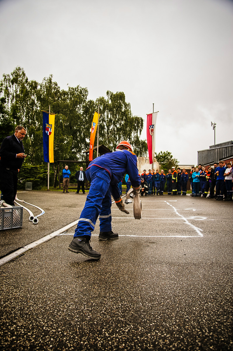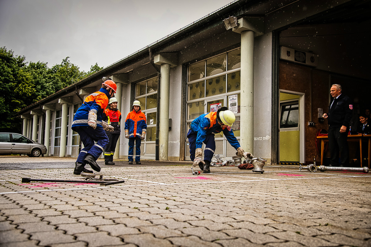 Insgesamt 138 Jugendliche aus 23 Feuerwehren waren in 40 Staffeln angetreten, um ihr feuerwehrtechnisches Wissen und Können an sieben Stationen zu demonstrieren und im kameradschaftlichen Wettstreit untereinander zu messen. Hierzu zählten das Anfertigen eines Brustbundes, der Transport einer Feuerwehraxt sowie eines C-Schlauches über ein gedachtes Hindernis, Zielwerfen mit der Feuerwehrleine, Zusammenkuppeln einer 90-Meter-C-Leitung, Knoten und Stiche, ein theoretischer Test sowie das Erkennen und Zuordnen von wasserführenden Armaturen, Kupplungen und Zubehör. Hinzu kam eine Start- und Zielkontrolle, die ebenso in die Bewertung fiel wie das Auftreten der Gruppen.