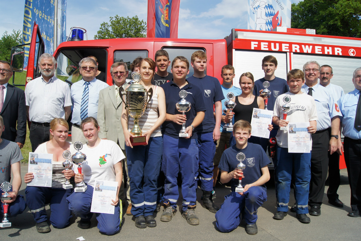 Was kann es für einen Gastgeber Schöneres geben, als wenn er selbst gebührend gefeiert wird? In Benk wurde dies nun zur fast schon unglaublichen Wirklichkeit – dies zuletzt nicht deshalb, weil der Wanderpokal beim Jugendleistungsmarsch in der Inspektion I des Landkreises seit Jahren in der festen Hand der kleinen, aber schlagkräftigen Ortswehr Wasserknoden gehalten wurde. Seinen Spitznamen hatte er deshalb längst weg: „Wasserknodenpokal“. Dass es diesmal ausgerechnet dem Gastgeber mit einer Jugendgemeinschaft aus Deps und Benk gelang, diese unglaublich erfolgreiche Serie zu durchbrechen, hat die Dorfgemeinschaft Benk zu einem jubelnden Gastgeber gemacht. 25 Staffeln mit 108 Jugendlichen waren angetreten, um sich im Wettbewerb zu messen. Besonders erfreulich: zwei Gastgruppen aus dem benachbarten Landkreis Kulmbach, die von der Feuerwehr Lanzendorf entsandt wurden, haben an dem Leistungsmarsch teilgenommen, der über eine landschaftlich reizvoll gelegene Strecke von sechs Kilometern rund um den Bindlacher Ortsteil führte. Und die Sonne strahlte mit den Verantwortlichen und Landrat Hermann Hübner um die Wette, als dieser verkündete: „jeder Mensch, jede Organisation braucht Zukunftsperspektiven – Ihr seid die Zukunft der Feuerwehr, die wir so dringend brauchen!“ Kreisbrandinspektor Winfried Prokisch definierte die Ziele des Jugendfeuerwehrtages: 1. die feuerwehrtechnische Grundausbildung; 2. die Pflege von Kameradschaft und Teamgeist, 3. das Gespür für die Schönheit unserer fränkischen Natur. Er sei stolz, mit welchem Enthusiasmus die Jugendlichen im Landkreis, von 1000 immerhin auch 25 % Mädchen, Anwärterdienst leisten. Die späteren, kurzen und heftigen Regenschauer, die so manche Gruppe böse überraschten, taten indes der tollen Stimmung keinen Abbruch. Löschangriffe wurden aufgebaut, Geräte transportiert, Knoten und Stiche gebunden, Gefahrgut- und Hinweiszeichen zugeordnet, Testfragen beantwortet, Erste-Hilfe-Maßnahmen durchgeführt sowie eine Überraschungsübung bewältigt. Und: die Ergebnisse überzeugten, wie Kreisbrandrat Hermann Schreck zur Siegerehrung herausstellte. Gerade einmal 119 Punkte lagen zwischen dem ersten und letzten Platz der 25 Staffeln. Die Gruppe Benk-Deps I hat allerdings etwas Besonderes geschafft: keinen einzigen Fehler zu machen. Der Pokal war dem Gastgeber also gewiß, dicht gefolgt von der Gruppe Wasserknoden II, Unterlind, Benk-DepsII, Heinersreuth I. Platz sechs ging an die Gastmannschaft Lanzendorf I. Einmal mehr hat sich die Freiwillige Feuerwehr Benk als herzlicher und hervorragend organisierter Gastgeber bewiesen – wir glauben, dass dies auch so mancher Vogel erkannt hat: nur so lässt es sich erklären, dass ausgerechnet im Abfalleimer direkt vor dem Feuerwehrhauseingang ein Vogel seinen Nistplatz gefunden hat, in dem derzeit die Jungen wild zwitschern. Sie dürften aber auch die einzigen gewesen sein, denen der Trubel zum Jugendfeuerwehrtag in Benk nicht gefallen hat 😉 Hier die Platzierung aller Pokalträger: 1. Benk/Deps I 2. Wasserknoden II 3. Unterlind 4. Benk/Deps II 5. Heinersreuth I 6. Lanzendorf I 7. Mehlmeisel 8. Bischofsgrün I 9. Dressendorf II 10.Goldkronach/Sickenreuth I 11.Wasserknoden I 12.Heinersreuth II Text: Carolin Rausch, Leiterin Fachbereich Öffentlichkeitsarbeit Fotos: Carolin Rausch