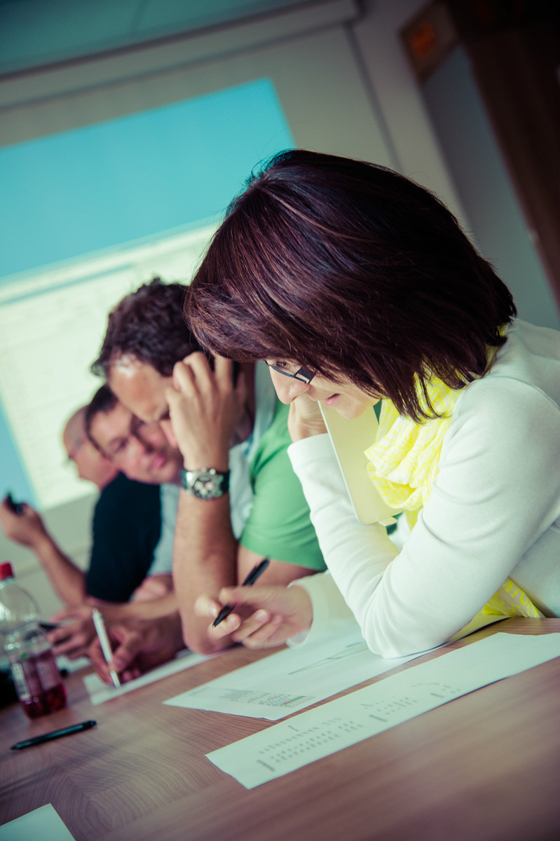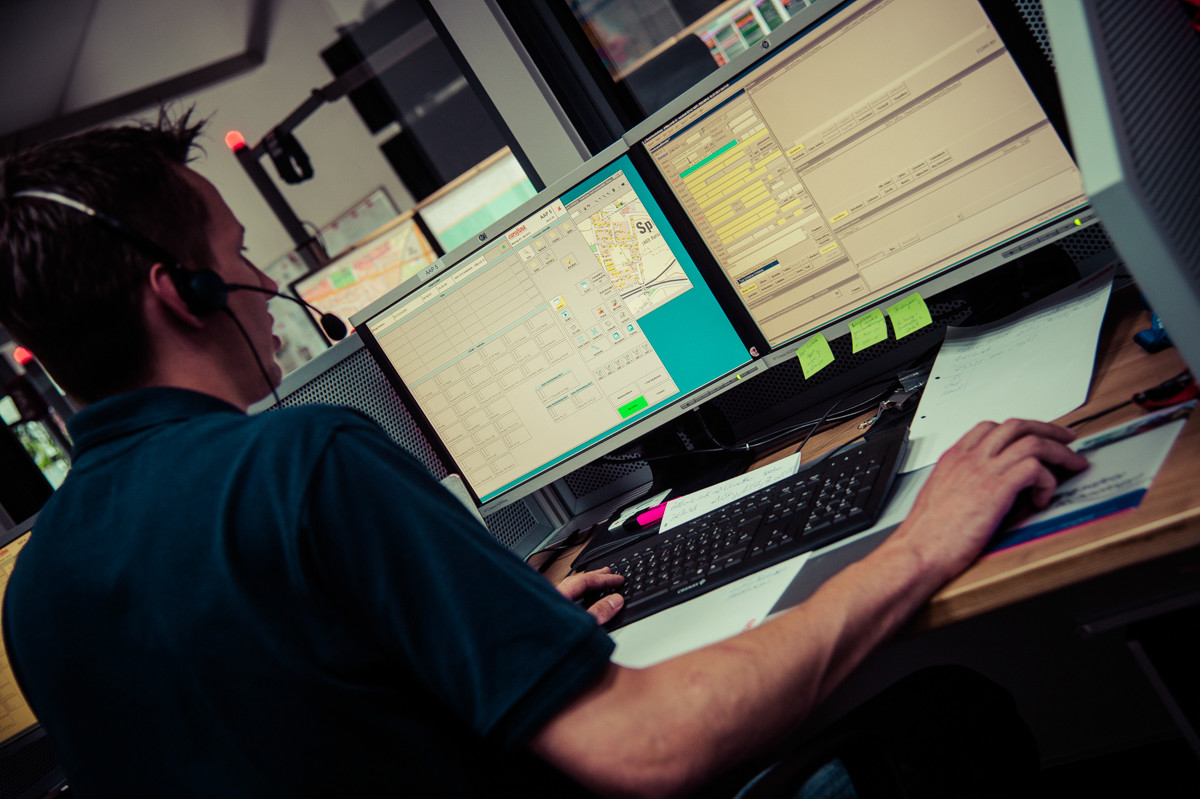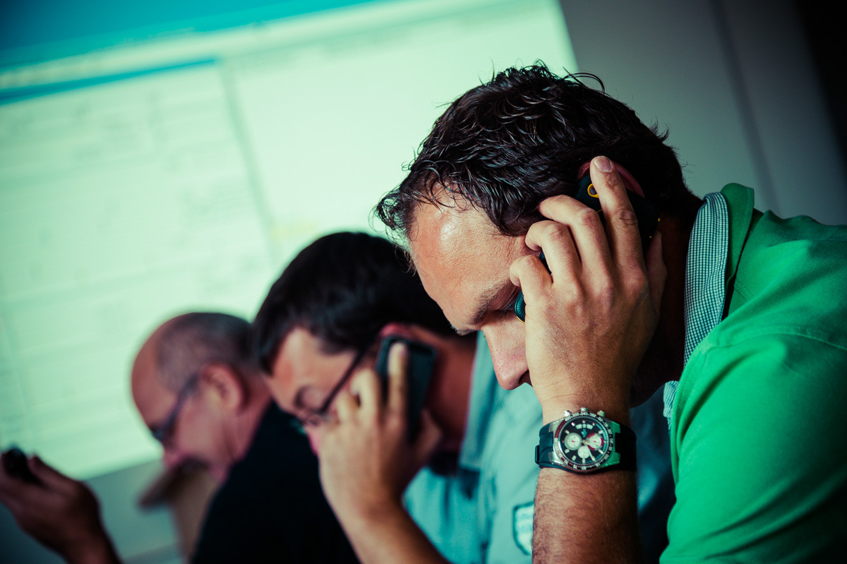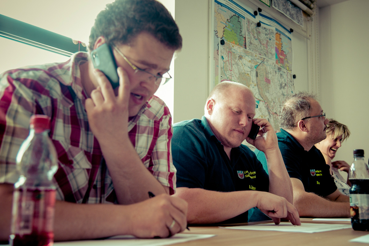 Knapp 60 Notrufe mit zeitunkritischen und teils problematischen Einsätzen galt es im Rahmen zweier jeweils 30minütiger Durchgänge abzuarbeiten. Dabei wurden zwei verschiedene Ansätze zur Bewältigung von hohem Anrufaufkommen einem Praxistest unterzogen. Eingebettet in ein virtuelles Starkregenereignis wurde unter anderem untersucht, welchen Gewinn der Einsatz von sogenannten Telefonsichtern bringt, die die eingehenden Gespräche in relativ kurzer Zeit durch gezielte Schlüsselfragen führen sollten. Während das Team von Markus Ruckdeschel, dem Leiter der ILS, alle Hände voll zu tun hatte, die Telefonate entgegenzunehmen, nach Prioritäten zu sortieren und die entsprechenden Maßnahmen in die Wege zu leiten, sorgten die anruferdarstellenden Feuerwehrleute um Kreisbrandinspektor Harald Schöberl für kontinuierlich neue Schadensstellen.