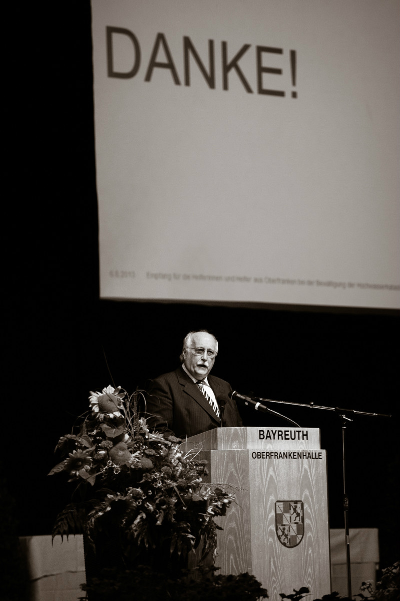 Am 06.08.2013 fand in der Bayreuther Oberfrankenhalle ein Empfang der Bayerischen Staatsregierung für rund 1000 oberfränkische Einsatzkräfte sämtlicher Couleur statt, welche vor kurzem in den von Hochwassermassen heimgesuchten Gebieten geholfen haben.