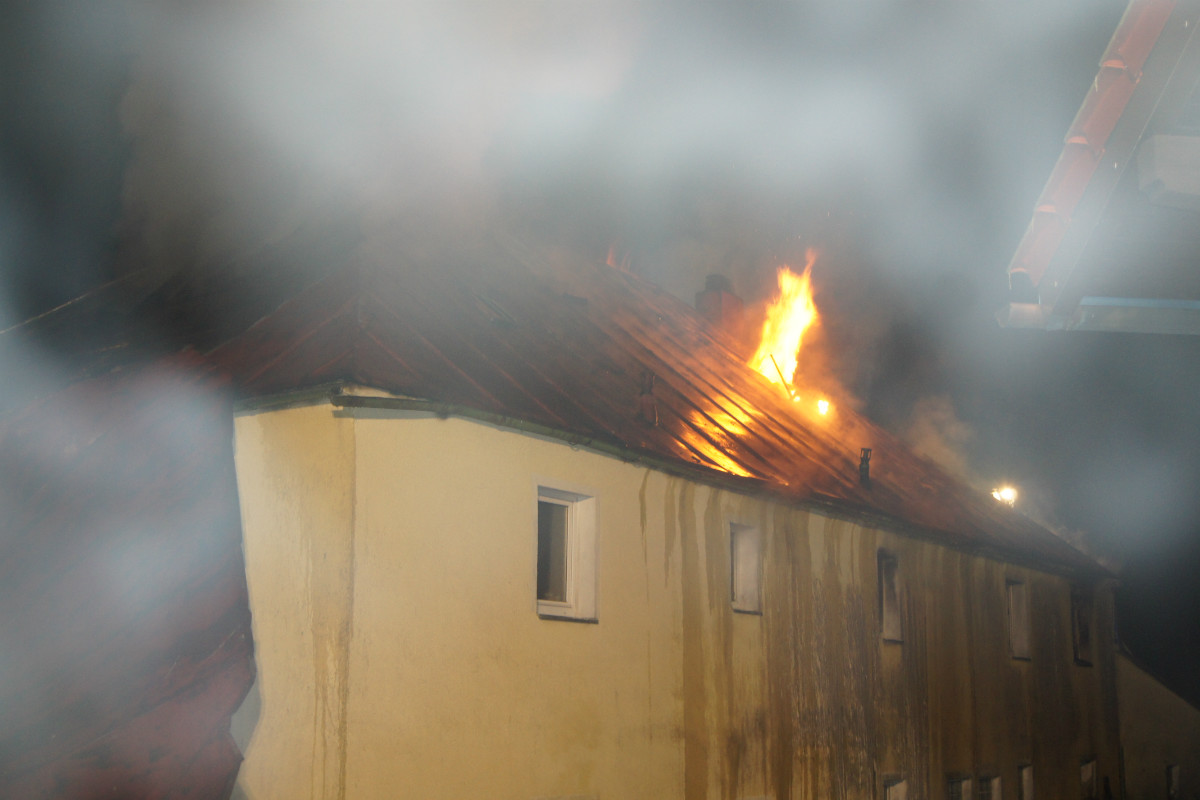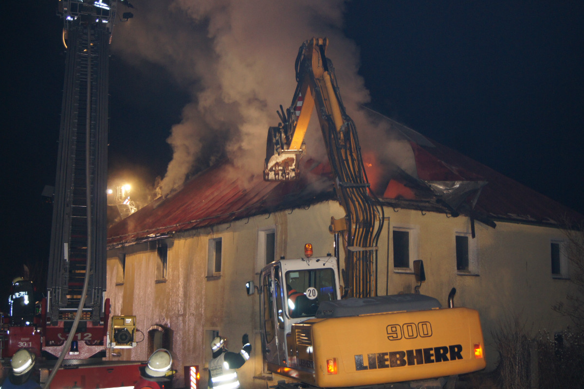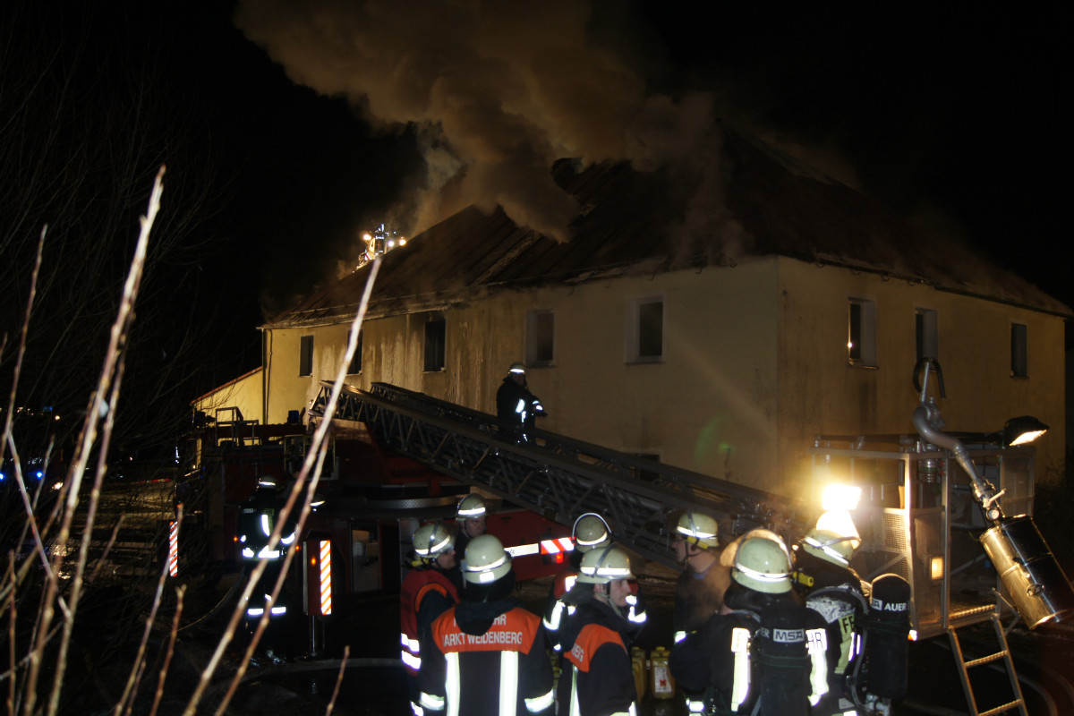 Erst durch das Einreißen des Dachstuhls mittels Bagger konnte der Brand im Kern effektiv bekämpft werden. Hierzu waren unter anderem die Drehleitern aus Kemnath und Wunsiedel im Einsatz. Aus Weidenberg wurde der Wasserwerfer des TLF 24/50 eingesetzt. Zahlreiche Trupps löschten vom Boden aus.