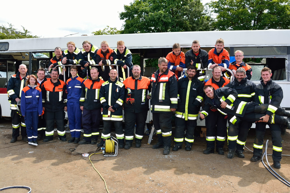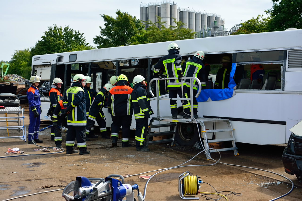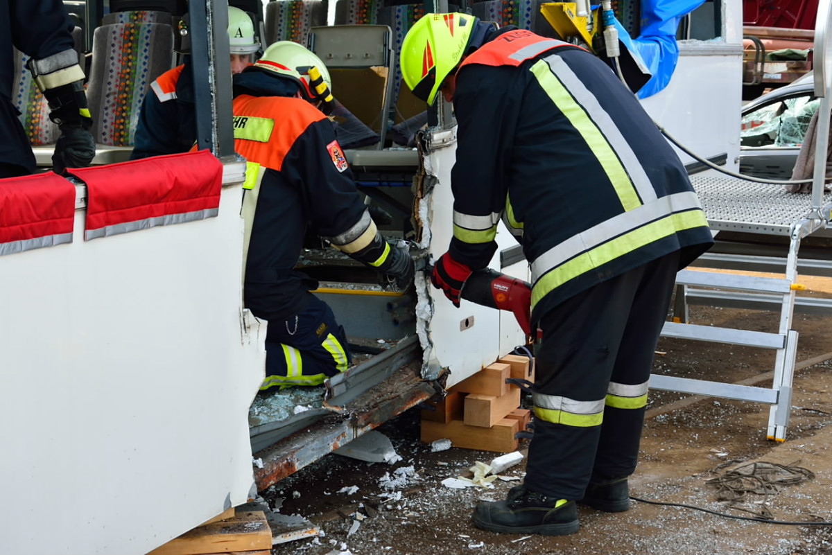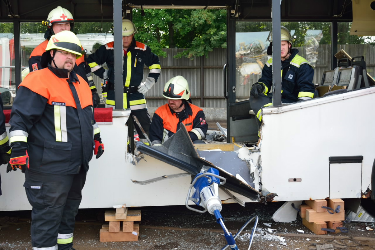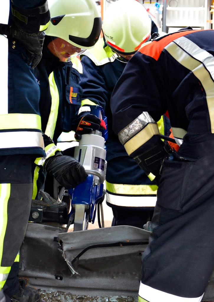 So wurde neben der Einrichtung von Zugängen unter Zuhilfenahme der klassischen Werkzeuge wie Rettungsschere und Rettungsspreizer auch die entsprechende Rettung von Personen aus dem Bus mit Trage geschult. Entgegen erster Vermutungen war die Schaffung von Zugängen in den Bus baulich bedingt doch keine leichte Aufgabe, so dass auch mit Trennschneider und Rettungszylinder gearbeitet werden musste.