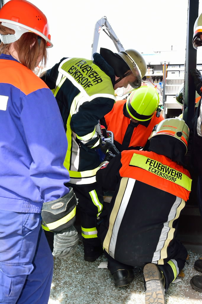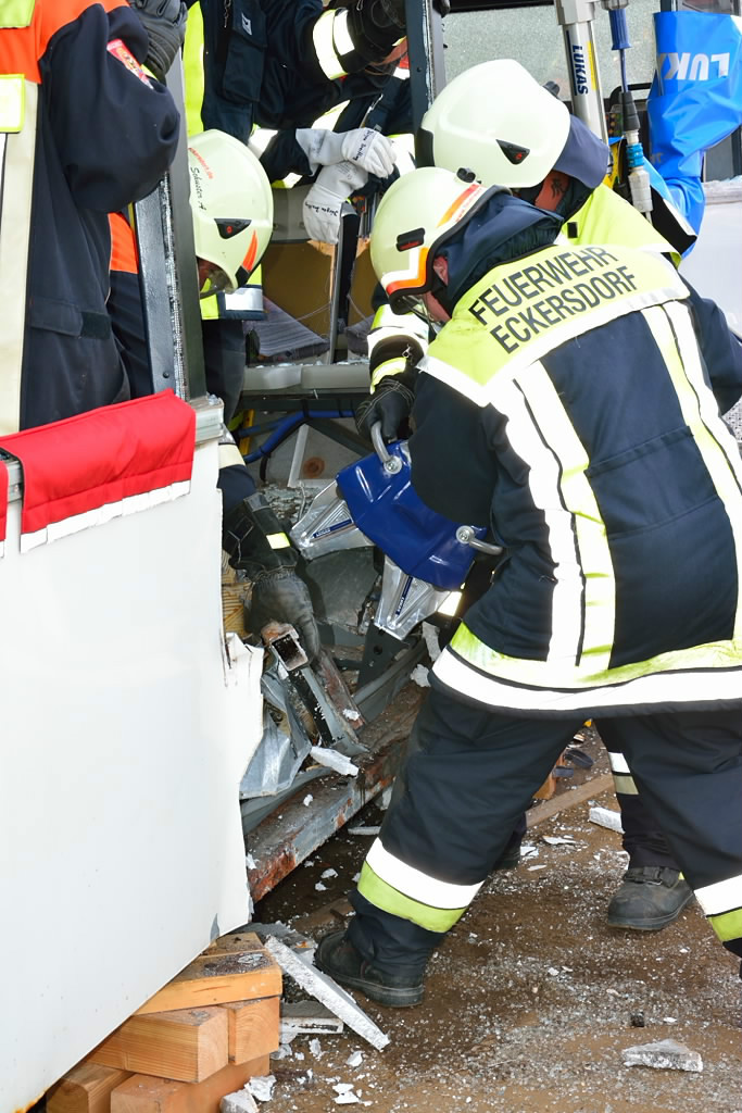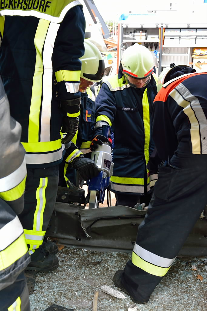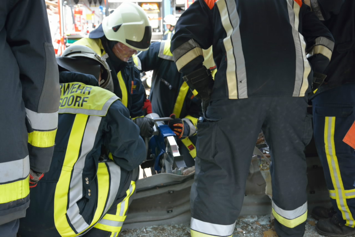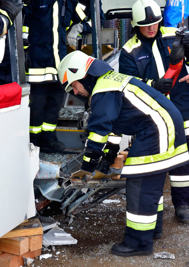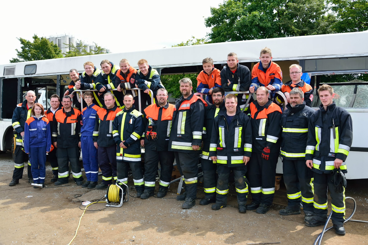 So wurde neben der Einrichtung von Zugängen unter Zuhilfenahme der klassischen Werkzeuge wie Rettungsschere und Rettungsspreizer auch die entsprechende Rettung von Personen aus dem Bus mit Trage geschult. Entgegen erster Vermutungen war die Schaffung von Zugängen in den Bus baulich bedingt doch keine leichte Aufgabe, so dass auch mit Trennschneider und Rettungszylinder gearbeitet werden musste.