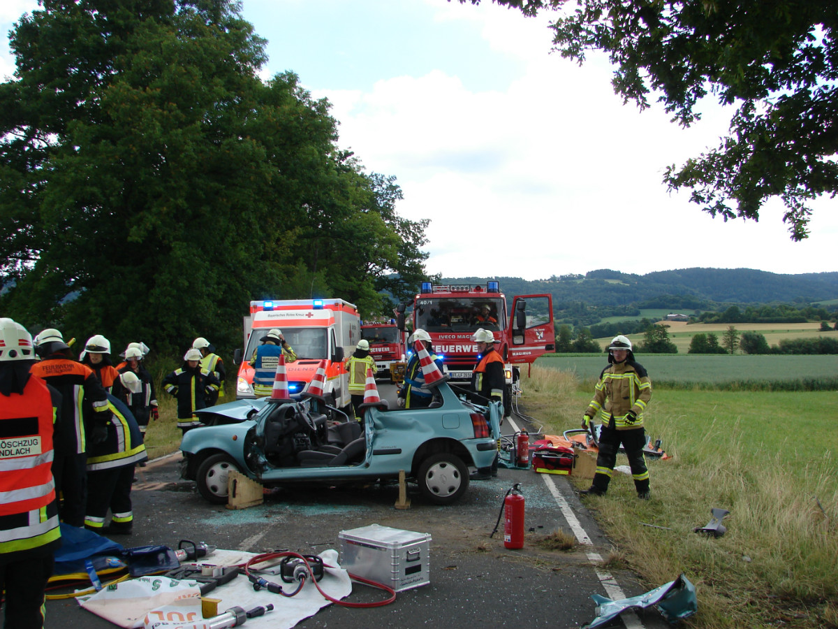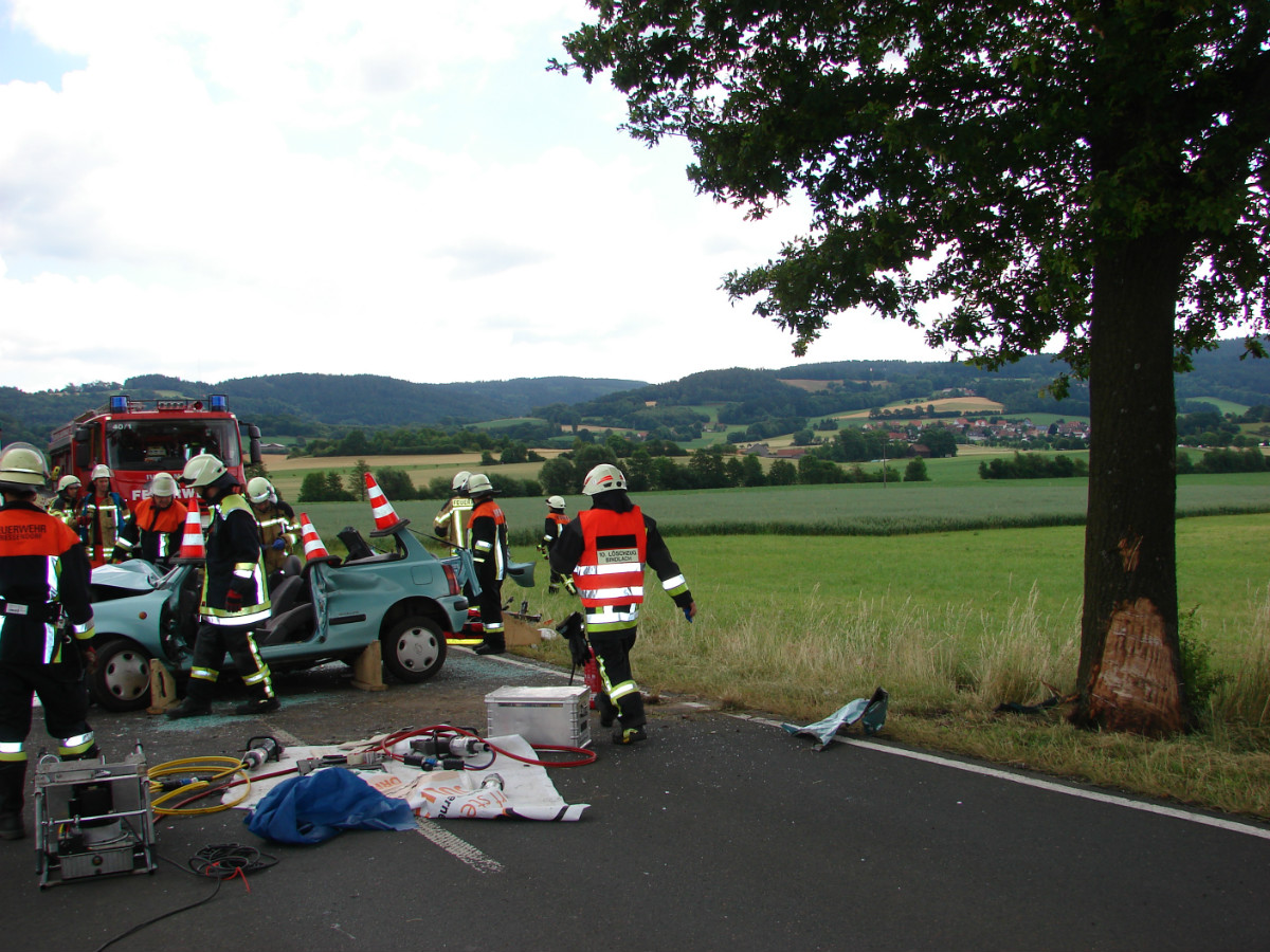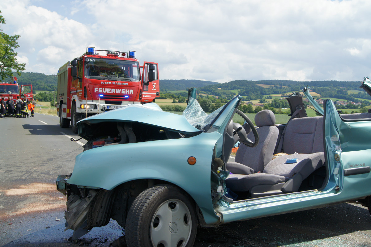 Die Meldung einer nach Verkehrsunfall eingeklemmten Person bestätigte sich beim Eintreffen der ersten Rettungskräfte. Der Mann, der allein in seinem Fahrzeug in Richtung Goldkronach unterwegs war, war gegen einen Baum geprallt und wurde schwer eingeklemmt. Mit zwei Rettungssätzen wurde die verletzte Person befreit und schonend aus dem Fahrzeug gerettet.