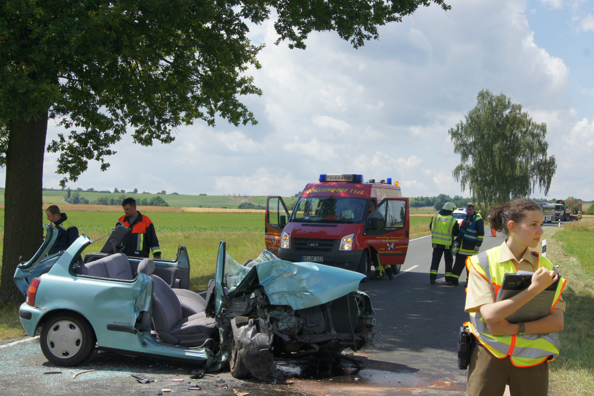 Zu einem schweren Verkehrsunfall auf der Staatsstraße 2163 zwischen Dressendorf und Goldkronach wurden am späten Vormittag des 01.07.2014 die Freiwilligen Feuerwehren Dressendorf sowie der Löschzug Goldkronach-Nemmersdorf alarmiert. Auch die Freiwillige Feuerwehr Bindlach, die sich zum Zeitpunkt der Alarmierung bei der Beseitigung einer Ölspur am Bindlacher Berg aufhielt, rückte sofort aus zur Einsatzstelle nahe Dressendorf.