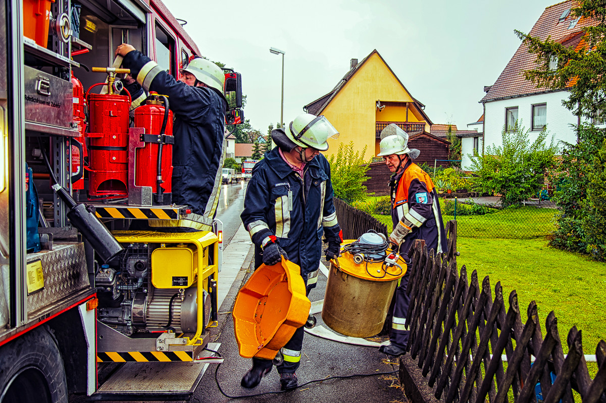 Gewitter mit Starkregen, Sturmböen und Hagel bescheren den Feuerwehrleuten des Landkreises Bayreuth derzeit gehörig nasse Arbeit. Bereits am Sonntag waren die Gebiete rund um Waischenfeld und Hollfeld von stärkerem Niederschlag betroffen. Einige Keller standen unter Wasser, Straßen wurden durch die Regenschauer überschwemmt und mit Geröll verunreinigt. Mehrere Gullys wurden durch den Wasserdruck aufgeschwemmt. Ein ähnliches Bild zeigte sich auch ab Montagnachmittag. In den Bereichen um Heinersreuth, Mistelbach, Eckersdorf, Creußen und Schamelsberg waren die Feuerwehren hauptsächlich aktiv, um vollgelaufene Keller auszupumpen, Straßen zu reinigen und umgestürzte Bäume zu beseitigen.