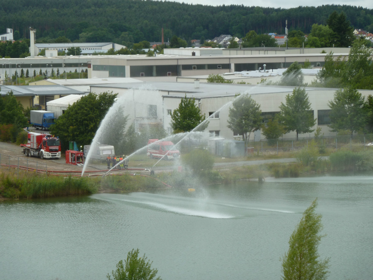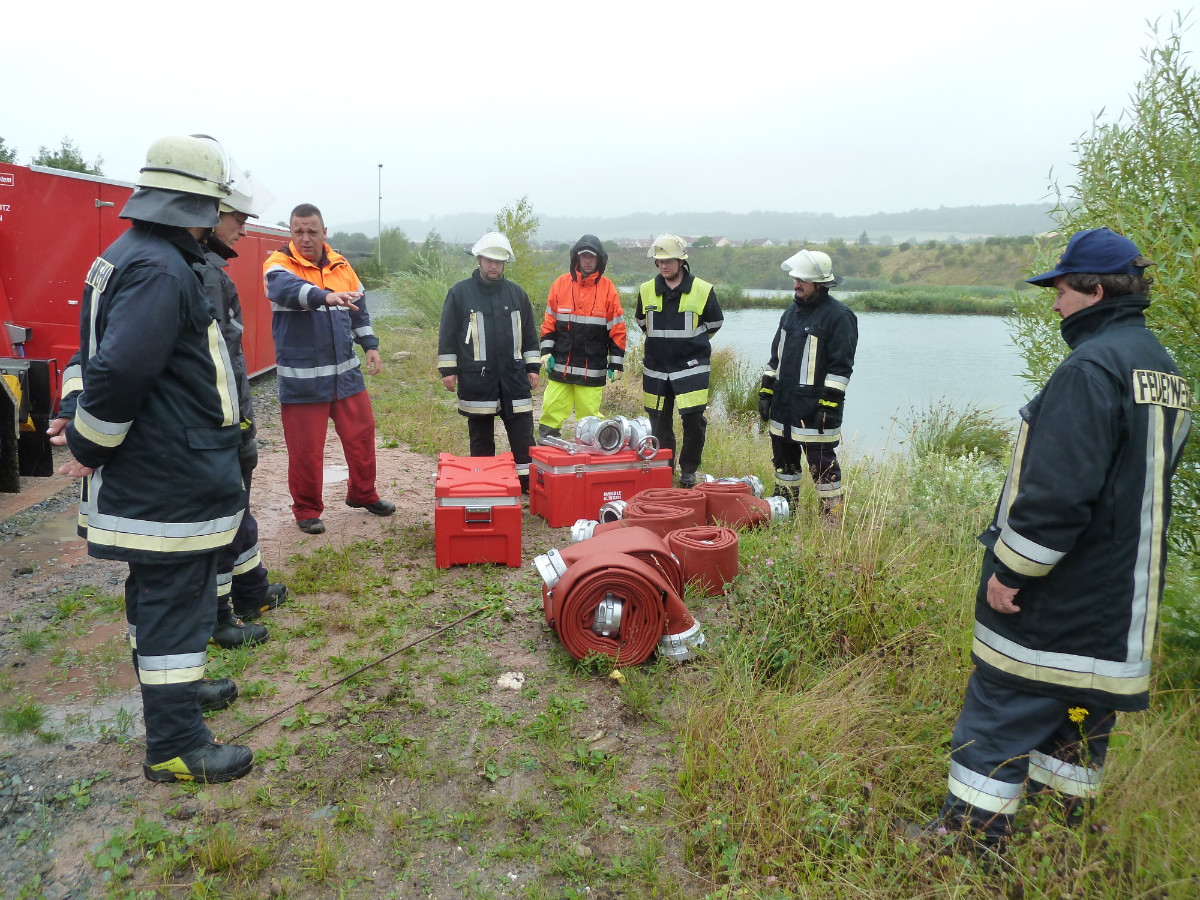 Im Juli 2014 wurden schließlich sieben Kameraden der Feuerwehr Speichersdorf von der Firma Hytrans System für den Abrollbehälter geschult. Um die Schulung auch im praktischen Bereich richtig üben zu können, musste man nach Bindlach an die dortigen Kiesweiher – bei einer Förderleistung von 8000 Litern Wasser in der Minute ist ein großes Gewässer Voraussetzung. Auch KBR Schreck ließ es sich nicht nehmen und beobachtete die Einweisung mit großem Interesse.