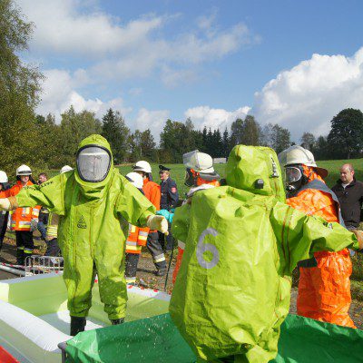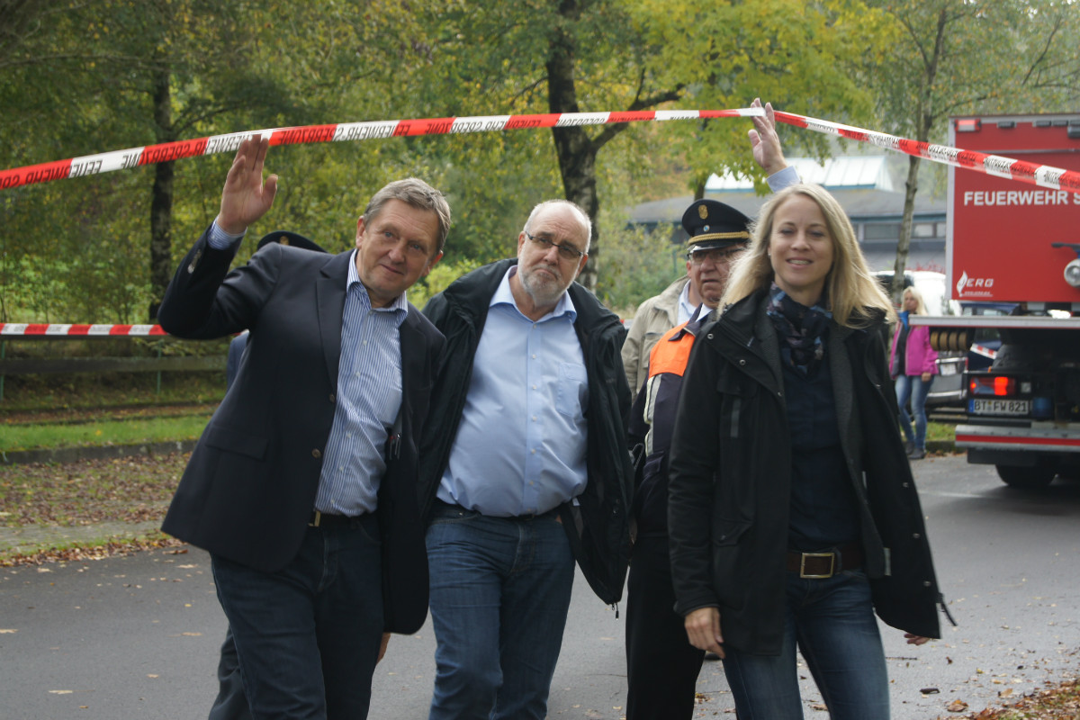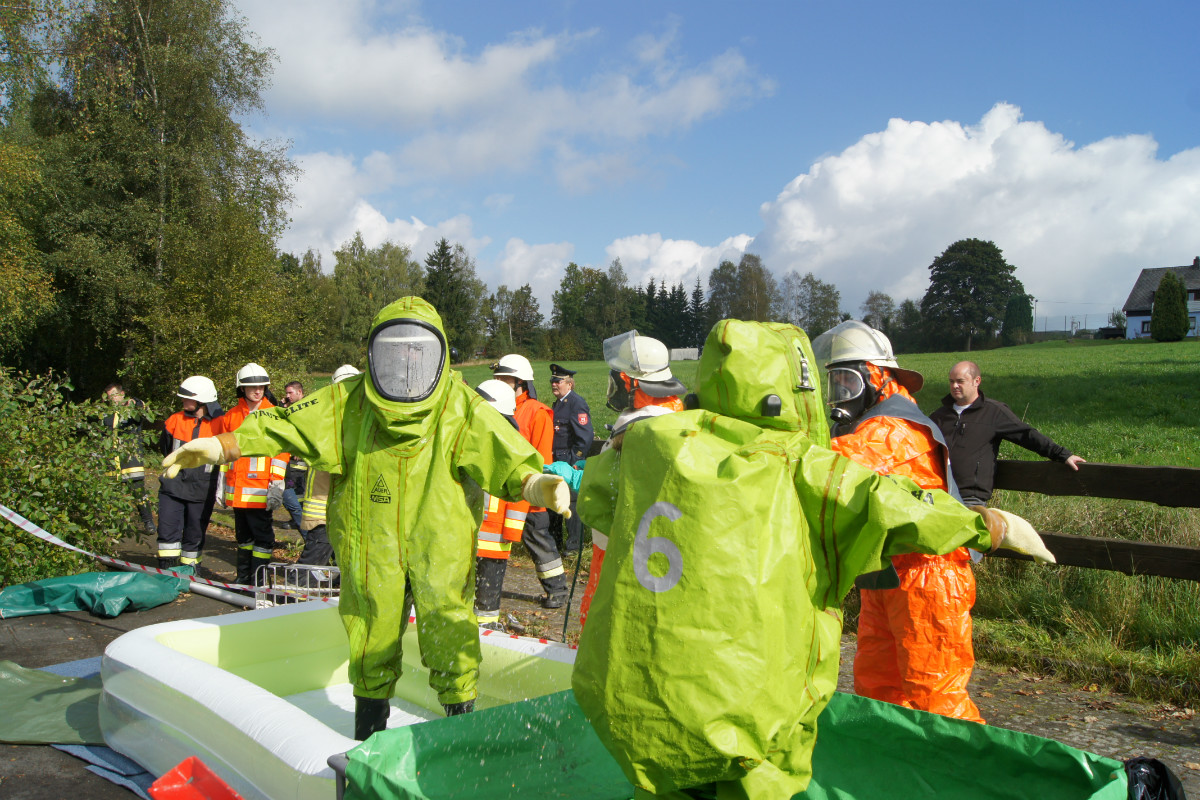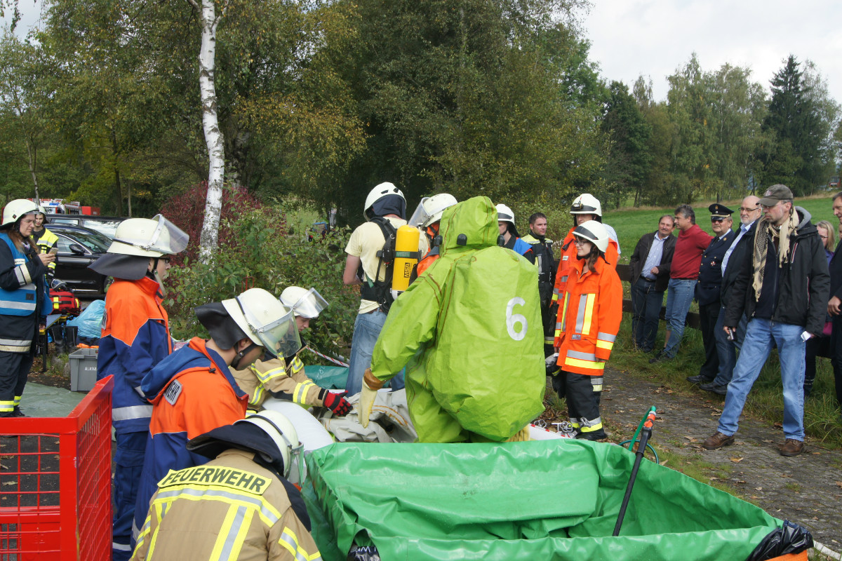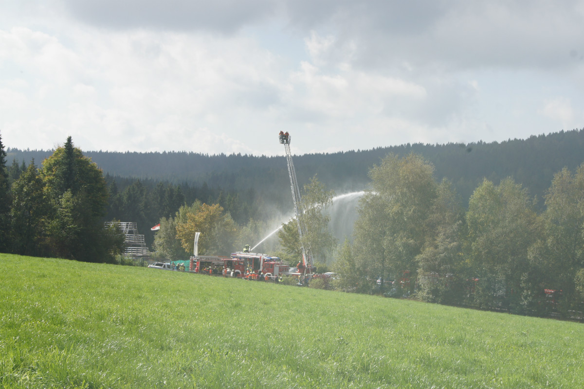 Zugegebenermaßen mag man sich ein derartiges Schadensereignis in der Realität gar nicht vorstellen. Umso wichtiger ist es jedoch, solches einmal fiktiv abzuarbeiten. Rund 220 Kräfte, darunter allein 30 vom Rettungsdienst des Bayerischen Roten Kreuzes, stellten sich am Samstag Vormittag folgender Ausgangslage: „Explosion im Technikraum des Schwimmbades Bischofsgrün, Brandausbreitung im Gebäude und der Wärmehalle. Achtung, es ist mit Chlorgasaustritt zu rechnen. Es gibt viele verletzte Personen.“ Gearbeitet wurde möglichst realitätsgetreu. Unter den Augen zahlreicher Zuschauer, unter ihnen Landrat Hermann Hübner, Oberregierungsrätin Sabine Kerner, stellvertretender Kreisbrandrat, KBI Adolf Mendel, Bürgermeister Stephan Unglaub und weiterer Bürgermeister, Gemeinde- und Kreisräte zeigten die Ehrenamtlichen ihre Kompetenz und Schlagkraft. Eingeteilt in die Einsatzabschnitte „Personenrettung aus dem Funktionsgebäude und Wärmehalle bei gleichzeitiger Abschirmung der eigenen Kräfte“, „Gefahrgut mit Beseitigung von Chlorgasflaschen, Chlorgasgranulat, Natronlauge und Salzsäure“, „Aufbau Wasserförderung von einer B-Leitung vom 600 Meter entfernten Hydranten mit Brandbekämpfung“, „Aufbau Wasserförderung einer B-Leitung vom 700 Meter entfernten Löschwasserteich am Tennisplatz / Versorgung der Drehleiter zur Niederschlagung der Dämpfe bei eventuellem Chlorgasaustritt“, sowie „Verletztentransport und Betreuung durch Feuerwehr und BRK“, hatten die Helfer alle Hände voll zu tun.
