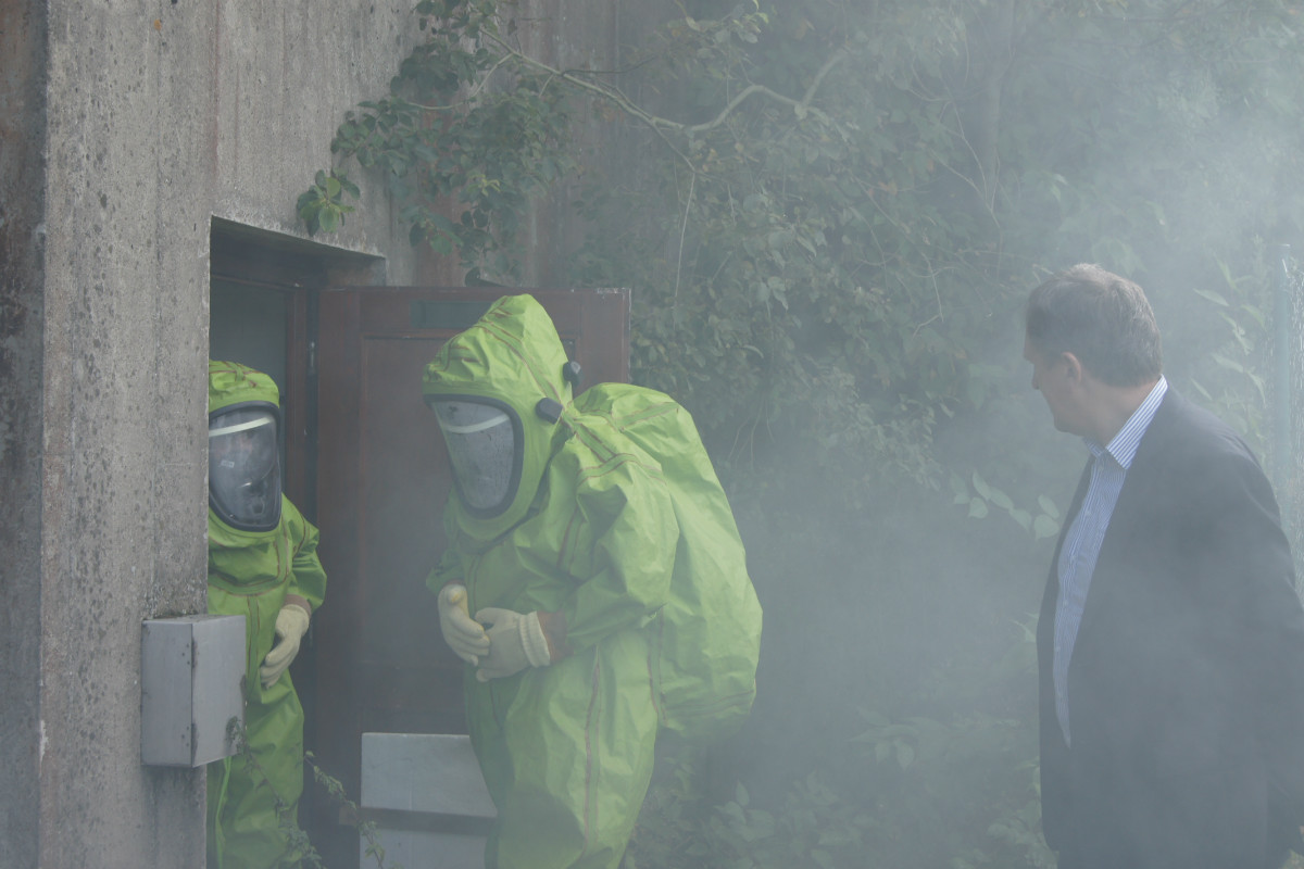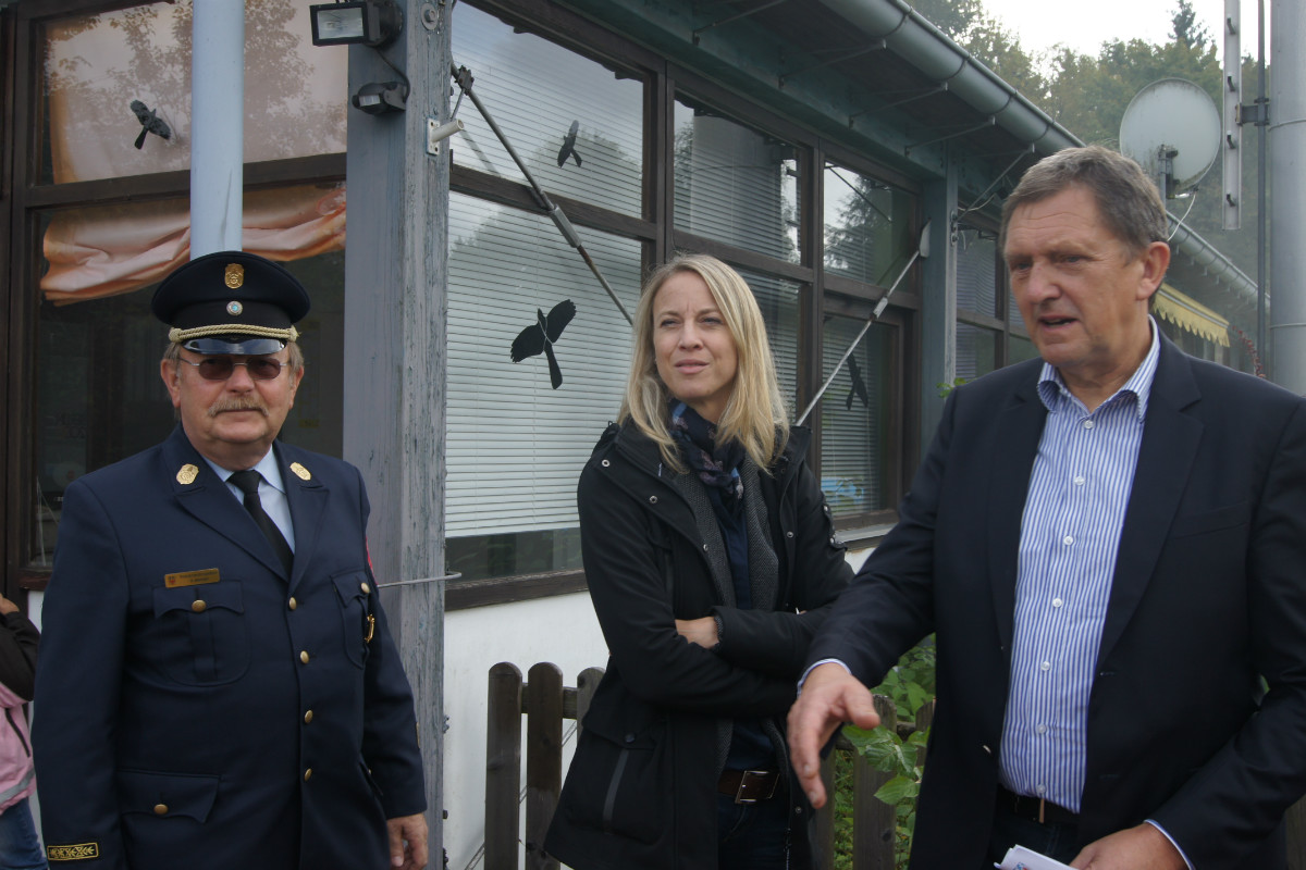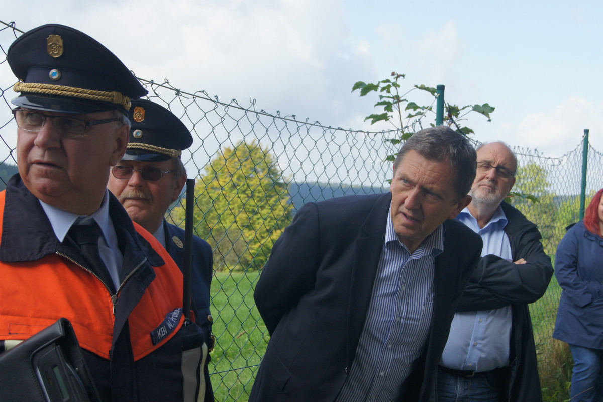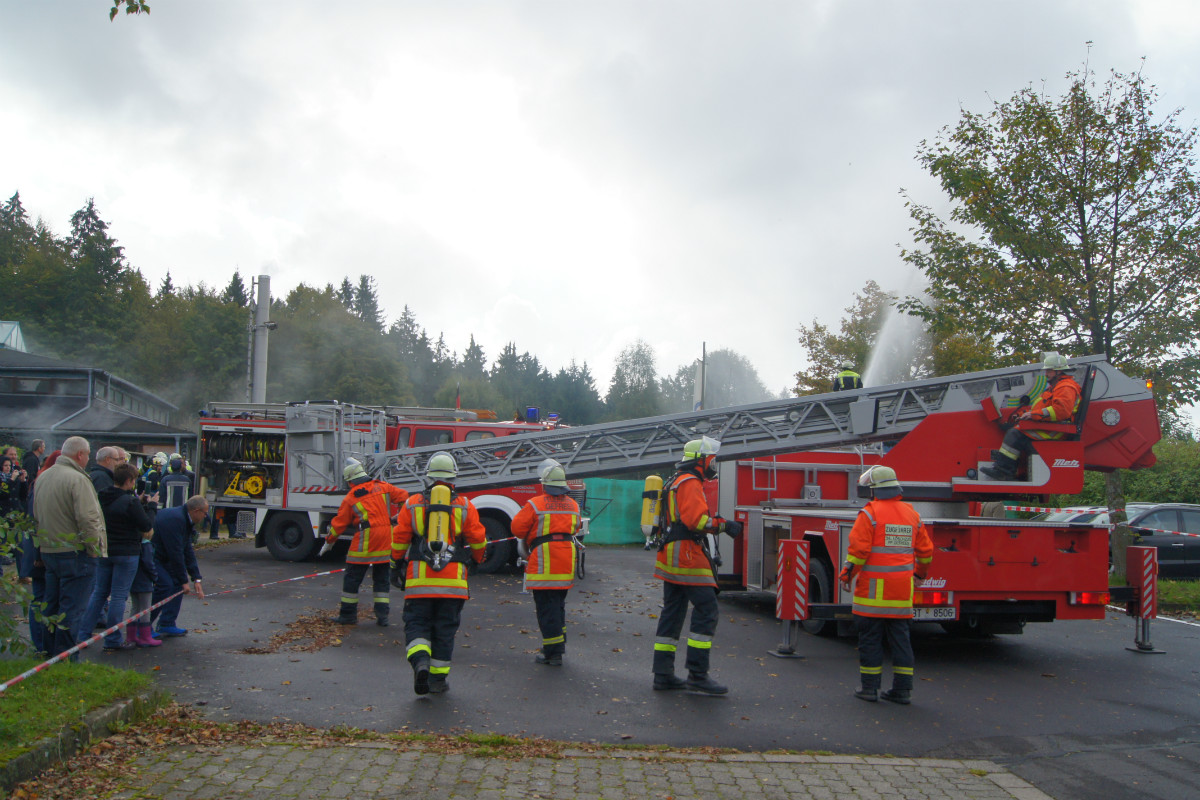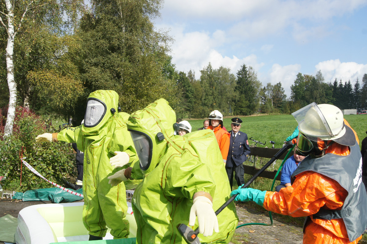 Zugegebenermaßen mag man sich ein derartiges Schadensereignis in der Realität gar nicht vorstellen. Umso wichtiger ist es jedoch, solches einmal fiktiv abzuarbeiten. Rund 220 Kräfte, darunter allein 30 vom Rettungsdienst des Bayerischen Roten Kreuzes, stellten sich am Samstag Vormittag folgender Ausgangslage: „Explosion im Technikraum des Schwimmbades Bischofsgrün, Brandausbreitung im Gebäude und der Wärmehalle. Achtung, es ist mit Chlorgasaustritt zu rechnen. Es gibt viele verletzte Personen.“ Gearbeitet wurde möglichst realitätsgetreu. Unter den Augen zahlreicher Zuschauer, unter ihnen Landrat Hermann Hübner, Oberregierungsrätin Sabine Kerner, stellvertretender Kreisbrandrat, KBI Adolf Mendel, Bürgermeister Stephan Unglaub und weiterer Bürgermeister, Gemeinde- und Kreisräte zeigten die Ehrenamtlichen ihre Kompetenz und Schlagkraft. Eingeteilt in die Einsatzabschnitte „Personenrettung aus dem Funktionsgebäude und Wärmehalle bei gleichzeitiger Abschirmung der eigenen Kräfte“, „Gefahrgut mit Beseitigung von Chlorgasflaschen, Chlorgasgranulat, Natronlauge und Salzsäure“, „Aufbau Wasserförderung von einer B-Leitung vom 600 Meter entfernten Hydranten mit Brandbekämpfung“, „Aufbau Wasserförderung einer B-Leitung vom 700 Meter entfernten Löschwasserteich am Tennisplatz / Versorgung der Drehleiter zur Niederschlagung der Dämpfe bei eventuellem Chlorgasaustritt“, sowie „Verletztentransport und Betreuung durch Feuerwehr und BRK“, hatten die Helfer alle Hände voll zu tun.