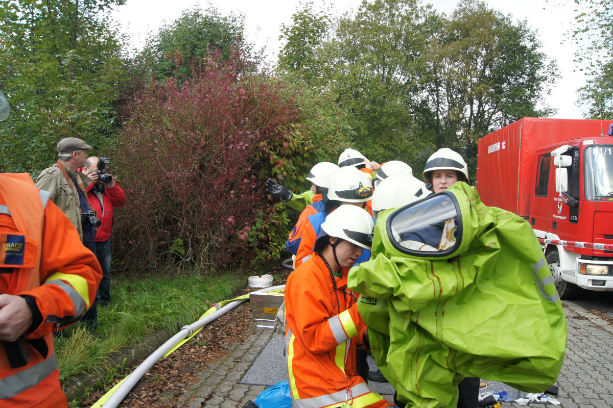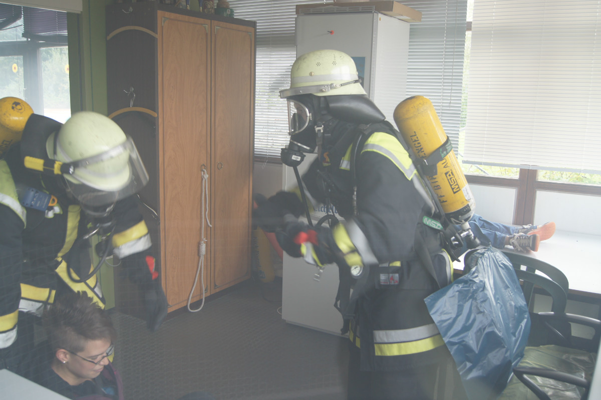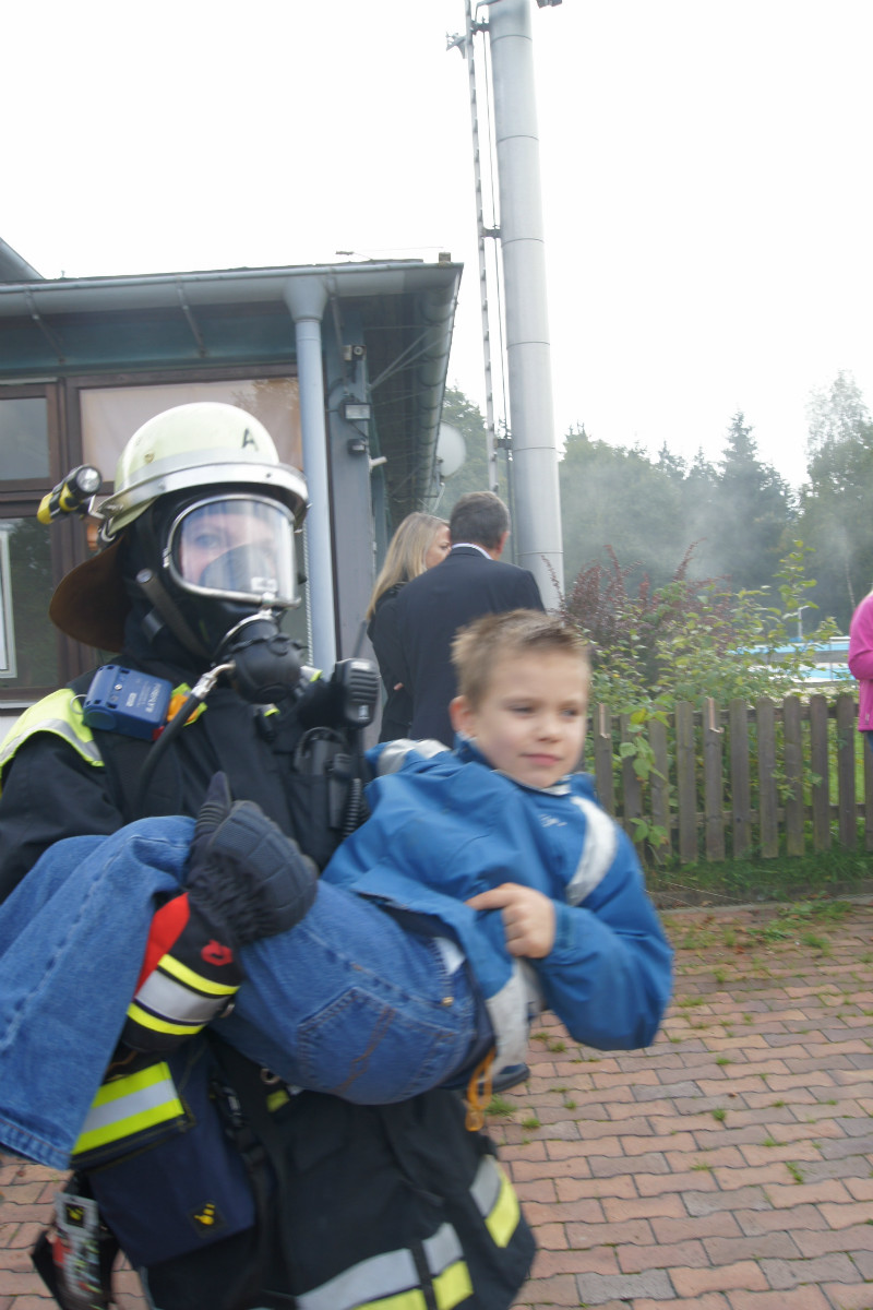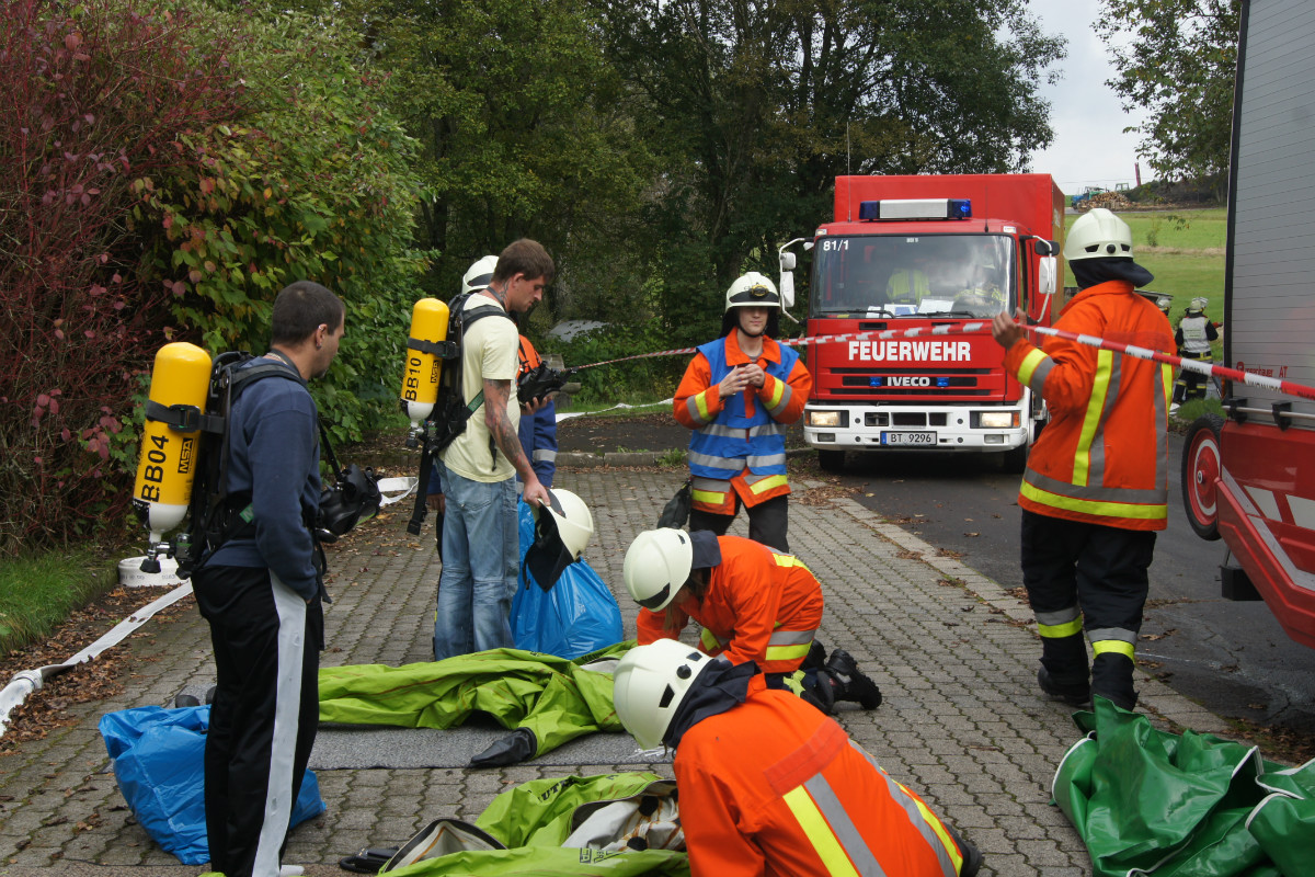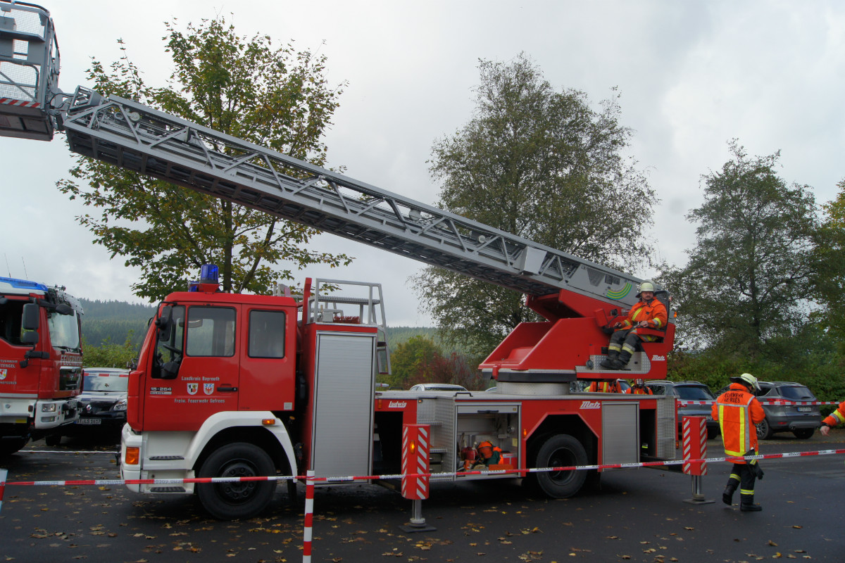 Zugegebenermaßen mag man sich ein derartiges Schadensereignis in der Realität gar nicht vorstellen. Umso wichtiger ist es jedoch, solches einmal fiktiv abzuarbeiten. Rund 220 Kräfte, darunter allein 30 vom Rettungsdienst des Bayerischen Roten Kreuzes, stellten sich am Samstag Vormittag folgender Ausgangslage: „Explosion im Technikraum des Schwimmbades Bischofsgrün, Brandausbreitung im Gebäude und der Wärmehalle. Achtung, es ist mit Chlorgasaustritt zu rechnen. Es gibt viele verletzte Personen.“ Gearbeitet wurde möglichst realitätsgetreu. Unter den Augen zahlreicher Zuschauer, unter ihnen Landrat Hermann Hübner, Oberregierungsrätin Sabine Kerner, stellvertretender Kreisbrandrat, KBI Adolf Mendel, Bürgermeister Stephan Unglaub und weiterer Bürgermeister, Gemeinde- und Kreisräte zeigten die Ehrenamtlichen ihre Kompetenz und Schlagkraft. Eingeteilt in die Einsatzabschnitte „Personenrettung aus dem Funktionsgebäude und Wärmehalle bei gleichzeitiger Abschirmung der eigenen Kräfte“, „Gefahrgut mit Beseitigung von Chlorgasflaschen, Chlorgasgranulat, Natronlauge und Salzsäure“, „Aufbau Wasserförderung von einer B-Leitung vom 600 Meter entfernten Hydranten mit Brandbekämpfung“, „Aufbau Wasserförderung einer B-Leitung vom 700 Meter entfernten Löschwasserteich am Tennisplatz / Versorgung der Drehleiter zur Niederschlagung der Dämpfe bei eventuellem Chlorgasaustritt“, sowie „Verletztentransport und Betreuung durch Feuerwehr und BRK“, hatten die Helfer alle Hände voll zu tun.