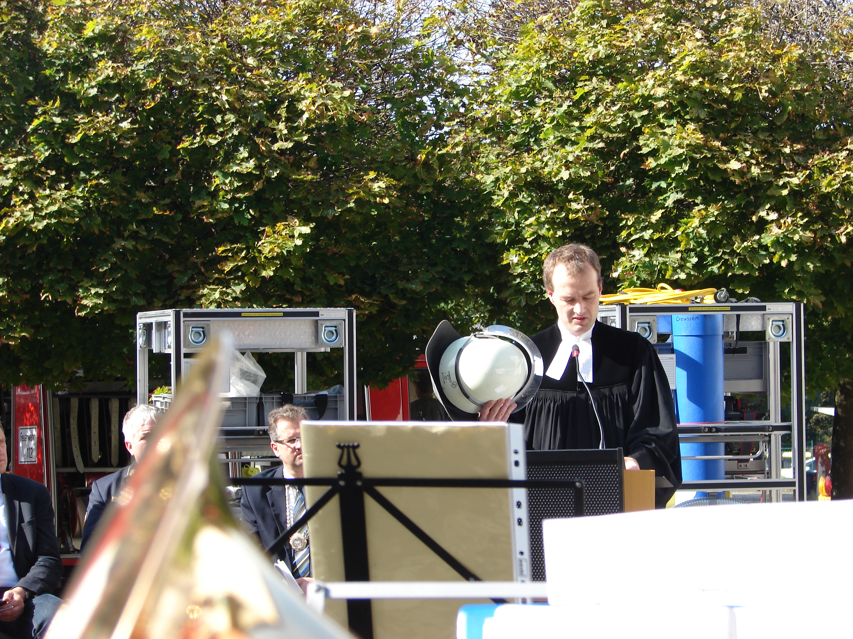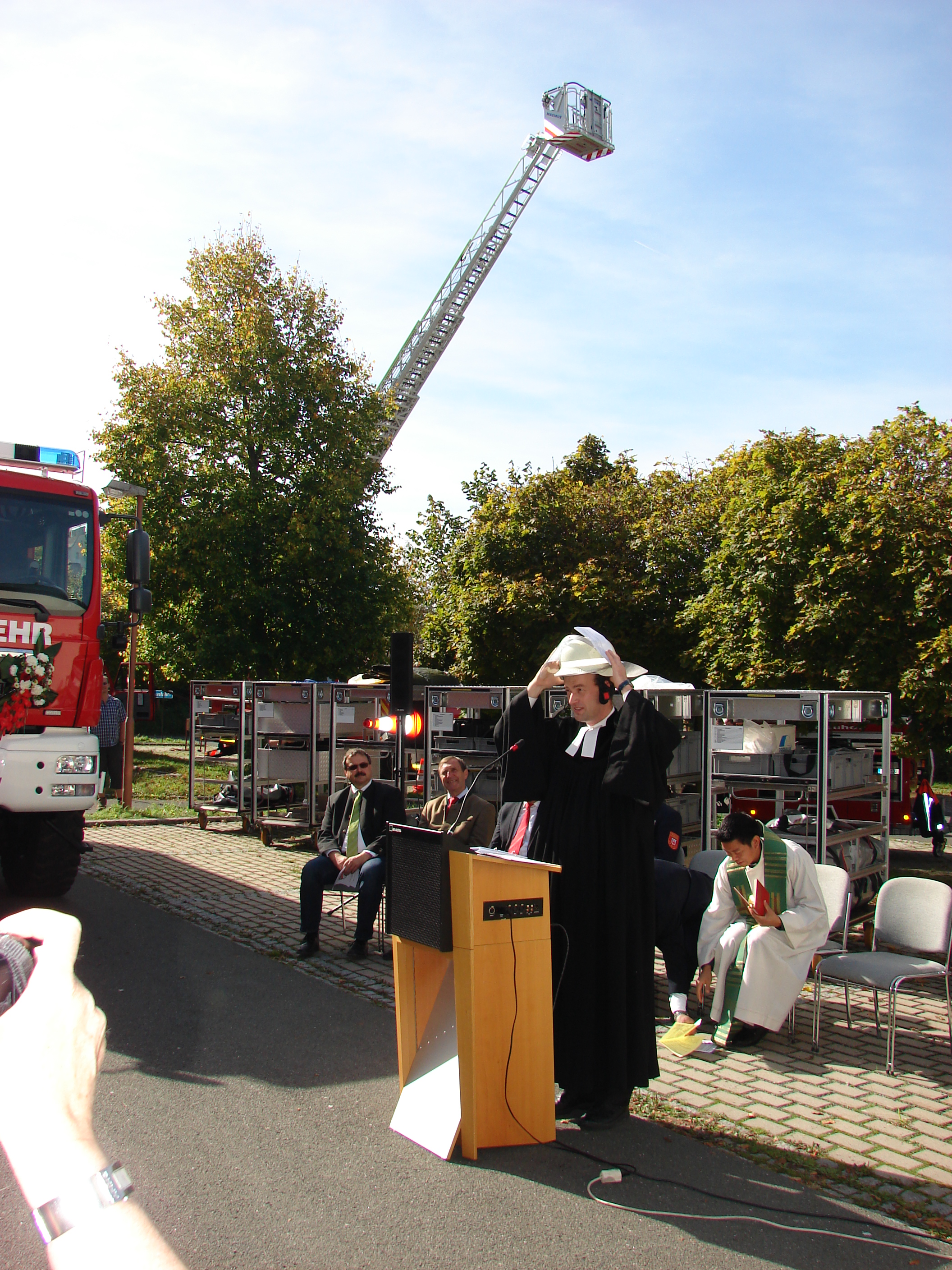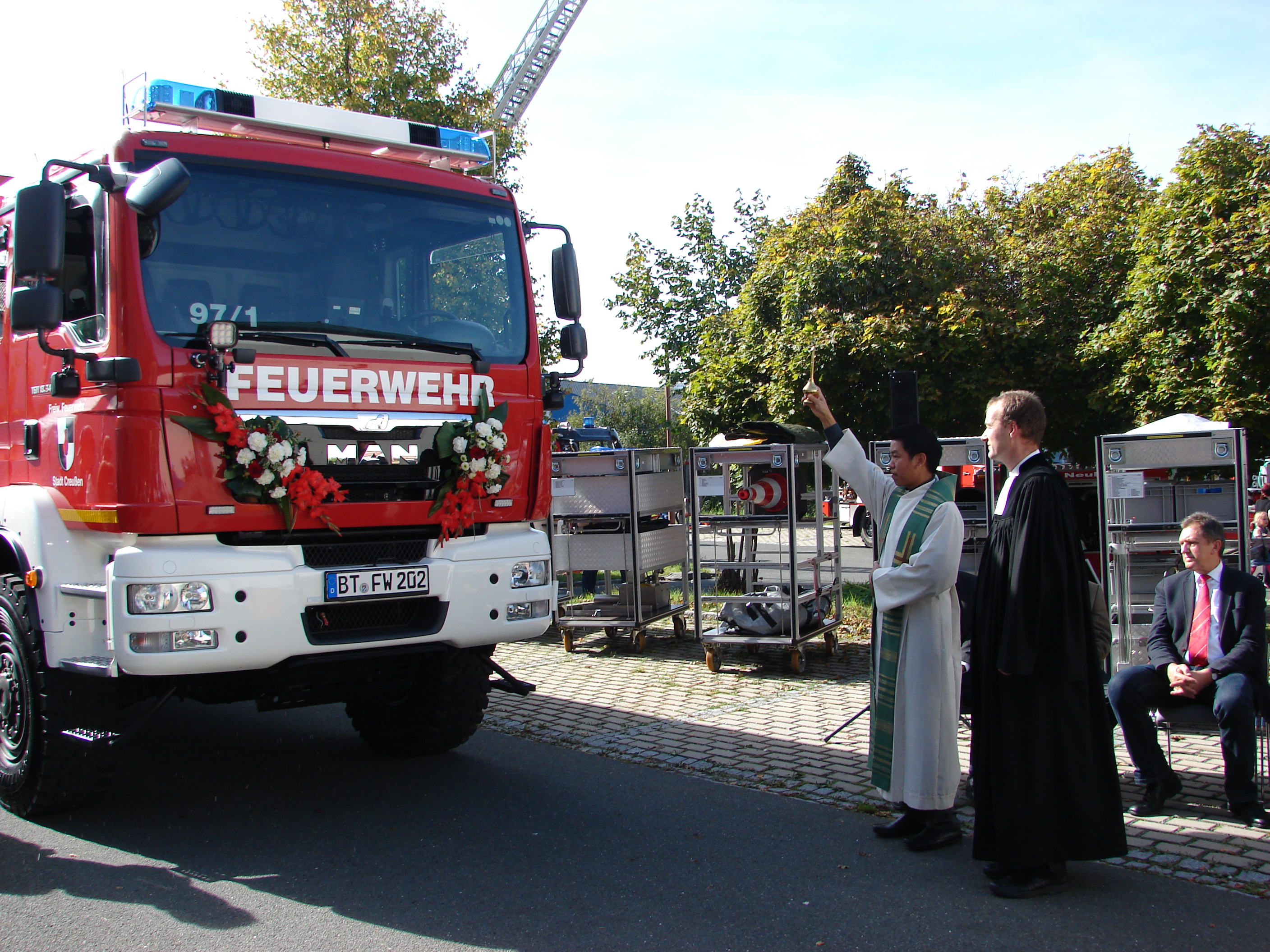 Eingebettet in den Stadtfeuerwehrtag, zu der elf Wehren des Stadtgebiets mit rund 325 Aktiven, 30 Jugendlichen und einer Kinderfeuerwehr gehören, hatten sich zahlreiche Gäste, darunter MdL Dr. Christoph Rabenstein und der stellvertretende Landtagsvizepräsident, MdL Peter Meyer sowie zahlreiche befreundete Wehren aus dem Umkreis zu der feierlichen Übergabe an der Mehrzweckhalle eingefunden. Bei strahlendem Sonnenschein, musikalisch umrahmt vom Posaunenchor, segneten Pater Samuel und Pfarrer Achim Peter Fahrzeug und Mannschaft.