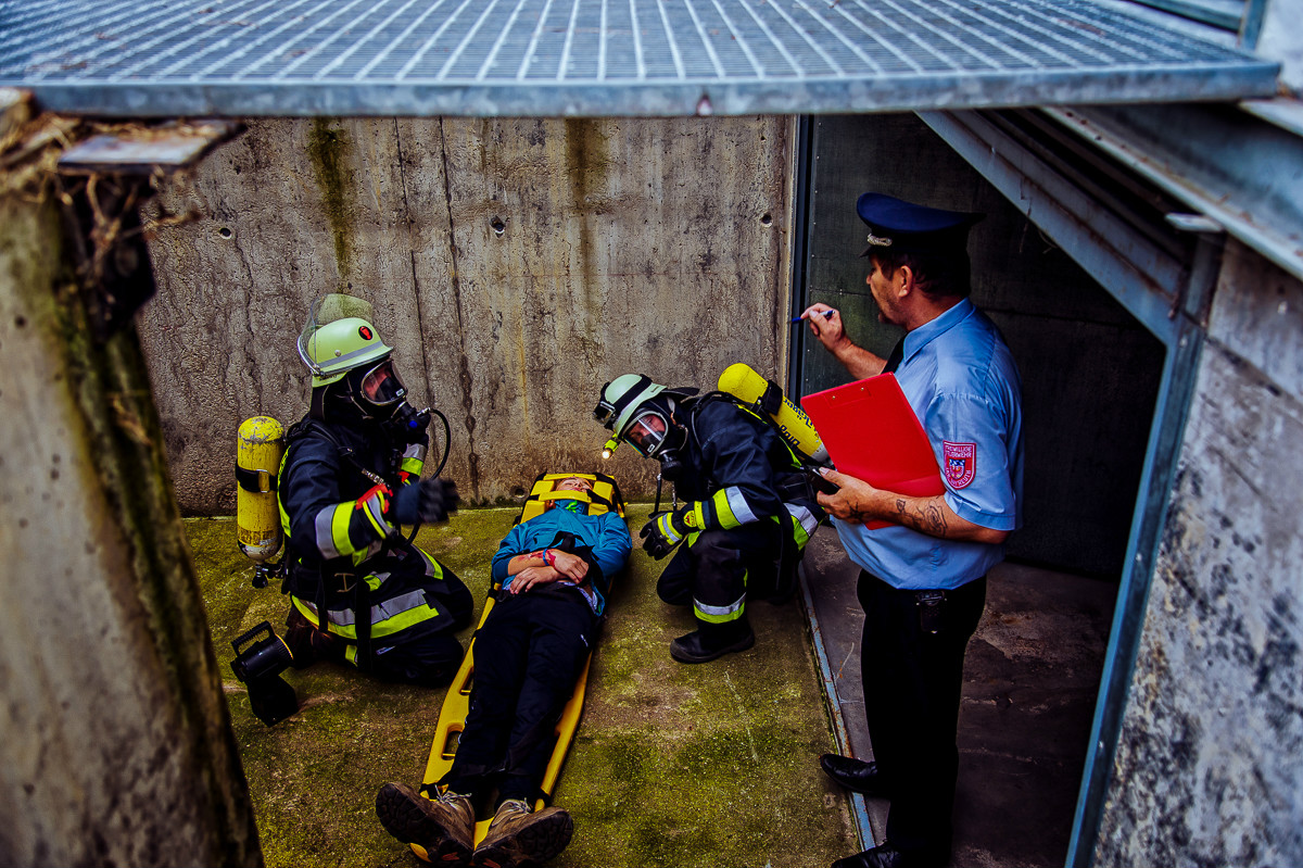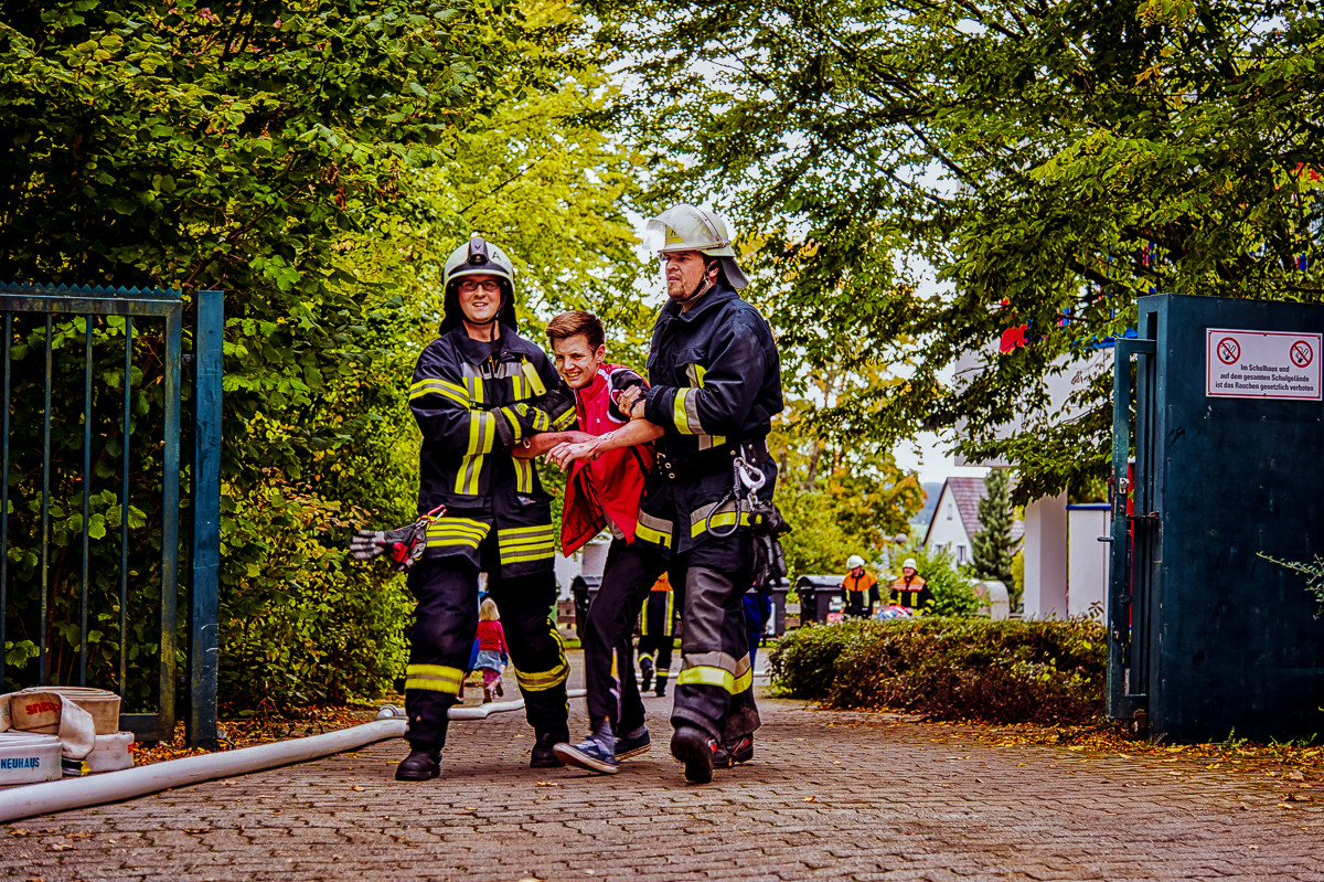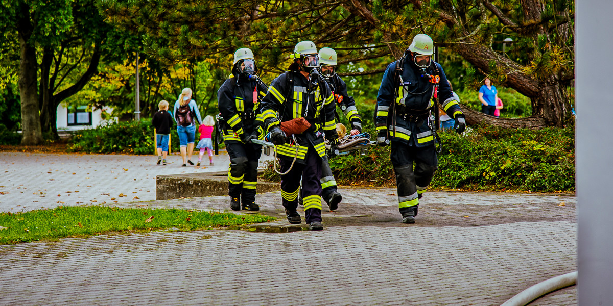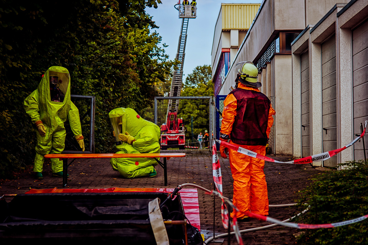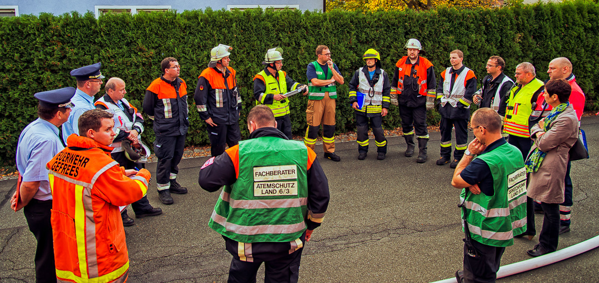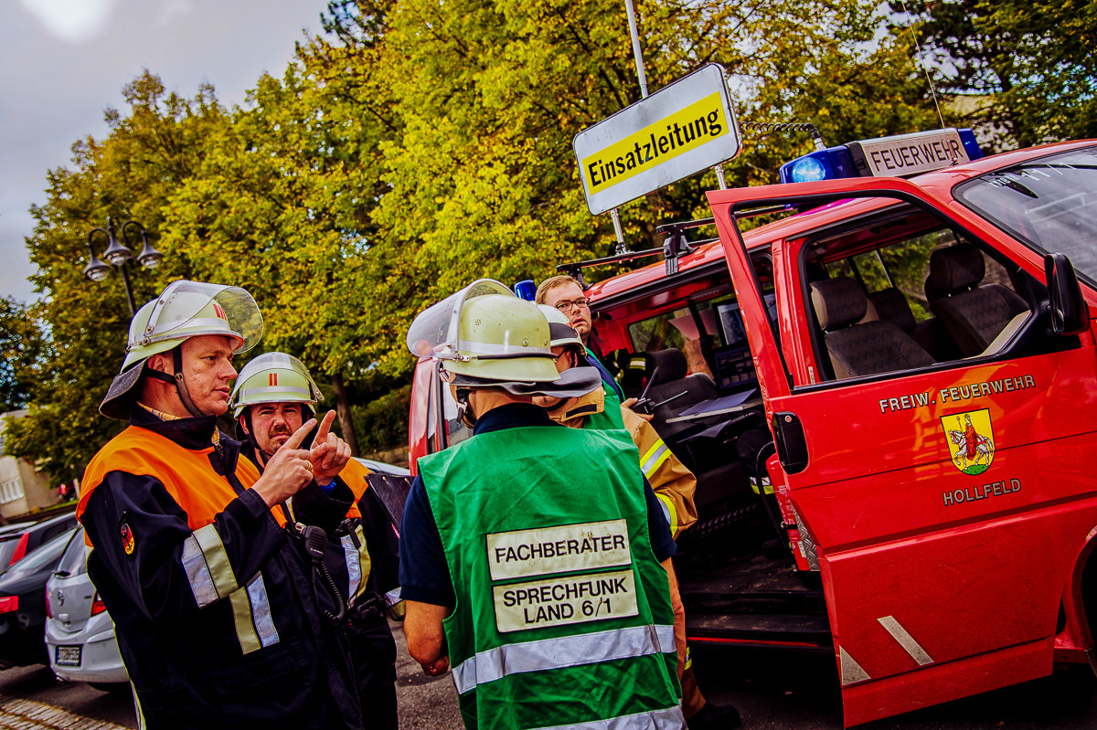 Insgesamt 225 Feuerwehrleute, darunter nicht weniger als 40 Träger von schweren Atemschutzgeräten und rund 20 Kräfte des Malteser Hilfsdienstes Waischenfeld kamen am Samstag (27.09.2014) im Zuge der Inspektionsübung des westlichen Landkreises Bayreuth rund um die Gesamtschule Hollfeld gehörig ins Schwitzen. Das anspruchsvolle Übungsszenario sah vor, dass eine durch Schweißarbeiten ausgelöste Explosion zu einem Brand im Hallenbad führt und giftiges Chlorgas austritt. Absolute Priorität hatte dabei das Auffinden und Versorgen von 20 verletzten Personen. Weitere Schwerpunkte waren neben der Brandbekämpfung der Aufbau einer ausreichenden Wasserversorgung und das Eindämmen der austretenden Gefahrstoffe. Die Unterstützungsgruppe Örtliche Einsatzleitung stand dem Einsatzleiter Kreisbrandmeister Mario Scholz tatkräftig zur Seite. Unter den Augen zahlreicher Zuschauer, darunter Schulleiterin Christina Scharfenberg, Bürgermeisterin Karin Barwisch und stellvertretende Landrätin Christa Reinert-Heinz demonstrierten die Rettungskräfte eine ebenso professionelle wie effektive Vorgehensweise.