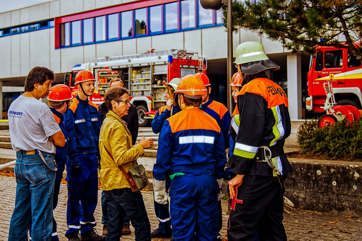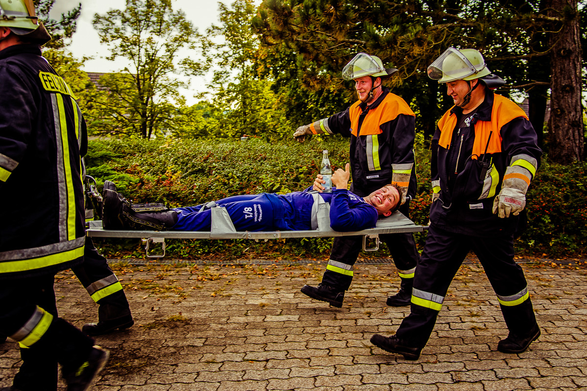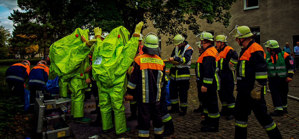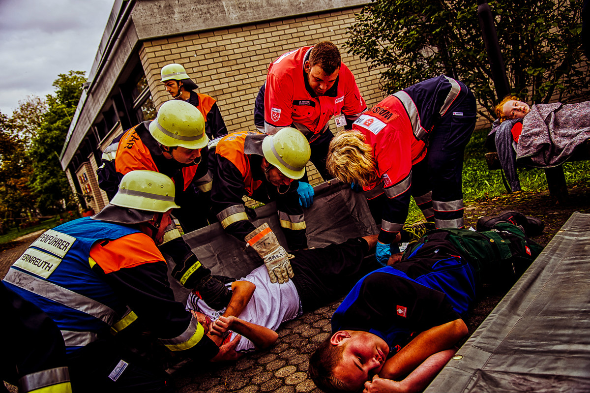 Insgesamt 225 Feuerwehrleute, darunter nicht weniger als 40 Träger von schweren Atemschutzgeräten und rund 20 Kräfte des Malteser Hilfsdienstes Waischenfeld kamen am Samstag (27.09.2014) im Zuge der Inspektionsübung des westlichen Landkreises Bayreuth rund um die Gesamtschule Hollfeld gehörig ins Schwitzen. Das anspruchsvolle Übungsszenario sah vor, dass eine durch Schweißarbeiten ausgelöste Explosion zu einem Brand im Hallenbad führt und giftiges Chlorgas austritt. Absolute Priorität hatte dabei das Auffinden und Versorgen von 20 verletzten Personen. Weitere Schwerpunkte waren neben der Brandbekämpfung der Aufbau einer ausreichenden Wasserversorgung und das Eindämmen der austretenden Gefahrstoffe. Die Unterstützungsgruppe Örtliche Einsatzleitung stand dem Einsatzleiter Kreisbrandmeister Mario Scholz tatkräftig zur Seite. Unter den Augen zahlreicher Zuschauer, darunter Schulleiterin Christina Scharfenberg, Bürgermeisterin Karin Barwisch und stellvertretende Landrätin Christa Reinert-Heinz demonstrierten die Rettungskräfte eine ebenso professionelle wie effektive Vorgehensweise.