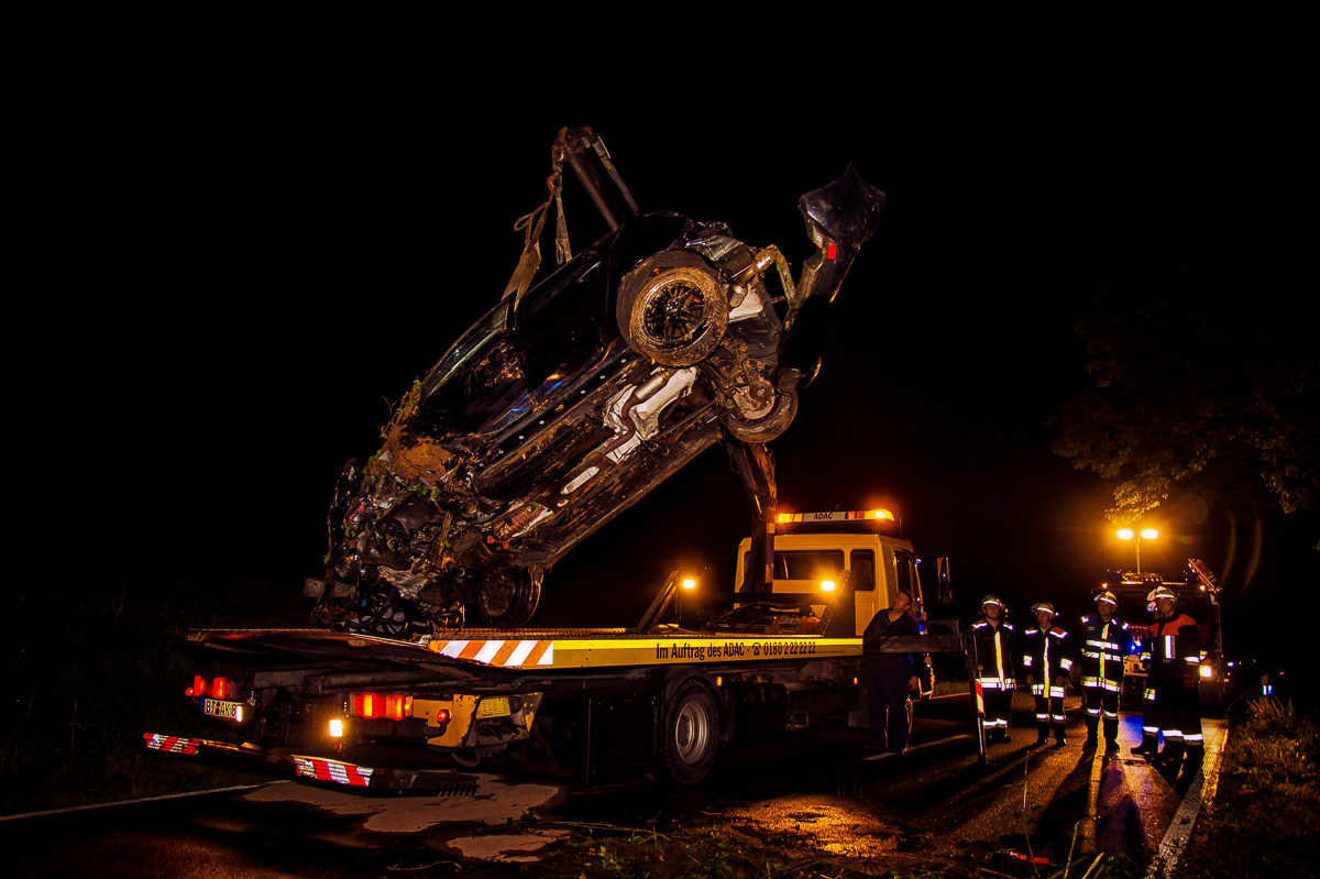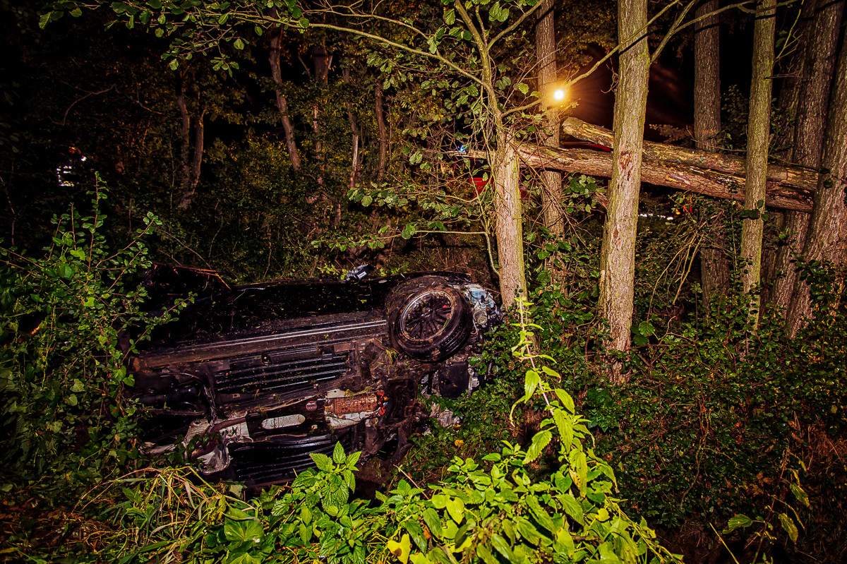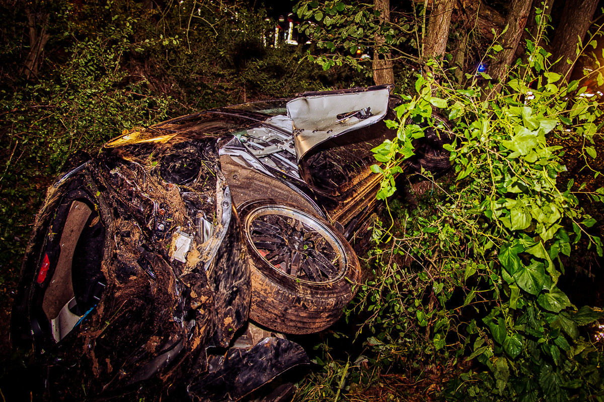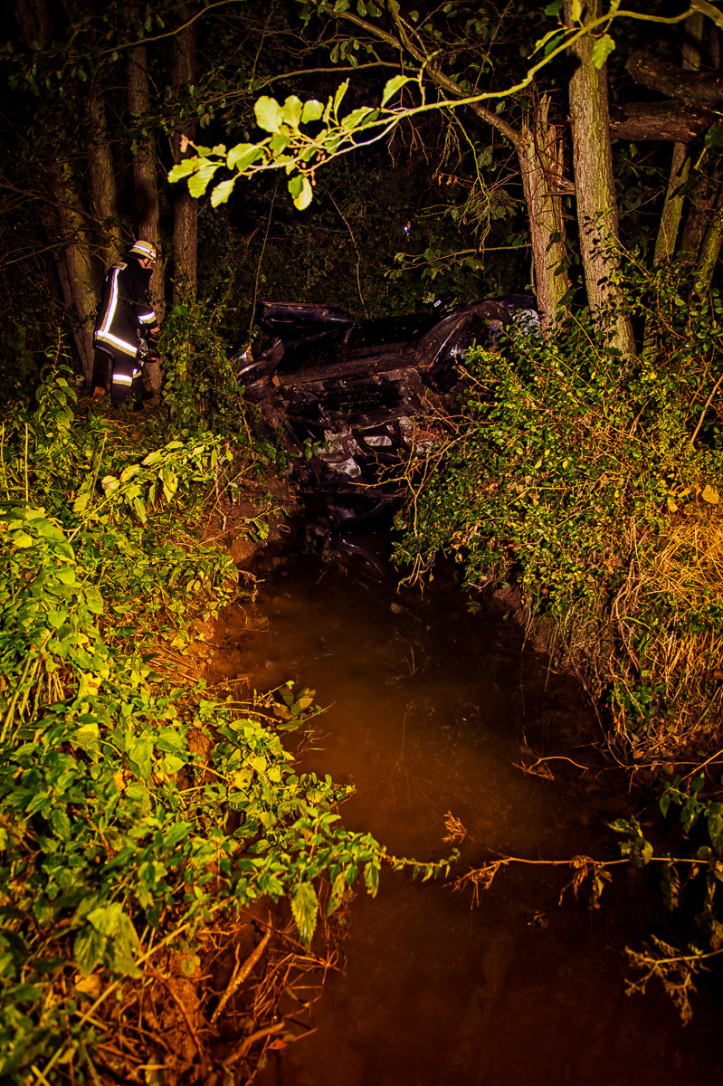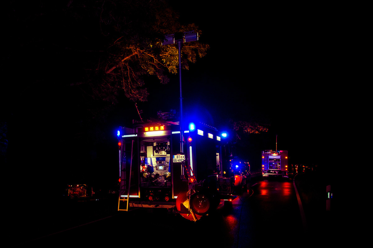 Kurz vor 01 Uhr alarmierte die Integrierte Leitstelle Bayreuth/Kulmbach am 27.09.2014 die Feuerwehren Frankenhaag, Mistelgau und Glashütten zu einem schweren Verkehrsunfall auf der BT1 zwischen Obernsees und Frankenhaag. Aus bislang unklaren Gründen kam der Lenker eines Mazda kurz vor dem Ortseingang von Frankenhaag von der Straße ab, prallte gegen einen Baum und rutschte dann einen stark bewachsenen Abhang hinab, bis das Fahrzeug auf die Fahrerseite gedreht über einem Bach liegen blieb. Der Fahrer wurde dabei nach erster Einschätzung wohl mittelschwer verletzt; um ihn sowie um weitere Angehörige kümmerten sich die Rettungskräfte des Bayerischen Roten Kreuzes sowie des Helfer-vor-Ort Mistelgau. Die Feuerwehr sicherte zunächst die Unfallstelle ab und setzte präventiv eine Ölsperre in das Gewässer. Zu einer Verunreinigung kam es jedoch nicht. Über dem Bach wurde mittels Steckleiterteilen eine provisorische Brücke errichtet, um die Unfallstelle von zwei Seiten begehen zu können. Die anschließende Bergung des massiv beschädigten Fahrzeugs durch ein Abschleppunternehmen gestaltete sich aufgrund des dichten Gehölzes als schwierig. Gegen 03.30 Uhr konnten die Maßnahmen der Feuerwehr abgeschlossen und die Straße, nachdem sie gereinigt wurde, wieder freigegeben werden. Die Polizei hat die Ermittlungen zur Unfallursache aufgenommen.