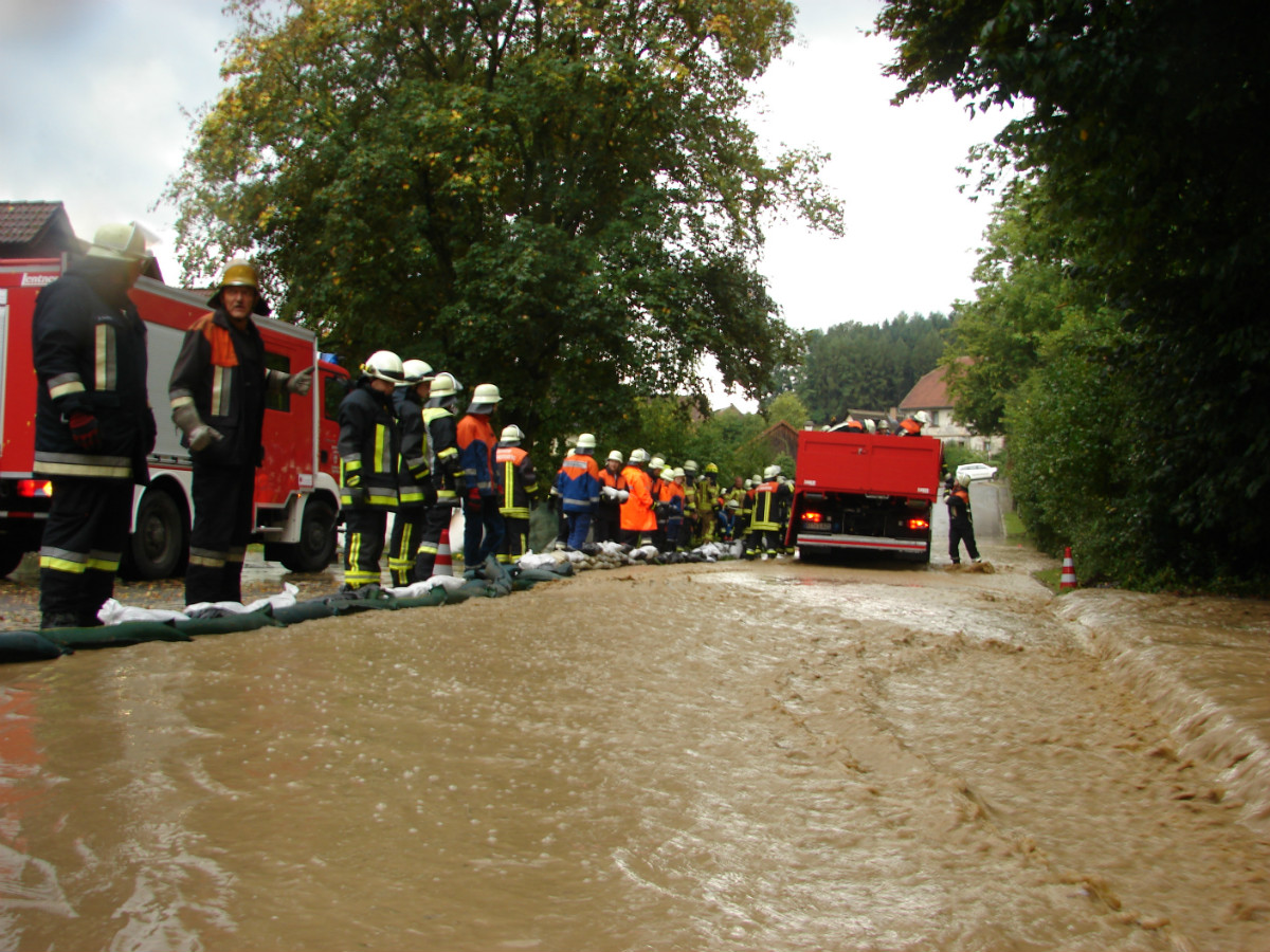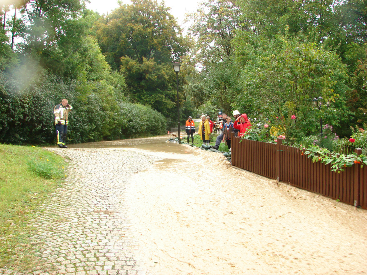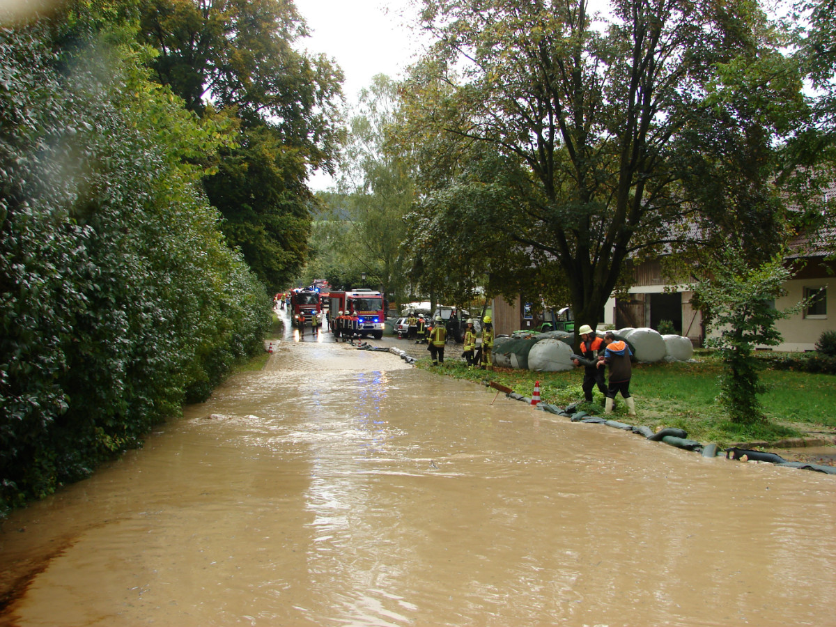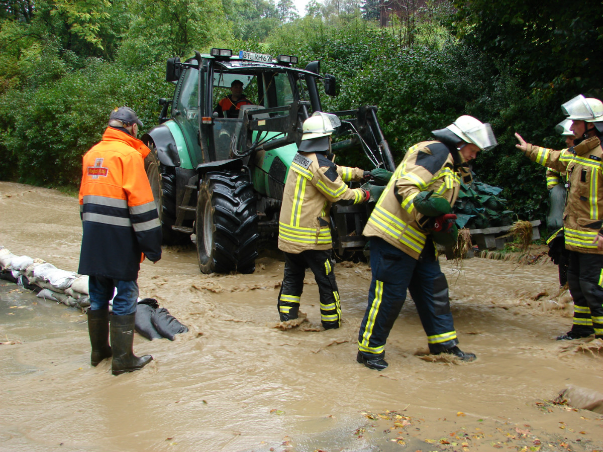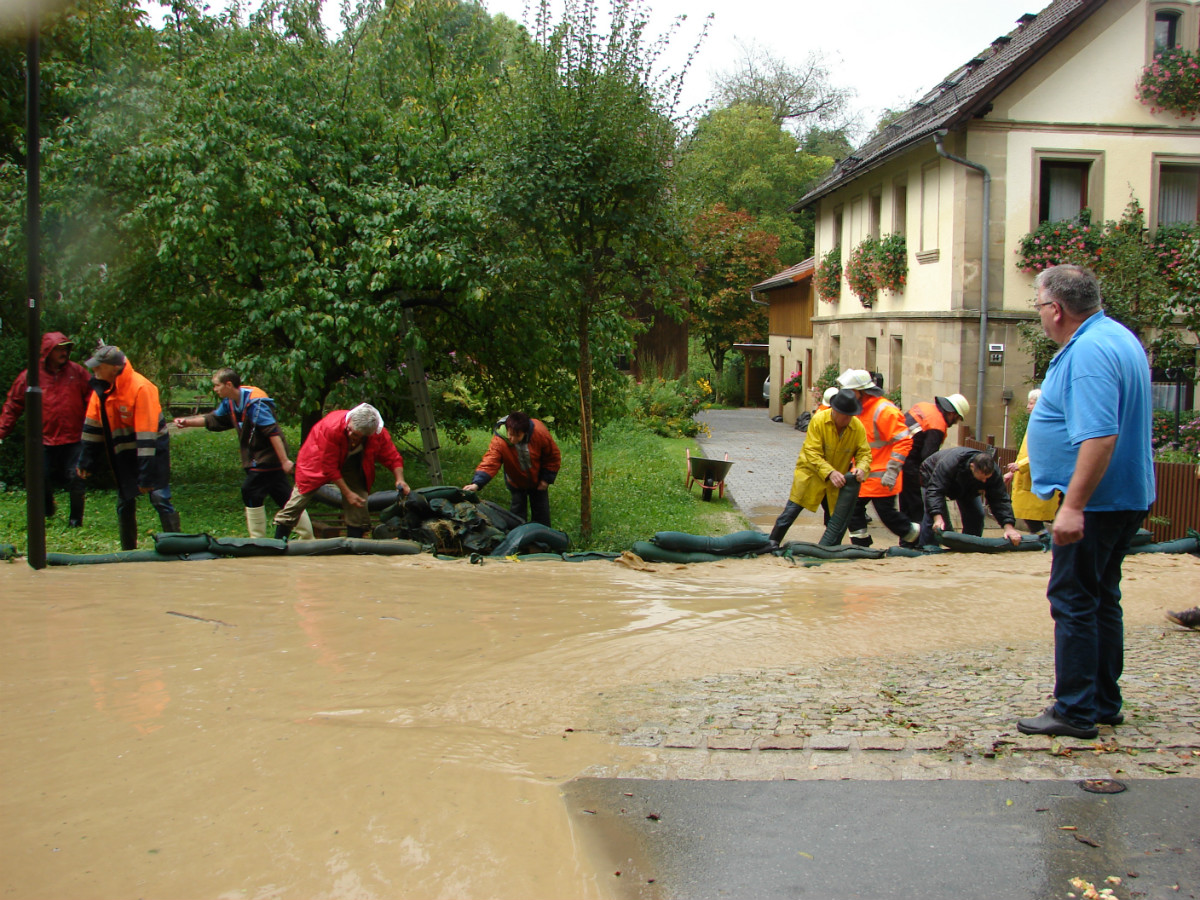 Am schlimmsten hat es die Ortschaft Lessau getroffen. Im Staubereich des Fichtelgebirge hat das Gewitter seine Wassermassen abgeregnet. Diese Starkregenmassen konnten die umliegenden Flure nicht mehr aufnehmen und suchten ihren Weg durch Lessau. Schon bei der Anfahrt ergossen sich die Wassermassen über die Fahrbahn. Den Einsatzkräften aus Lessau und Weidenberg war schnell klar, dass sie den Einsatz nicht alleine bewältigen können und ließen weitere Wehren aus dem Gemeindebereich und zusätzlich Untersteinach, Speichersdorf und Bindlach alarmieren. In allen drei Standorten befinden sich gefüllte Sandsäcke, in Bindlach zusätzlich der mobile Hochwasserschutz Beaver. Mit vereinten Kräften aus Landwirten und Feuerwehr gelang es die Bevölkerung vor größeren Schaden zu bewahren. Nach mehr als zwei Stunden konnte der Einsatzleiter Marco Kießling, der von Kreisbrandrat Hermann Schreck, Kreisbrandmeisterin Kerstin Schmidt und den Kreisbrandmeistern Karlheinz Senke und Kristijan Pauthner unterstützt wurde, den Einsatz in Lessau beenden. Zeitgleich zu dem Einsatz in Lessau musste die Feuerwehr Weidenberg mehrere Einsätze in Weidenberg abarbeiten, hierbei handelte es sich meist um vollgelaufene Keller.