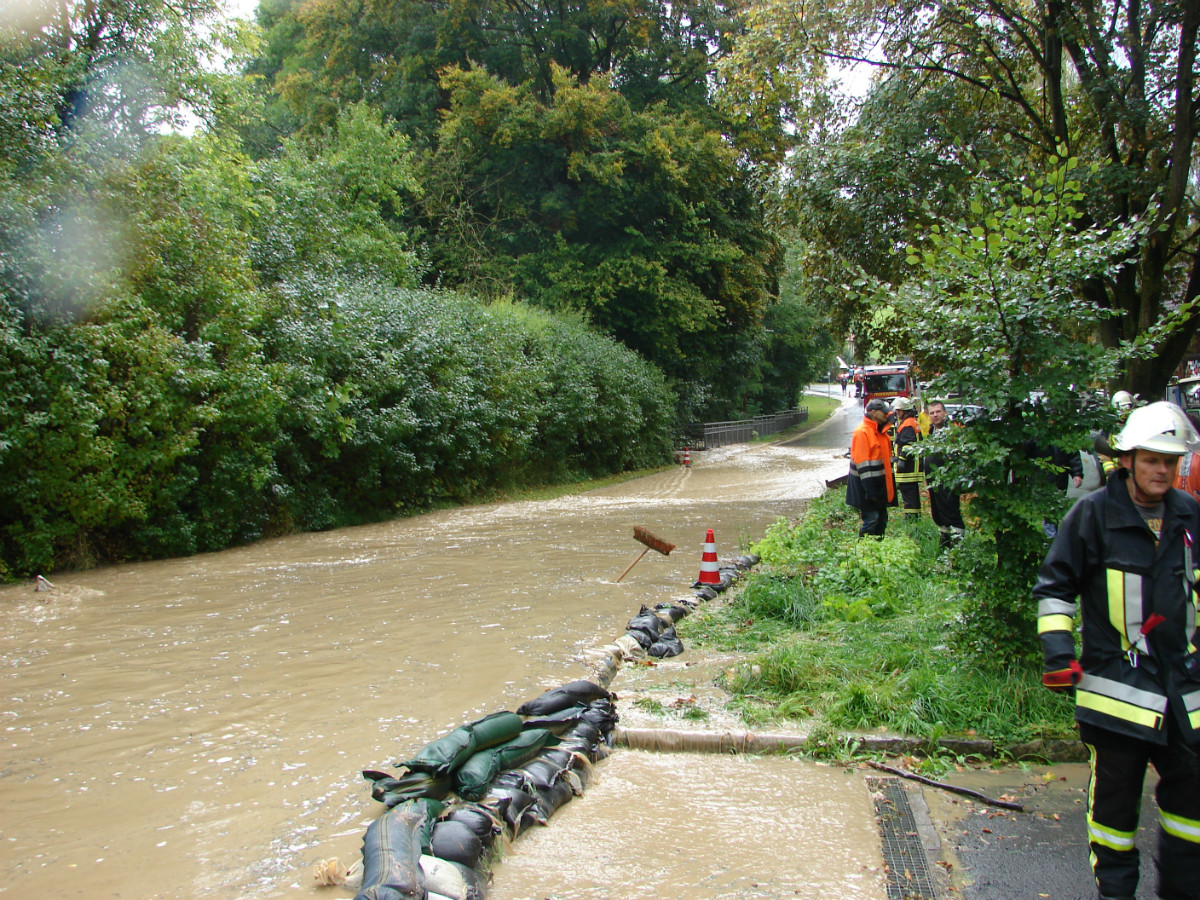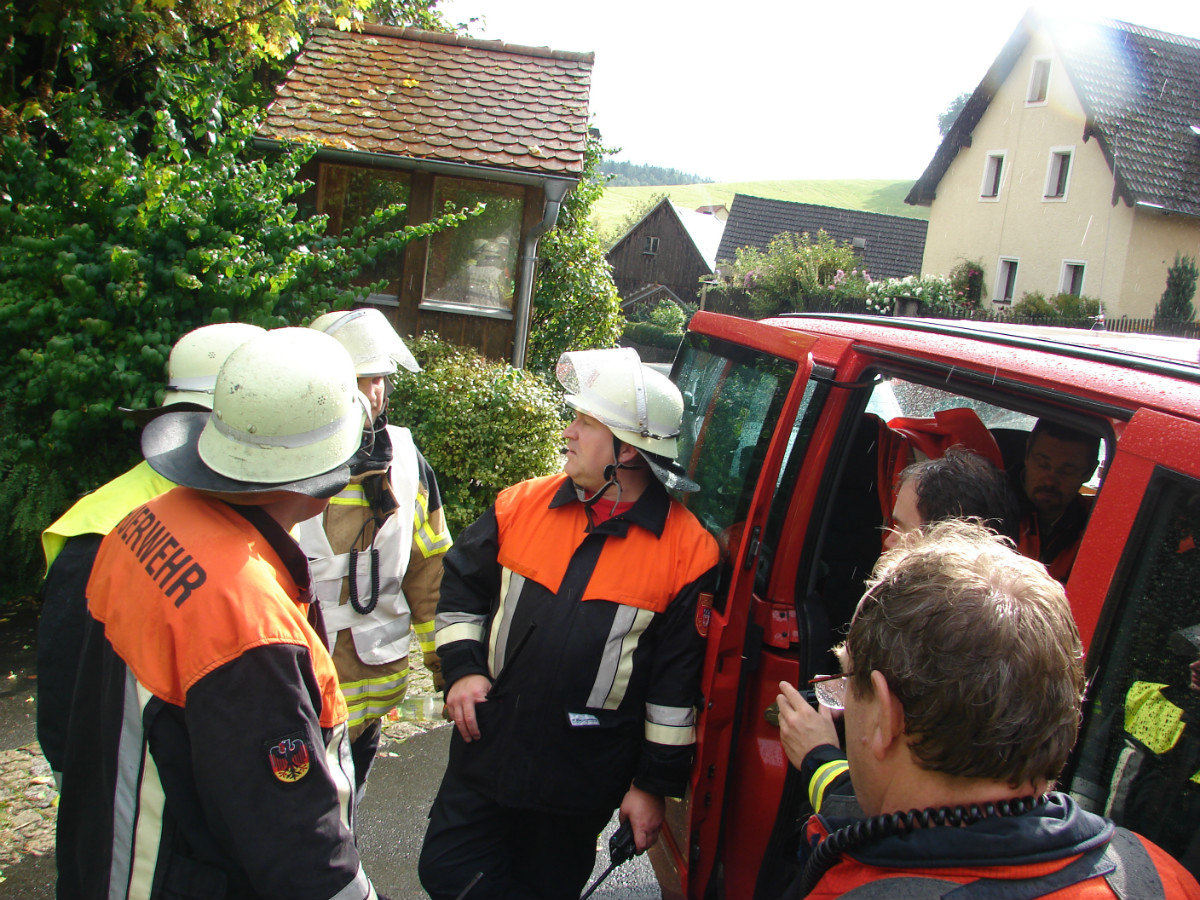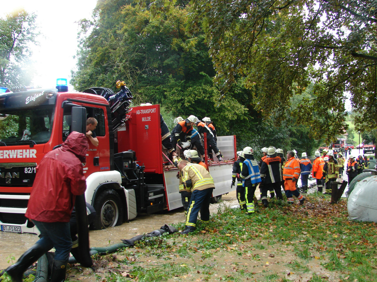 Am schlimmsten hat es die Ortschaft Lessau getroffen. Im Staubereich des Fichtelgebirge hat das Gewitter seine Wassermassen abgeregnet. Diese Starkregenmassen konnten die umliegenden Flure nicht mehr aufnehmen und suchten ihren Weg durch Lessau. Schon bei der Anfahrt ergossen sich die Wassermassen über die Fahrbahn. Den Einsatzkräften aus Lessau und Weidenberg war schnell klar, dass sie den Einsatz nicht alleine bewältigen können und ließen weitere Wehren aus dem Gemeindebereich und zusätzlich Untersteinach, Speichersdorf und Bindlach alarmieren. In allen drei Standorten befinden sich gefüllte Sandsäcke, in Bindlach zusätzlich der mobile Hochwasserschutz Beaver. Mit vereinten Kräften aus Landwirten und Feuerwehr gelang es die Bevölkerung vor größeren Schaden zu bewahren. Nach mehr als zwei Stunden konnte der Einsatzleiter Marco Kießling, der von Kreisbrandrat Hermann Schreck, Kreisbrandmeisterin Kerstin Schmidt und den Kreisbrandmeistern Karlheinz Senke und Kristijan Pauthner unterstützt wurde, den Einsatz in Lessau beenden. Zeitgleich zu dem Einsatz in Lessau musste die Feuerwehr Weidenberg mehrere Einsätze in Weidenberg abarbeiten, hierbei handelte es sich meist um vollgelaufene Keller.