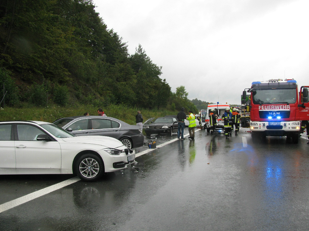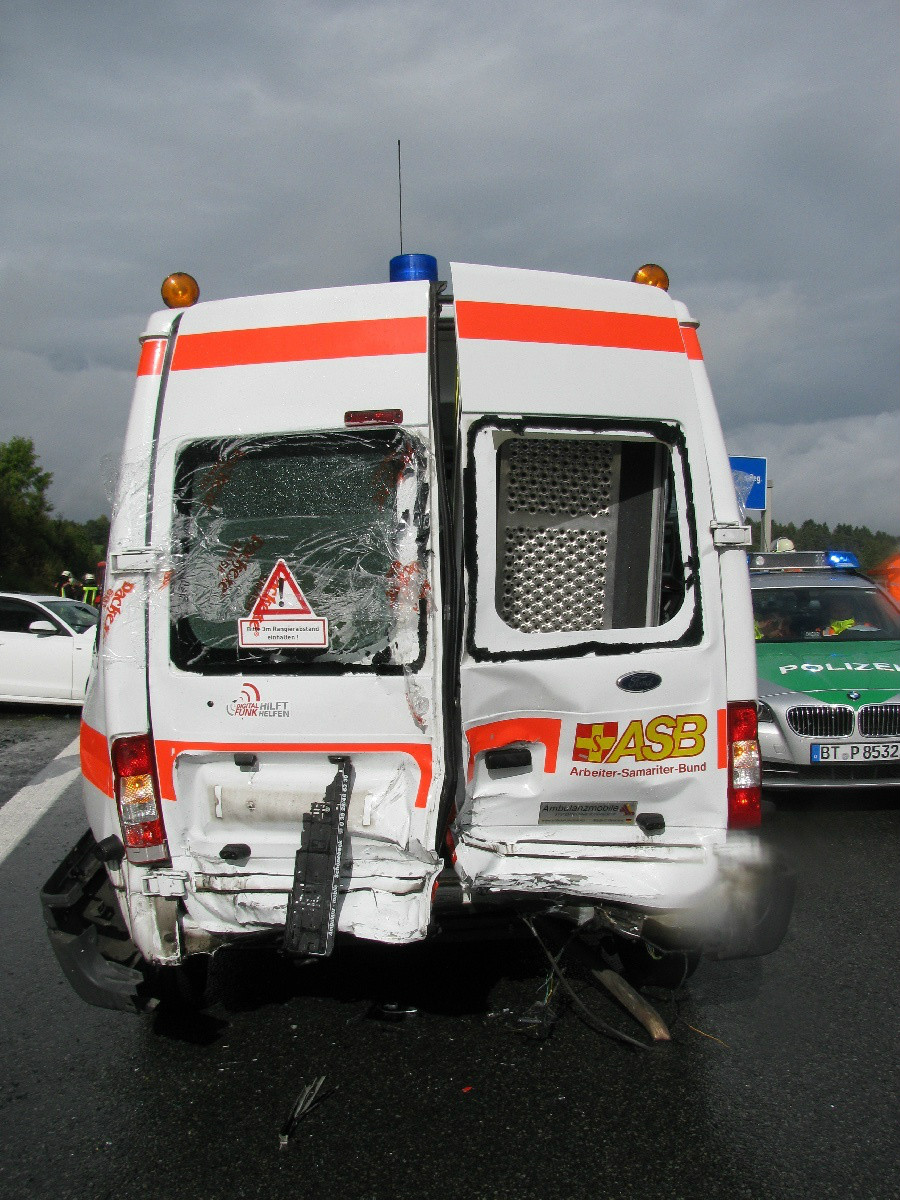 Gegen 14:30 Uhr wurde die Integrierte Leitstelle Bayreuth/Kulmbach (ILS) über den Unfall auf der BAB 9, etwa 200 Meter entfernt der Anschlussstelle Plech in Richtung Nürnberg, informiert. Ersten Informationen zufolge waren mehrere PKW, darunter auch ein Krankentransportwagen, in den Unfall verwickelt. Daraufhin wurden durch die ILS vier Rettungstransportwagen, ein Notarzteinsatzfahrzeug, ein Rettungstransporthubschrauber und ein Einsatzleiter Rettungsdienst an die Einsatzstelle geschickt. Gleichzeitig rückten die Feuerwehren Plech, Ottenhof und Pegnitz sowie das Technische Hilfswerk Pegnitz aus. Bei Eintreffen der Hilfskräfte wurden insgesamt sieben verletzte Personen festgestellt. Eingeklemmt war niemand. Sechs Unfallbeteilige wurden von den Rettungskräften in umliegende Krankenhäuser verbracht. Ein Besatzungsmitglied des in den Unfall verwickelten Krankentransportwagens einer Rettungswache in München wurde schwer verletzt und mit dem Rettungshubschrauber ins Klinikum Bayreuth eingeliefert. Die restlichen Beteiligten des Unfalles wurden in umliegende Krankenhäuser verteilt. Ein Patient befand sich nach ersten Erkenntnissen nicht im KTW. Im Verlauf des Einsatzes musste ein Notarzt an die Einsatzstelle bei Plech zurückkehren. In einem im Stau stehenden Reisebus erlitt ein Fahrgast einen Asthmaanfall und musste ärztlich behandelt werden.