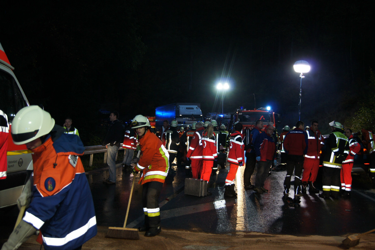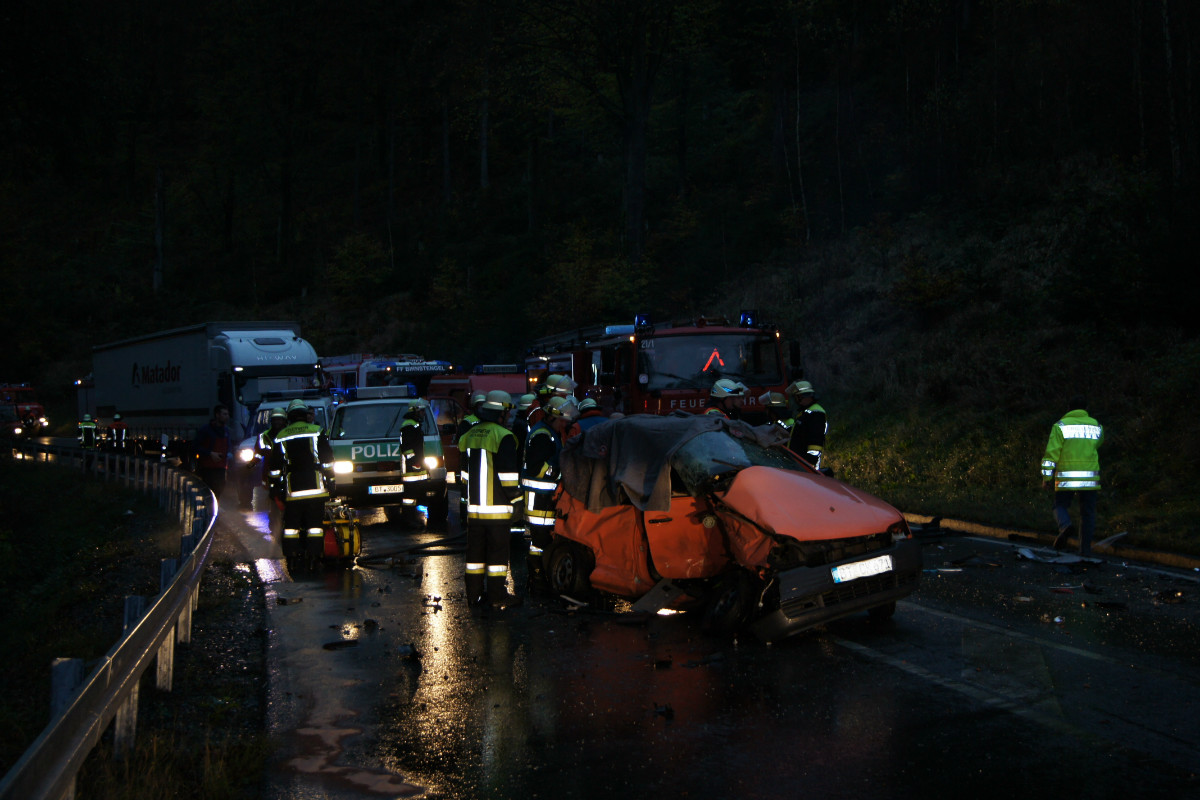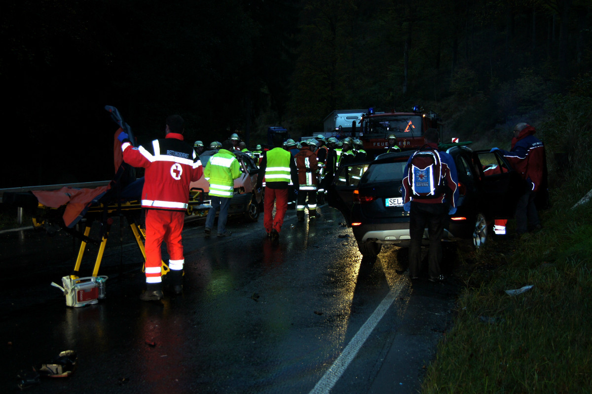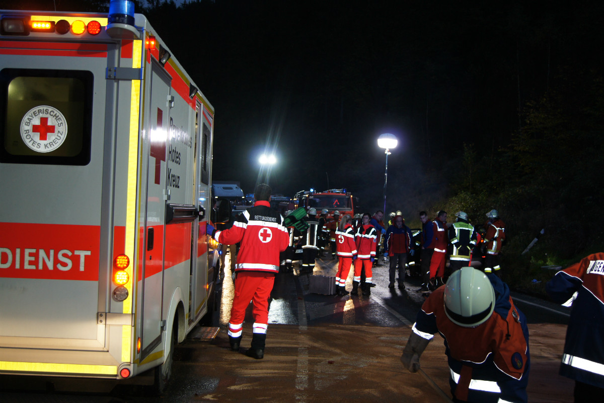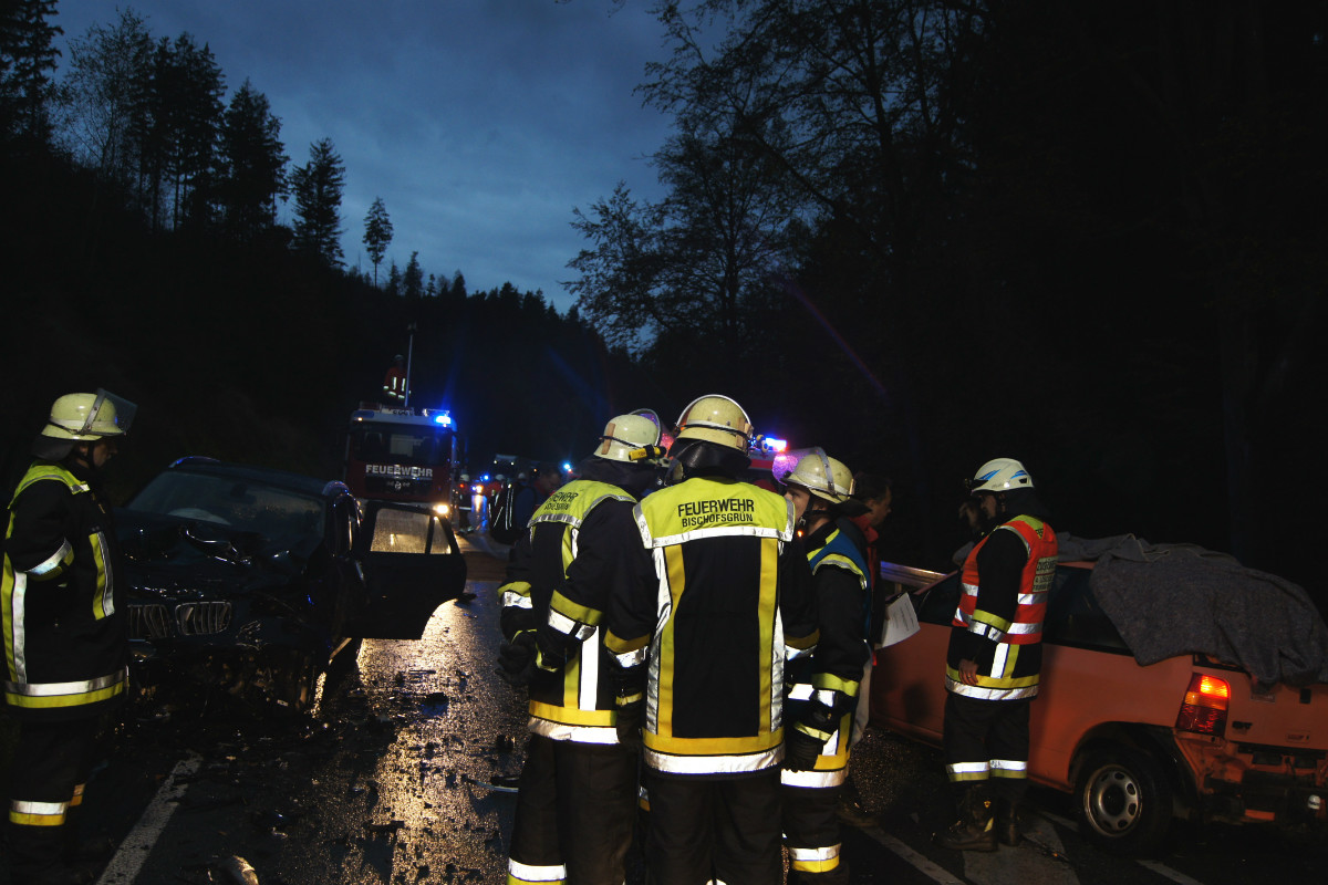Zu einem schweren Verkehrsunfall wurden die Freiwilligen Feuerwehren am frühen Abend des 20.10.2014 auf die B303 nahe des sogenannten „Scharfen Ecks“ gerufen. Da laut den ersten Meldungen von mehreren beteiligten Fahrzeugen und mehreren eingeklemmten Personen auszugehen war, wurden die Freiwlligen Feuerwehren Bischofsgrün-Birnstengel, Bad Berneck, Escherlich, Wülfersreuth sowie Gefrees alarmiert. Ein Großaufgebot des Rettungsdienstes mit mehreren Notärzten und Rettungssanitätern eilten ebenfalls sofort an die Einsatzstelle. Während für eine PKW-Fahrerin jede Hilfe zu spät kam, wurden die Insassen des in dem zweiten am Unfall beteiligten Fahrzeug erstversorgt und zur weiteren Behandlung ins Krankenhaus gebracht. Neben der Reinigung der Unfallstelle sowie den Umleitungs- und Absperrmaßnahmen übernahm die Feuerwehr die Bergung der tödlich verunglückten Fahrerin. Noch während dieses Einsatzes wurde die Feuerwehr Escherlich zu einer Erste-Hilfe-Maßnahme an der Bruckmühle bei Escherlich alarmiert. Das Kriseninterventionsteam überbrachte gemeinsam mit der Polizei den Angehörigen der Getöteten die traurige Nachricht. Rund 70 Einsatzkräfte waren in den Einsatz eingebunden.