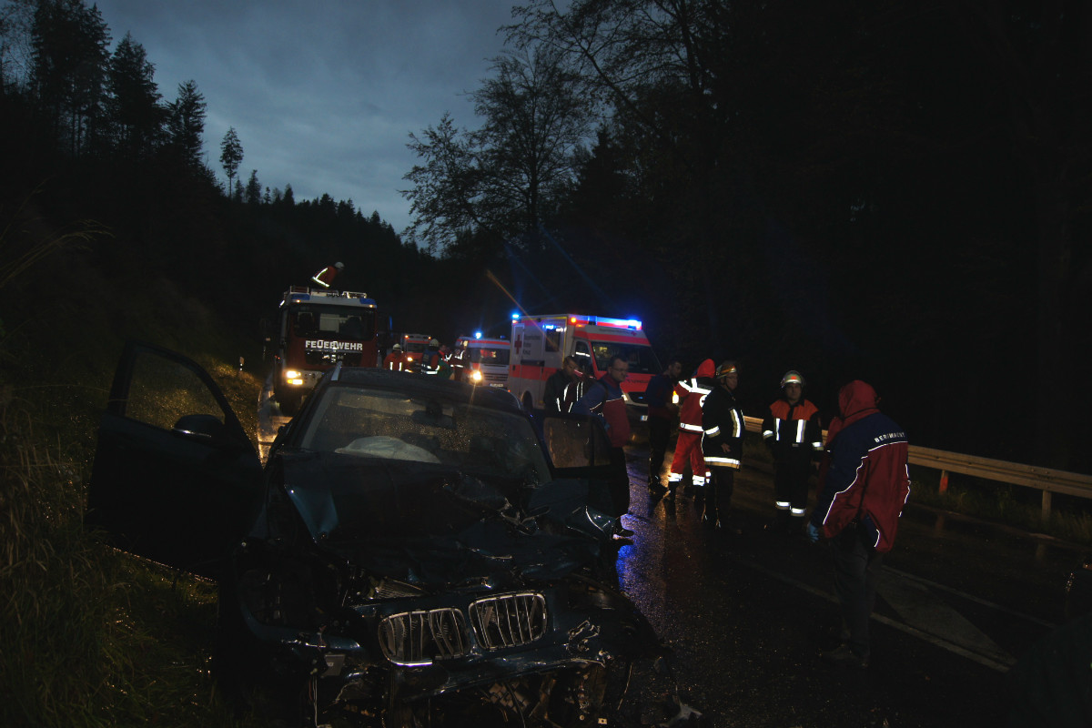 Kurz nach 17.30 Uhr war eine 46 Jahre alte Autofahrerin aus dem Gemeindebereich Bischofsgrün mit ihrem Seat Arosa auf der Bundesstraße B303 in Richtung Bad Berneck unterwegs. Im Verlauf einer Rechtskurve, nach dem sogenannten „Scharfen Eck“, geriet ihr Fahrzeug auf der regennassen Fahrbahn ins Schleudern und prallte mit der Beifahrerseite in die Front eines entgegenkommenden BMW X1 eines Ehepaares aus Selb. Durch die Wucht des Zusammenstoßes wurde die 46-jährige Seatfahrerin in ihrem Auto eingeklemmt. Der alarmierte Notarzt konnte nur noch ihren Tod feststellen. Die 72-jährige Frau am Steuer des BMW und ihr gleichaltriger Beifahrer erlitten durch den Zusammenstoß schwere Verletzungen und mussten in ein Krankenhaus eingeliefert werden. An die Unfallstelle waren über 70 Einsatzkräfte von der Feuerwehr, dem Rettungsdienst und der Polizei geeilt.