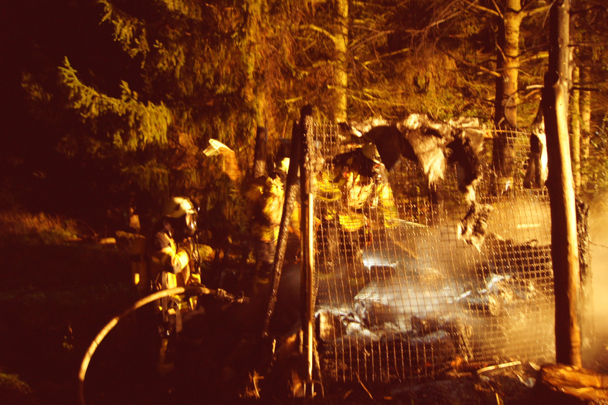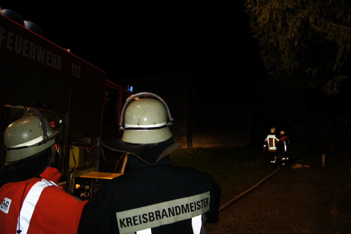 Ein gemeldeter Scheunenbrand hat in den frühen Morgenstunden des 22.10.2014 die Freiwilligen Feuerwehren rund um Goldkronach auf den Plan gerufen. Gegen 4.25 Uhr alarmierte die Integrierte Leitstelle Bayreuth-Kulmbach unter dem Alarmstichwort „B4 Brand Scheune“. Ein dementsprechend großes Aufgebot an Einsatzkräften rückte sofort an. Beim Eintreffen der ersten Kräfte stellte sich heraus, dass eine im unmittelbaren Umfeld der Scheune aufgebaute Holzlege im Vollbrand stand. Auch einige Bäume wurden in Mitleidenschaft gezogen. Unter schwerem Atemschutz gelang es den Angriffstrupps rasch, den Brand unter Kontrolle zu bringen. Ein Übergreifen auf die Scheune konnte verhindert werden. Durch Abtragen und Ablöschen des Brandguts wurde das Feuer schließlich komplett gelöscht und mittels Wärmebildkamera nach Glutnestern gesucht. Im Einsatz waren rund 100 Kräfte von Feuerwehr, Rettungsdienst und Polizei.