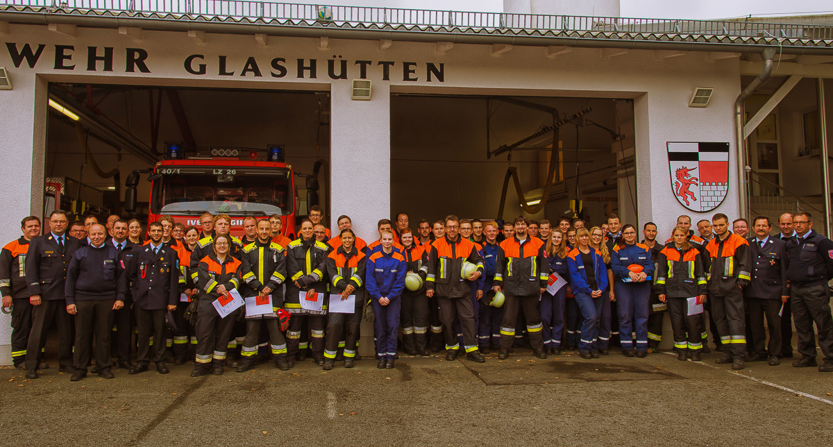 Knapp 40 Feuerwehrleute aus der Inspektion II beendeten am Samstag, den 11.10.2014, den Pilotlehrgang zur neuen Modularen Truppausbildung. Seit Februar diesen Jahres waren über 100 Unterrichtseinheiten zu absolvieren, deren Spektrum von den Rechtsgrundlagen über Gerätekunde bishin zur Technischen Hilfeleistung reichte und insgesamt eine hohe Vielzahl an Facetten des Feuerwehrlebens abdeckte. Die durchaus herausfordernde Abschlussprüfung beinhaltete nicht nur 50 theoretische Testfragen sondern auch den Aufbau eines kompletten Löschangriffs nebst Zusatzaufgaben. Für die dabei durchweg erreichten guten Leistungen zollte Kreisbrandinspektor Armin Meyer bei der Lehrgangsaussprache Respekt und Anerkennung und vor allem hohen Dank an die Teilnehmerinnen und Teilnehmer, sich dieser langen Ausbildungsphase zu stellen. Und so ist die neu eingeführte Modulare Truppausbildung in zweierlei Hinsicht ein voller Erfolg: Zum ersten konnte den Feuerwehrleuten ein topmoderner und interessanter Unterricht angeboten werden, der sich an den Bedürfnissen der tatsächlichen (Einsatz-)Praxis orientiert. Zum zweiten können die Führungskräfte auf Basis der gewonnenen Erkenntnissen und des Feedbacks der Teilnehmer künftige Lehrgänge noch weiter verbessern. Ein besonders herzliches Dankeschön gilt abschließend sämtlichen Ausbildern für ihre tatkräftige Unterstützung und der Feuerwehr Glashütten für ihre Gastfreundschaft !