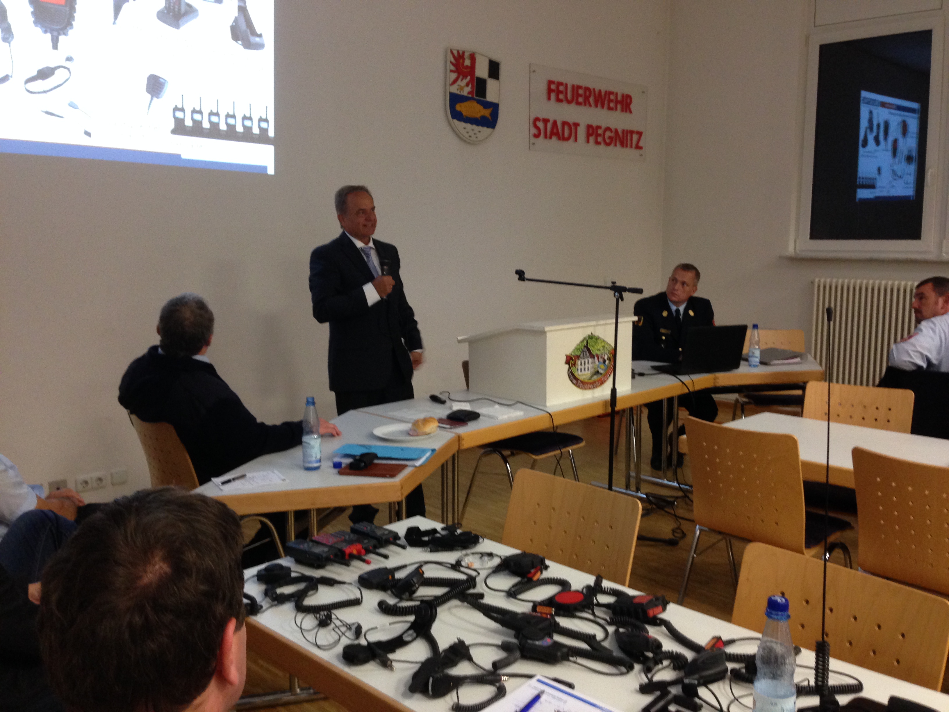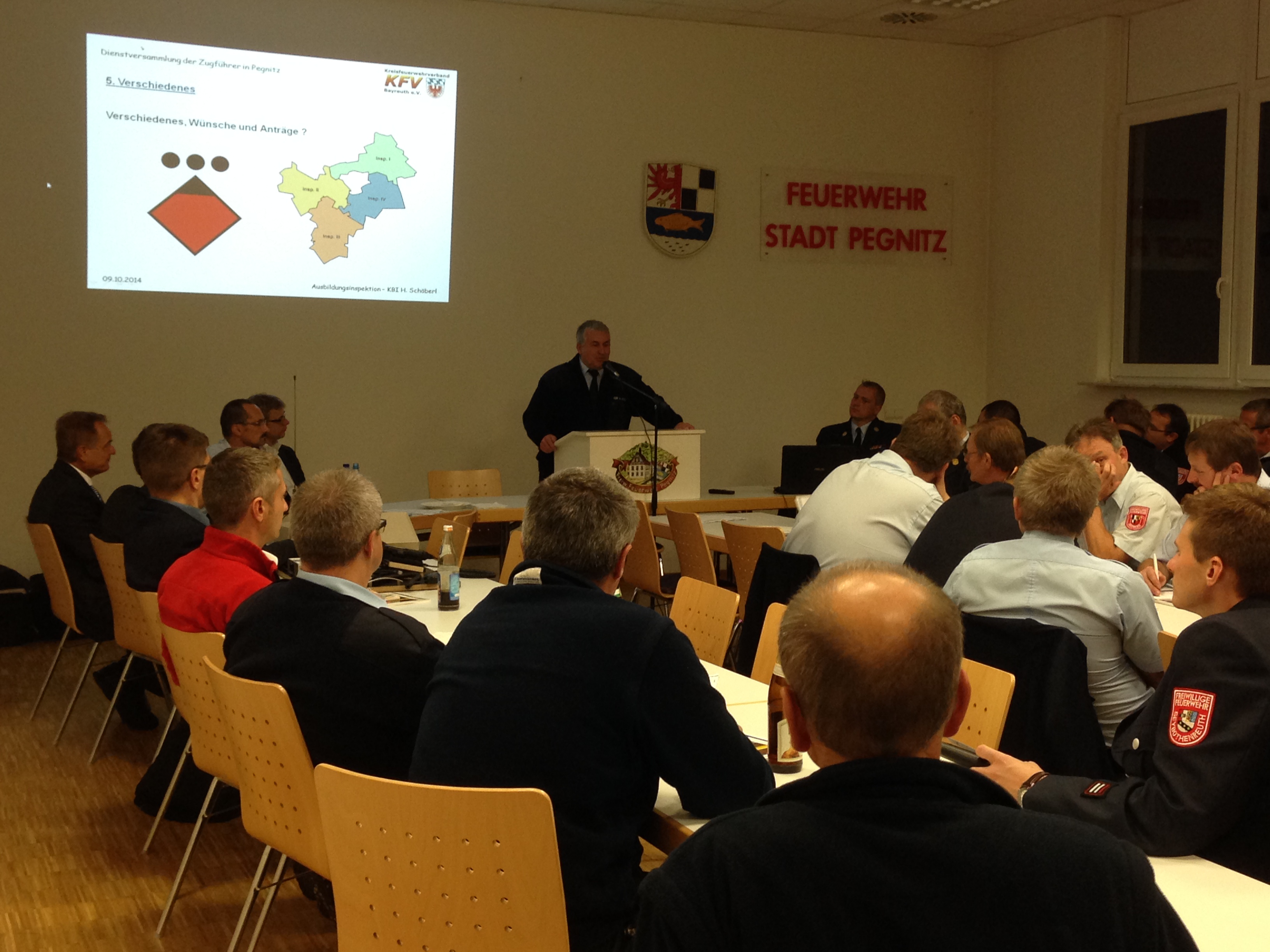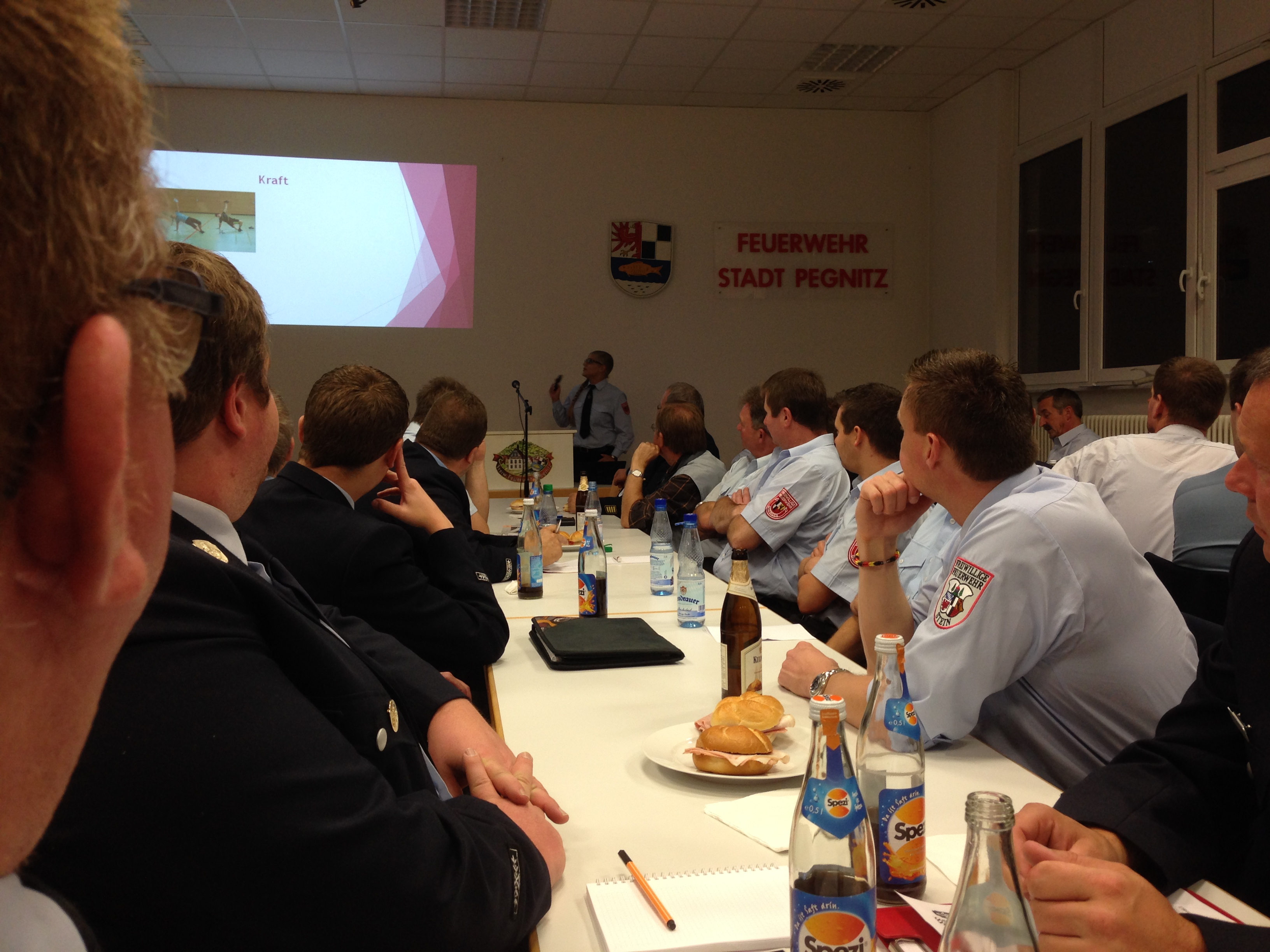 Am 09.10.14 fand die Dienstversammlung der Zugführer und Stellvertreter im Gerätehaus Pegnitz statt. Magdalena Schuster von der Feuerwehr Eckersdorf startete mit einem Vortrag zum Thema „Fitness in der Feuerwehr“. Kreisbrandmeister Jürgen Wunderlich berichtete über den aktuellen Sachstand „Digitalfunk“ und Wolfgang Liegl von der Firma Selectric Digitalfunksysteme-Bayern GmbH stellte Zubehör für Atemschutz vor. Diese Audiogeräte konnten im Anschluss auch praktisch mit den Kameraden der Feuerwehr Pegnitz getestet werden. Markus Ruckdeschel von der ILS und Kreisbrandrat Hermann Schreck zeigten den weiteren zeitlichen Ablauf zur Einführung des Digitalfunks und zur Schulung der Feuerwehren auf. Hier einige Fotos von der Dienstversammlung:
