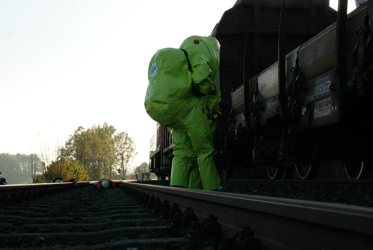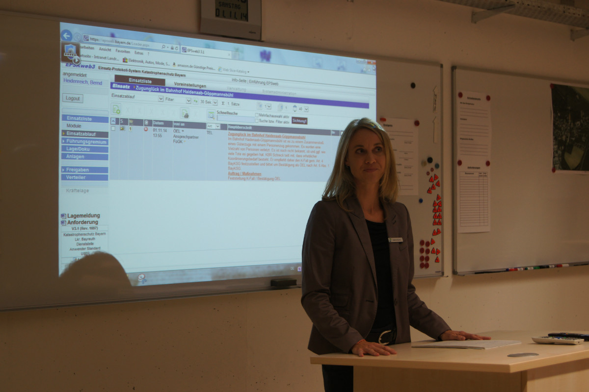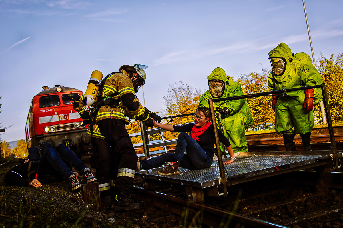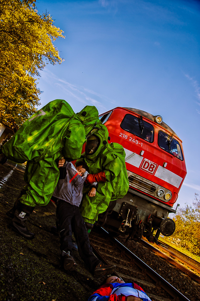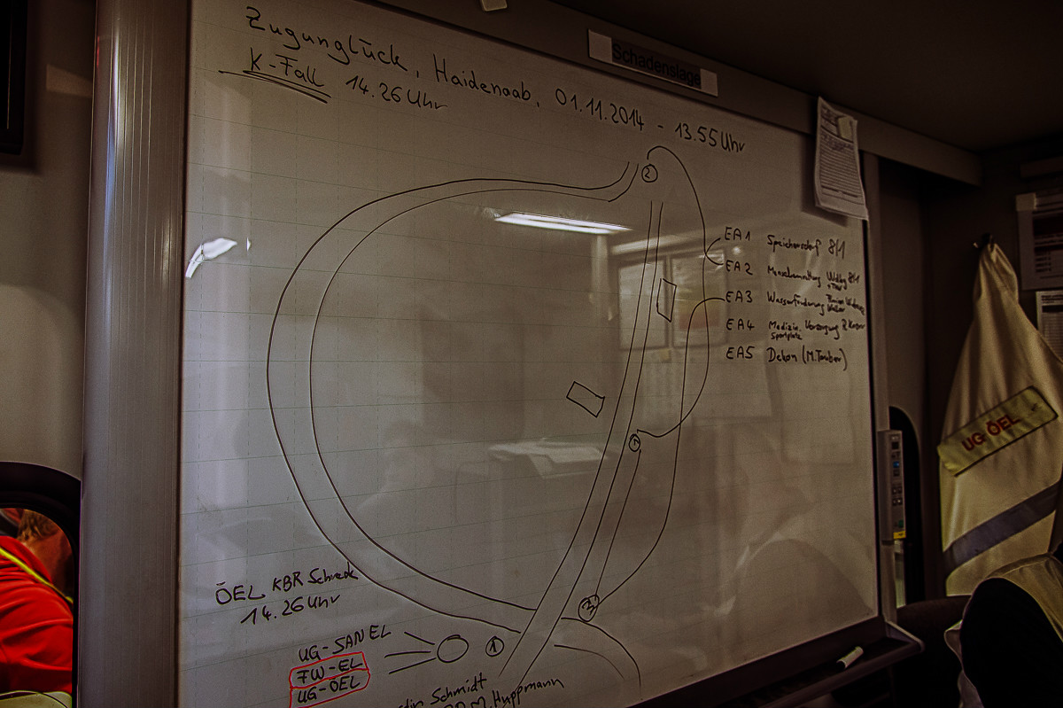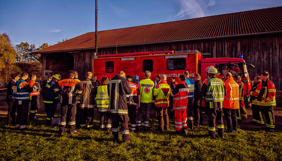 Der „Super-Gau 2014“ stellte die Einsatzkräfte von Feuerwehr, Rettungsdienst, Technischem Hilfswerk und die Verantwortlichen der Deutschen Bahn vor große Herausforderungen. Aber auch die Führungsgruppe Katastrophenschutz (FüGK), die Unterstützungsgruppen sowie die Fachberater aller Organisationen mussten bei der Katastrophenschutzvollübung des Landkreises Bayreuth am Nachmittag des 01.11.2014 den Ernstfall proben. Angenommen wurde ein Schadensszenario, bei dem von der Kollision eines Personenzugs mit einem Güterzug im Bereich der Ortschaft Haidenaab-Göppmannsbühl ausgegangen wurde. Der Notruf erreichte die Integrierte Leitstelle kurz vor 14 Uhr, um 13.55 Uhr wurden die ersten Kräfte alarmiert. Eine Vielzahl von Verletzten wurden ins Spiel gebracht, der Güterzug war zudem mit giftigen Stoffen beladen, welche nach der Kollision austraten. Es galt, sowohl Einsatzkräfte wie auch die Bevölkerung vor den austretenden Stoffen zu schützen. Immer wieder neue Anforderungen wurden an die Führungsgruppe Katastrophenschutz ins Landratsamt Bayreuth übermittelt, auch die Einsatzkräfte vor Ort trainierten so realitätsgetreu wie möglich. Vor allem dem Bereich Atem- und Chemieschutz sowie der Versorgung eines Masseanfalls von Verletzten wurde große Aufmerksamkeit gewidmet.