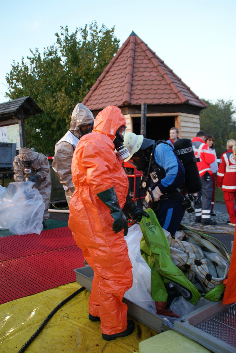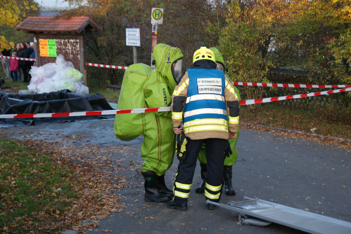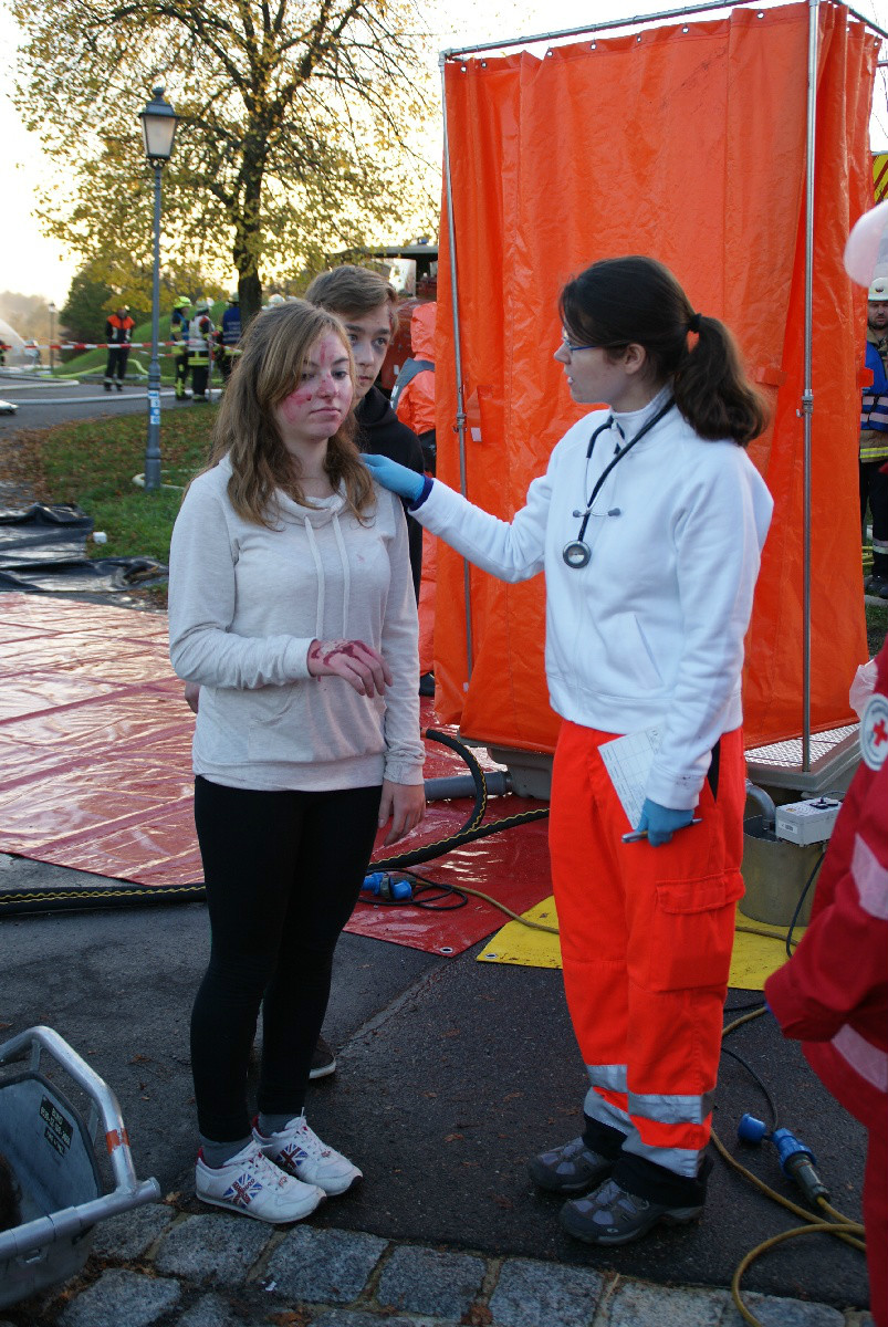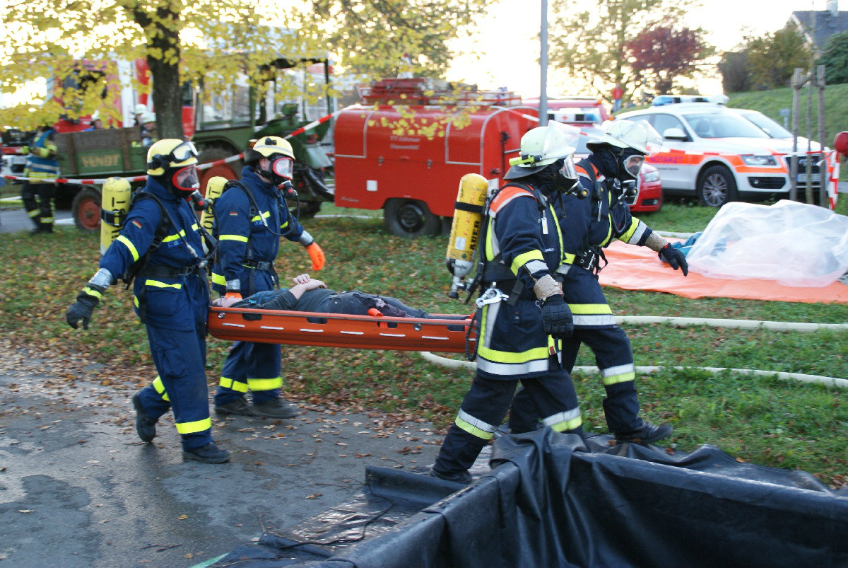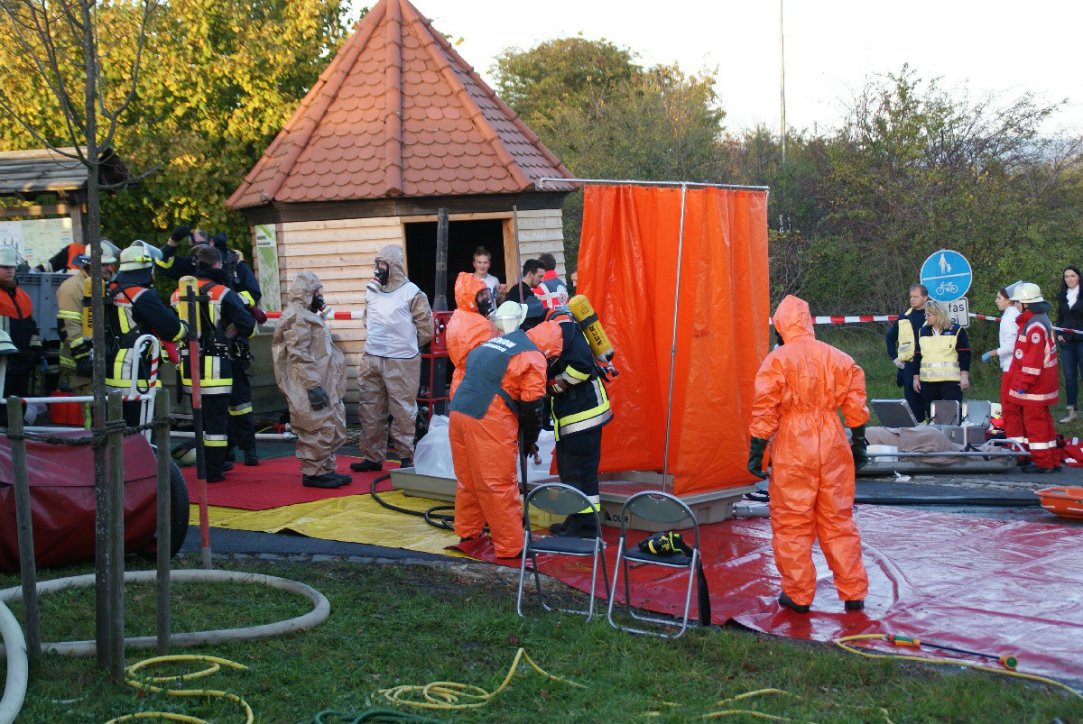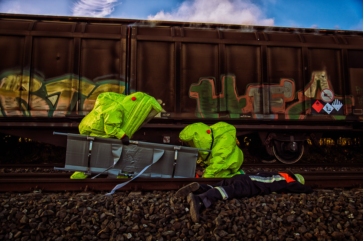 Der „Super-Gau 2014“ stellte die Einsatzkräfte von Feuerwehr, Rettungsdienst, Technischem Hilfswerk und die Verantwortlichen der Deutschen Bahn vor große Herausforderungen. Aber auch die Führungsgruppe Katastrophenschutz (FüGK), die Unterstützungsgruppen sowie die Fachberater aller Organisationen mussten bei der Katastrophenschutzvollübung des Landkreises Bayreuth am Nachmittag des 01.11.2014 den Ernstfall proben. Angenommen wurde ein Schadensszenario, bei dem von der Kollision eines Personenzugs mit einem Güterzug im Bereich der Ortschaft Haidenaab-Göppmannsbühl ausgegangen wurde. Der Notruf erreichte die Integrierte Leitstelle kurz vor 14 Uhr, um 13.55 Uhr wurden die ersten Kräfte alarmiert. Eine Vielzahl von Verletzten wurden ins Spiel gebracht, der Güterzug war zudem mit giftigen Stoffen beladen, welche nach der Kollision austraten. Es galt, sowohl Einsatzkräfte wie auch die Bevölkerung vor den austretenden Stoffen zu schützen. Immer wieder neue Anforderungen wurden an die Führungsgruppe Katastrophenschutz ins Landratsamt Bayreuth übermittelt, auch die Einsatzkräfte vor Ort trainierten so realitätsgetreu wie möglich. Vor allem dem Bereich Atem- und Chemieschutz sowie der Versorgung eines Masseanfalls von Verletzten wurde große Aufmerksamkeit gewidmet.