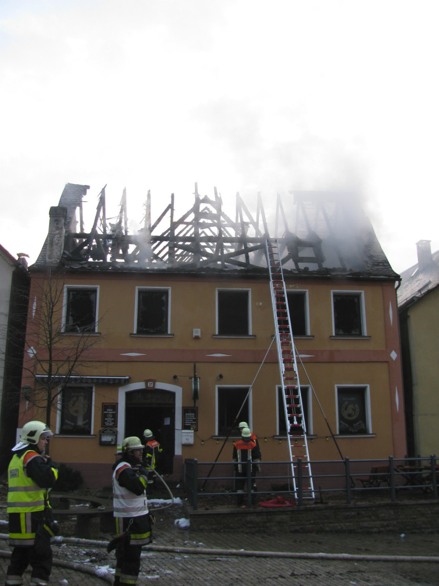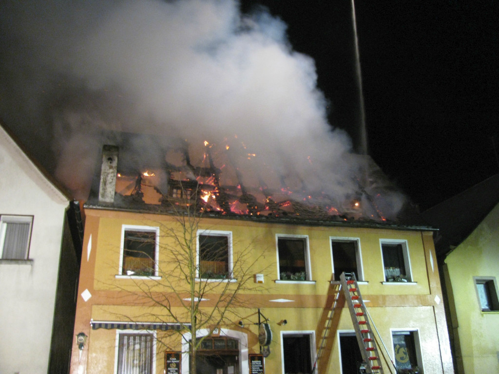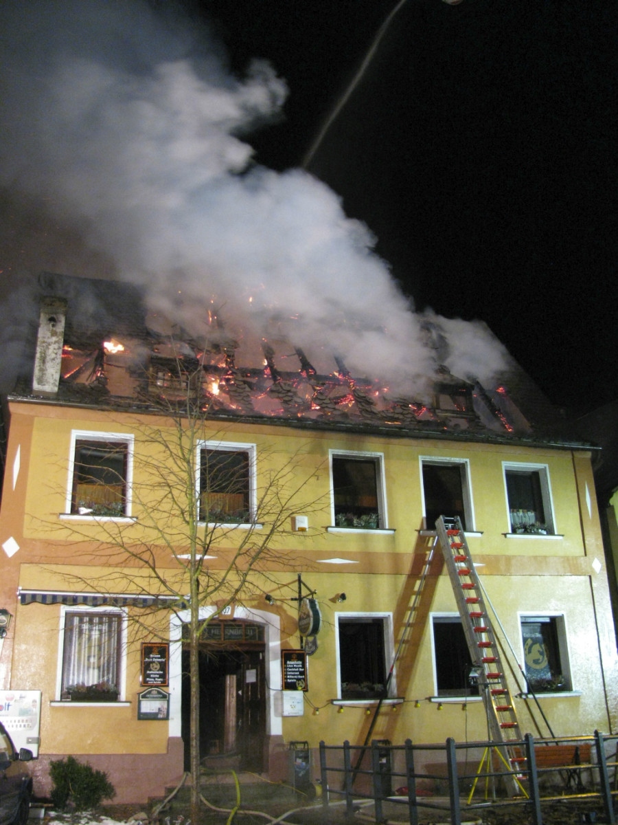 Anwohner teilten der Rettungsleitstelle, gegen 3.40 Uhr, Feuer und starke Rauchentwicklung in dem Gebäude, in dem sich im Erdgeschoss auch eine Gaststätte befindet, mit. Den Bewohnern gelang es noch rechtzeitig, sich über den Hinterausgang des Anwesens in Sicherheit zu bringen. Schnell kamen die alarmierten Einsatzkräfte vor Ort. Trotz aller Bemühungen konnten die Feuerwehren nicht verhindern, dass sich in den folgenden Stunden die Flammen im Erdgeschoss über die Zwischenböden bis zum Dachstuhl ausbreiteten. Zeitweise kämpften zirka 170 Feuerwehreinsatzkräfte gegen die Flammen. Auch ein dicht neben dem brennenden Gebäude befindliches Haus wurde insbesondere durch die starke Hitzeentwicklung in Mitleidenschaft gezogen.