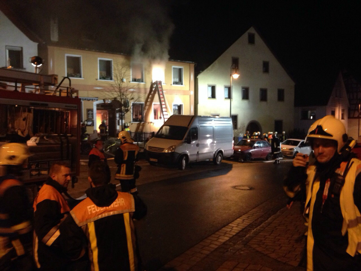 Großeinsatz für die Feuerwehren rund um Betzenstein: In der dortigen Hauptstraße war es in der Nacht zum 15.12.2014 zu einem Schwelbrand in einem Wohnhaus mit Gaststätte gekommen, in dessen Verlauf es zu einem offenen Dachstuhlbrand kam. Um 3:41 Uhr alarmiert die Integrierte Leitstelle Bayreuth-Kulmbach die Wehren Betzenstein, Ottenhof, Plech und Pegnitz, die sofort zur Einsatzstelle ausrückten. Beim Eintreffen der ersten Wehren hatten sich bereits alle Bewohner in Sicherheit gebracht. Mehrere Atemschutztrupps durchsuchten das Gebäude nach der Ursache des Schwelbrandes, der sich über das Erdgeschoss bereits in die erste Etage ausgebreitet hatte. Trotz des massiven Einsatzes des Innenangriffs und der Wärmebildkamera konnte jedoch nicht verhindert werden, dass sich der Brand durch die Zwischenböden der Decken bis ins Dachgeschoss ausbreiteten. Schließlich kam es dort zu einem Vollbrand mit offenem Dachstuhlbrand.