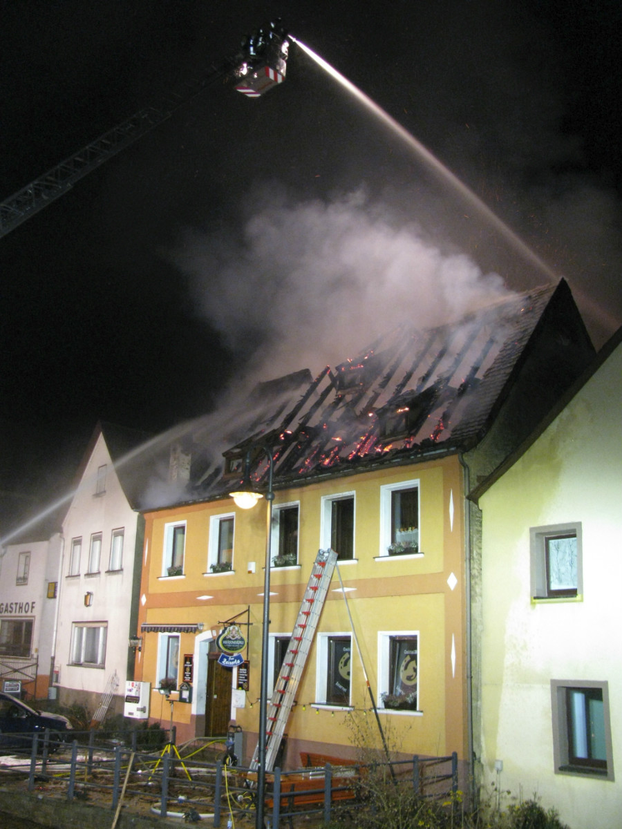 Anwohner teilten der Rettungsleitstelle, gegen 3.40 Uhr, Feuer und starke Rauchentwicklung in dem Gebäude, in dem sich im Erdgeschoss auch eine Gaststätte befindet, mit. Den Bewohnern gelang es noch rechtzeitig, sich über den Hinterausgang des Anwesens in Sicherheit zu bringen. Schnell kamen die alarmierten Einsatzkräfte vor Ort. Trotz aller Bemühungen konnten die Feuerwehren nicht verhindern, dass sich in den folgenden Stunden die Flammen im Erdgeschoss über die Zwischenböden bis zum Dachstuhl ausbreiteten. Zeitweise kämpften zirka 170 Feuerwehreinsatzkräfte gegen die Flammen. Auch ein dicht neben dem brennenden Gebäude befindliches Haus wurde insbesondere durch die starke Hitzeentwicklung in Mitleidenschaft gezogen.