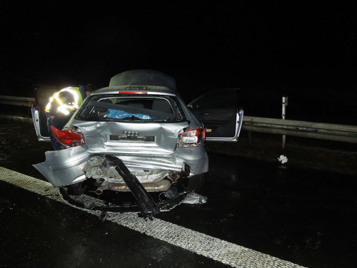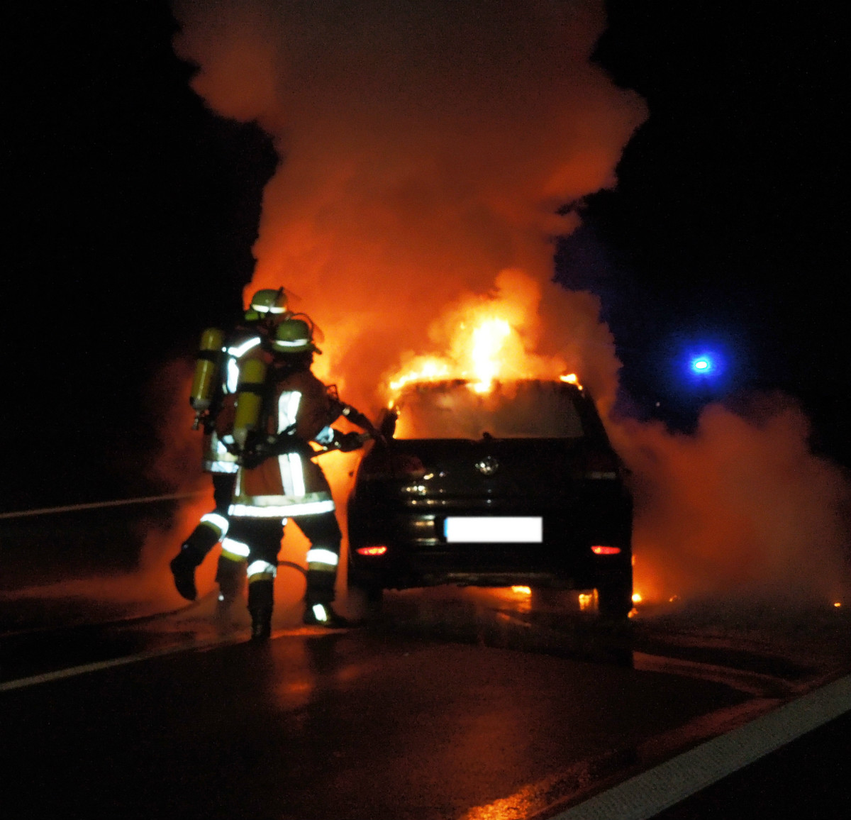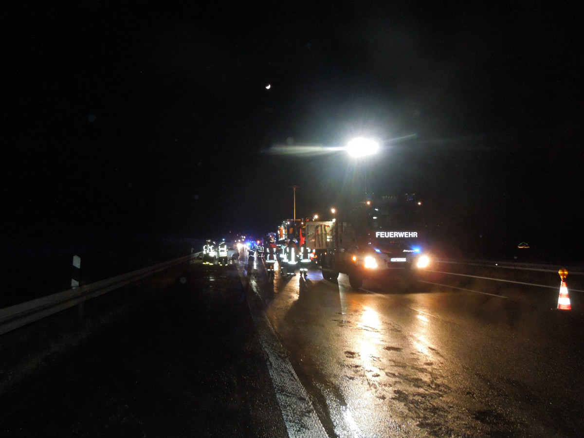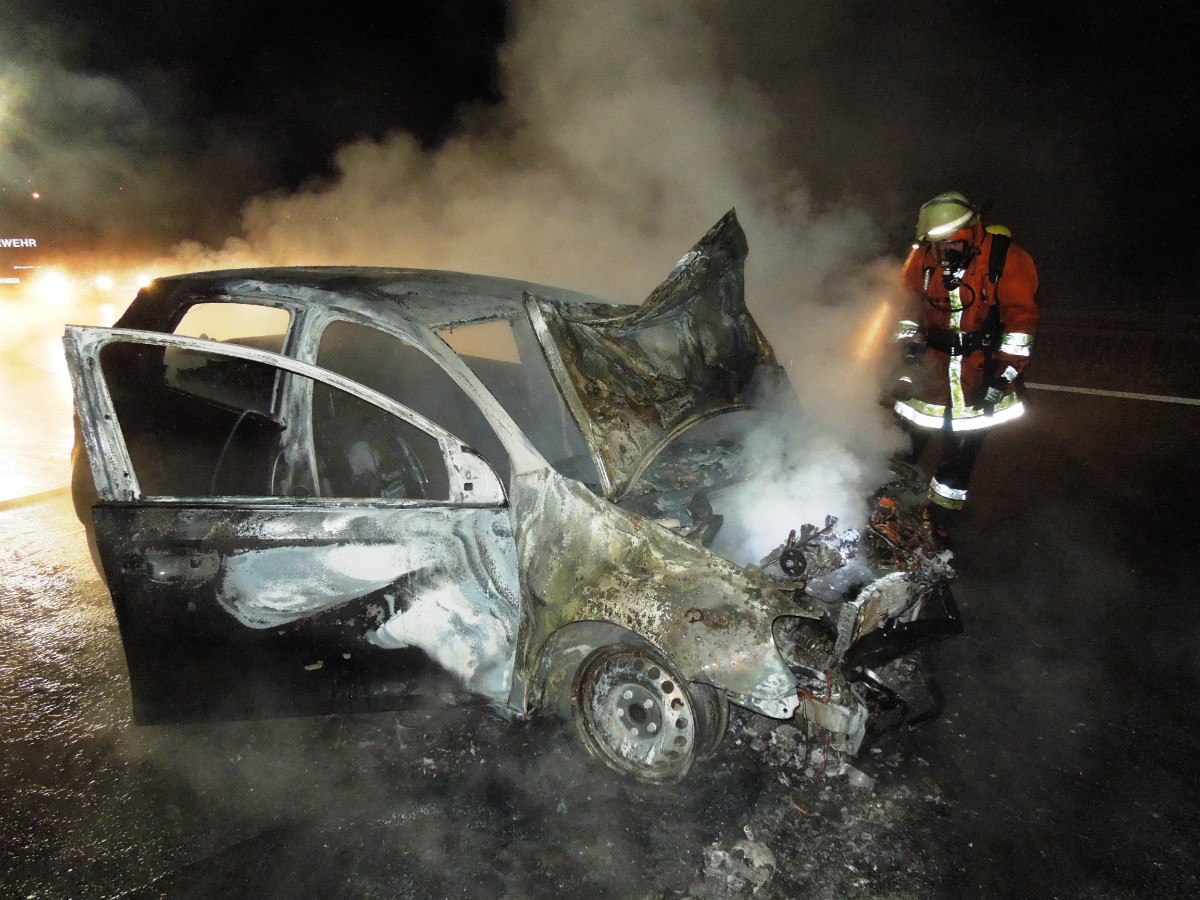 Bei Eintreffen der Rettungskräfte brannte ein PKW auf der mittleren Fahrspur der Bundesautobahn in voller Ausdehnung. Ein weiterer PKW, der beim vorausgegangen Verkehrsunfall beteiligt war, befand sich kollidiert mit der rechten Schutzleitplanke auf dem Standstreifen.