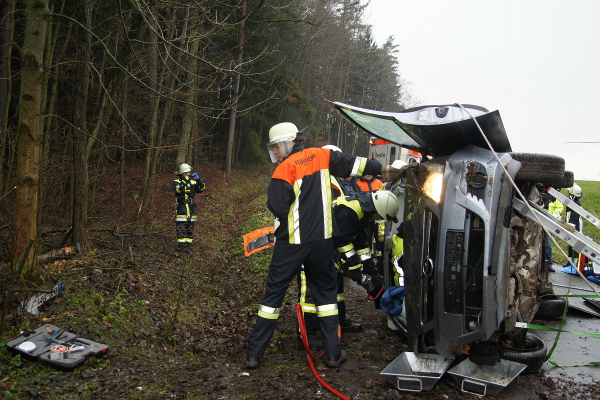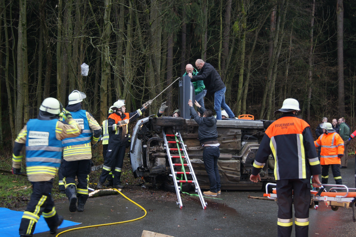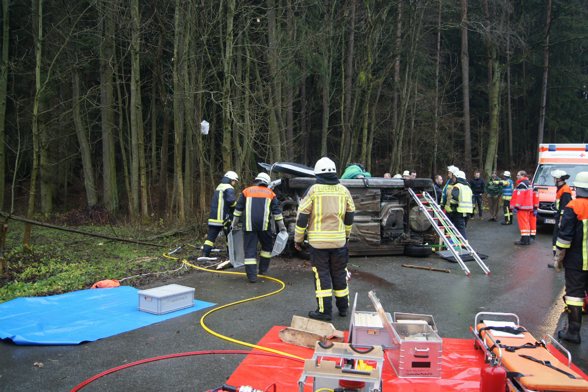Zu einem Verkehrsunfall mit eingeklemmter Person wurden die Freiwilligen Feuerwehren Deps, Benk, Dressendorf und der Löschzug Nemmersdorf-Goldkronach am Vormittag des 15.12.2014 um 9:31 Uhr alarmiert. Auf der Gemeindeverbindungsstraße zwischen Deps und Dressendorf war ein PKW aus ungeklärter Ursache von der Fahrbahn abgekommen, gegen kleinere Bäume und Büsche gestoßen und anschließend auf die Fahrbahn zurück geschleudert, wo er auf der Seite liegen blieb. Die eingesetzten Kräfte sicherten das Fahrzeug, retteten den Fahrer aus seiner misslichen Lage und übergaben ihn an den Rettungsdienst. Zudem wurde eine Verkehrsumleitung eingerichtet und auslaufende Betriebsstoffe gebunden. Eine weiterführende Ölspur wurde ebenfalls mit Bindemittel abgestreut. Im Einsatz waren rund 40 Kräfte von Feuerwehr, Rettungsdienst und Polizei. Der Einsatzleiter Thomas Zapf wurde unterstützt von KBM Danny Hieckmann, KBM Udo Müller und KBI Kerstin Schmidt.