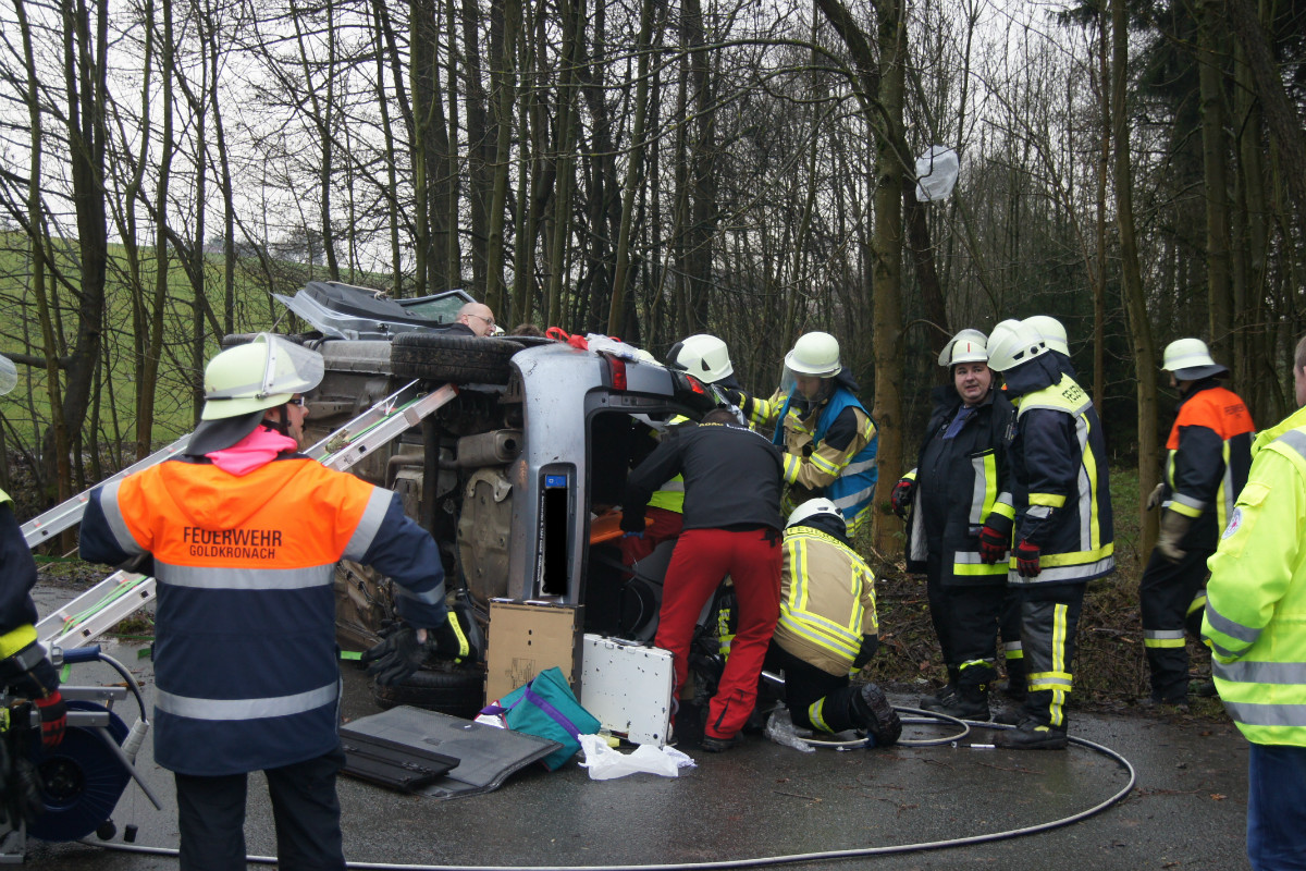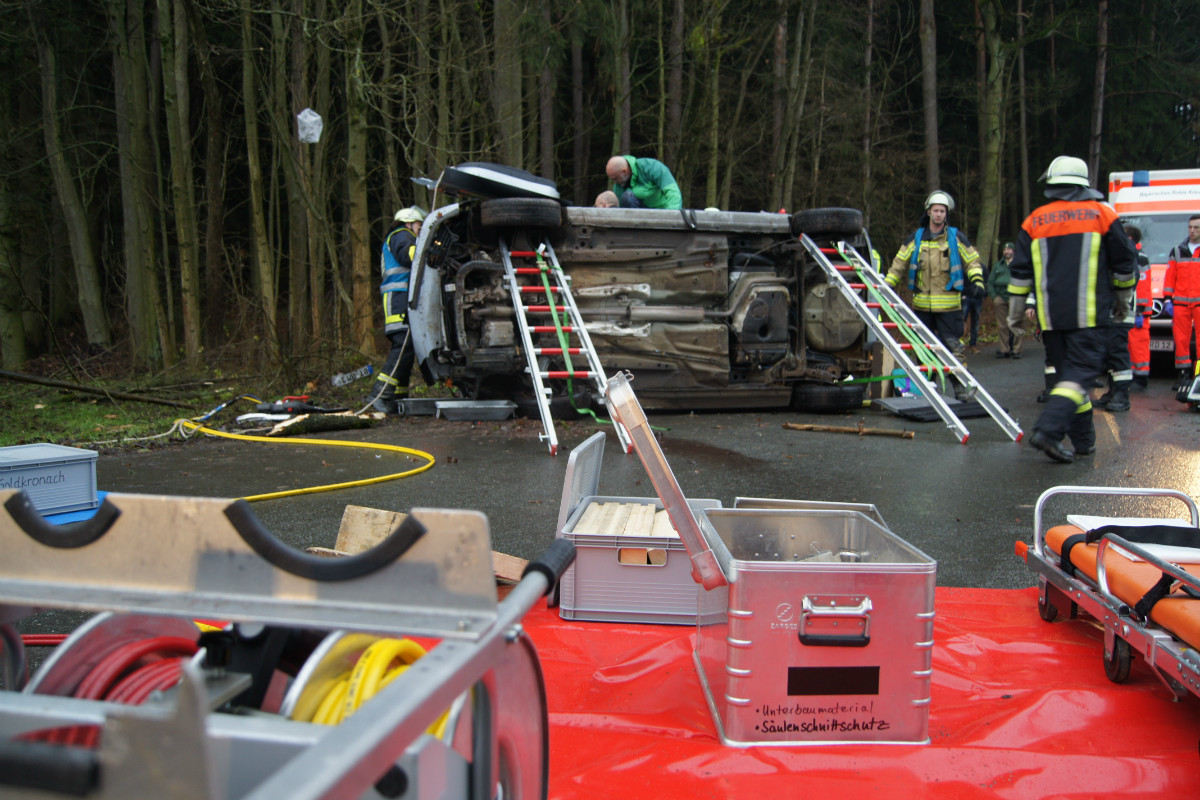 Zu einem Verkehrsunfall mit eingeklemmter Person wurden die Freiwilligen Feuerwehren Deps, Benk, Dressendorf und der Löschzug Nemmersdorf-Goldkronach am Vormittag des 15.12.2014 um 9:31 Uhr alarmiert. Auf der Gemeindeverbindungsstraße zwischen Deps und Dressendorf war ein PKW aus ungeklärter Ursache von der Fahrbahn abgekommen, gegen kleinere Bäume und Büsche gestoßen und anschließend auf die Fahrbahn zurück geschleudert, wo er auf der Seite liegen blieb. Die eingesetzten Kräfte sicherten das Fahrzeug, retteten den Fahrer aus seiner misslichen Lage und übergaben ihn an den Rettungsdienst. Zudem wurde eine Verkehrsumleitung eingerichtet und auslaufende Betriebsstoffe gebunden. Eine weiterführende Ölspur wurde ebenfalls mit Bindemittel abgestreut. Im Einsatz waren rund 40 Kräfte von Feuerwehr, Rettungsdienst und Polizei. Der Einsatzleiter Thomas Zapf wurde unterstützt von KBM Danny Hieckmann, KBM Udo Müller und KBI Kerstin Schmidt.