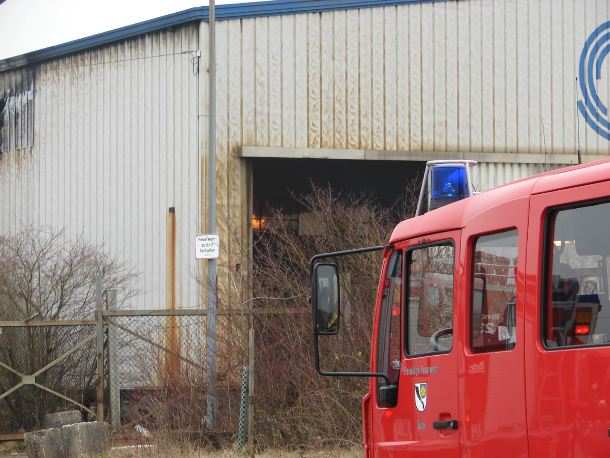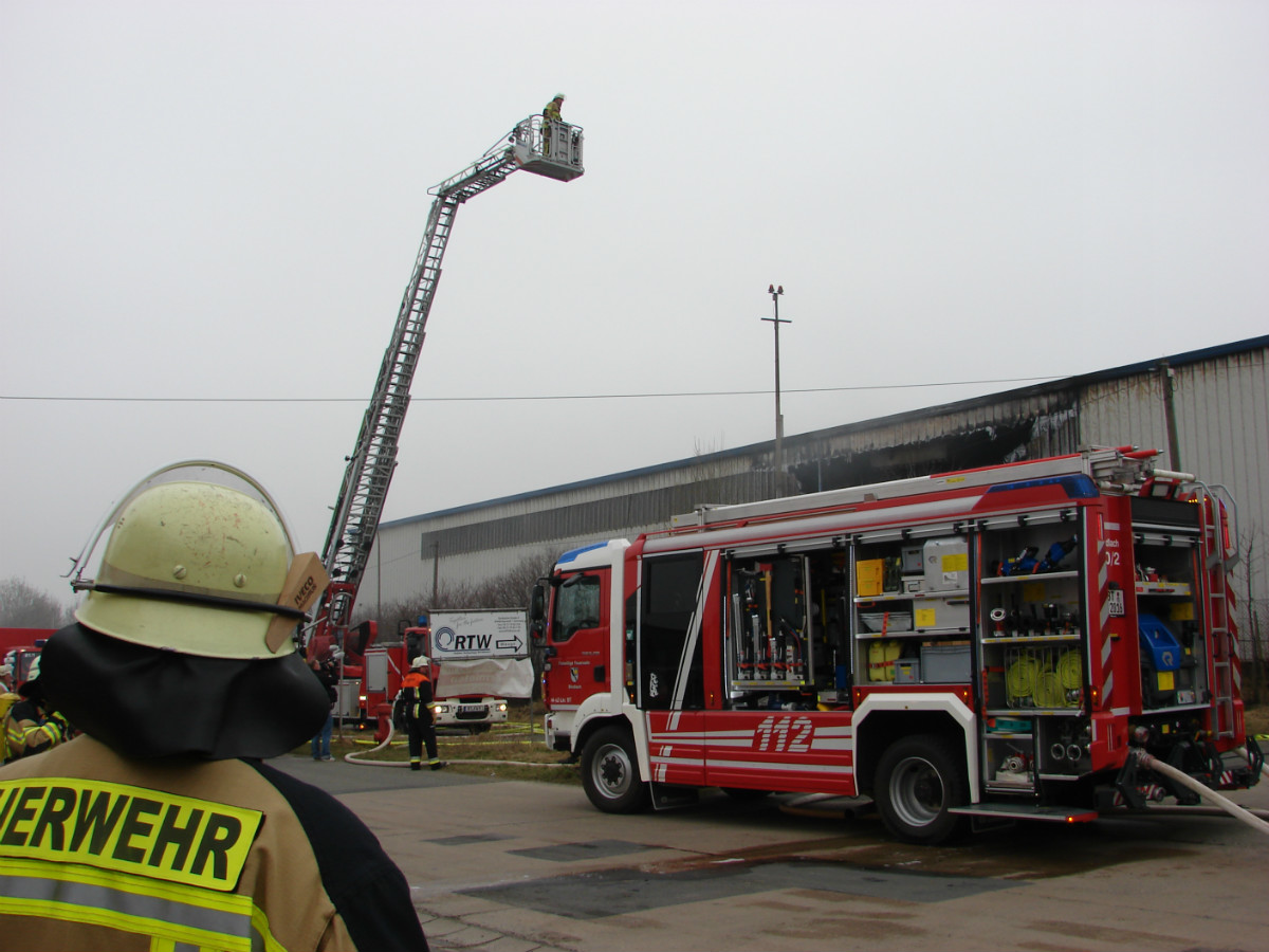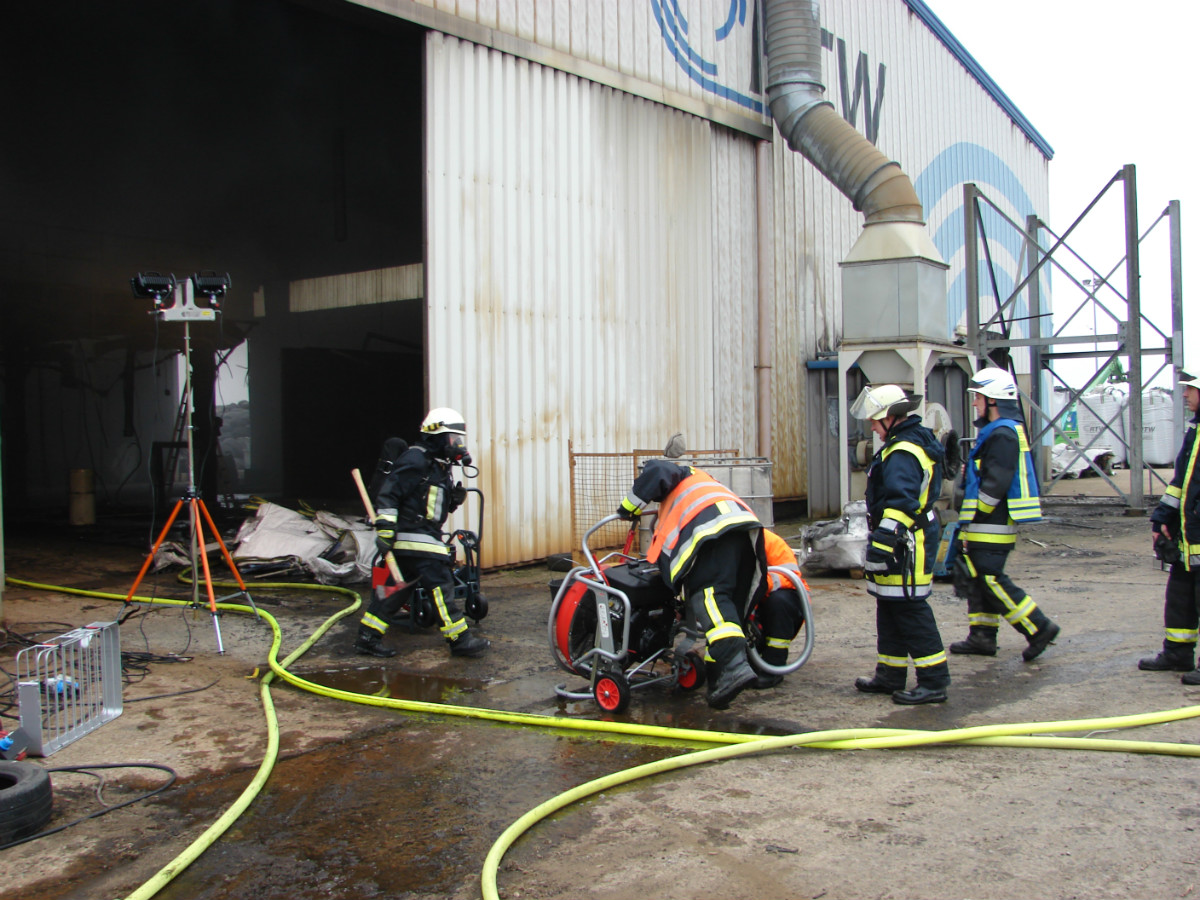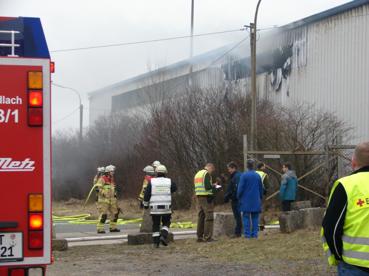 Den anrückenden Rettungskräften zeigte sich eine starke Rauchentwicklung aus einer Fabrikhalle. Die eingesetzten Atemschutztrupps fanden im Inneren der Fabrikhalle einen offenen Brand vor. Durch den schnellen Einsatz konnte der Brand auf das Gebäude begrenzt und so ein Übergreifen auf die gelagerten Altreifen verhindert werden. Durch die starke Hitze zerbarsten die Fenster, wodurch die Fassade in Mitleidenschaft gezogen wurde. Vier Angestellte der Firma wurden dem BRK zur weiteren Versorgung übergeben. Alle vier wurden in ein Krankenhaus gebracht, da der Verdacht auf eine Rauchgasvergiftung bestand. Das BRK war mit 25 Einsatzkräften, darunter auch der Rettungshubschrauber Christoph 20 und mehrere Notärzte vor Ort. Der Einsatzleiter Konrad Bauer wurde von der Unterstützungsgruppe Örtlicher Einsatzleiter, sowie Kreisbrandrat Hermann Schreck und Kreisbrandinspektor Winfried Prokisch unterstützt.