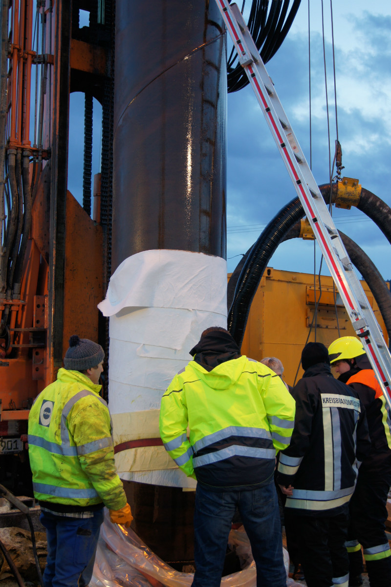 Ein Gremium aus Fachleuten von Wasserwirtschafts- und Gesundheitsamt, der Gefahrgutkreisbrandmeister der Feuerwehr, Danny Hieckmann sowie die Verantwortlichen der Baufirma und des Wasserzweckverbandes eilten an der Einsatzstelle zusammen, um den Schaden einzugrenzen. Durch die Lage inmitten eines Wasserschutzgebietes galt höchste Vorsicht bei der weiteren Vorgehensweise. Mit Vlies wurde der Bohrer im Bereich seiner Zugänglichkeit abgerieben. Um das kontaminierte Vlies fachgerecht entsorgen zu können, wurden bei einer Firma aus Bindlach entsprechende Fässer geordert, die vom Gerätewagen Florian Bindlach 81/1 nach Mehlmeisel transportiert wurden. Da sich abzeichnete, dass der Einsatz bis spät in die Nacht dauern wird, wurden umfangreiche Ausleuchtungsmaßnahmen ergriffen.