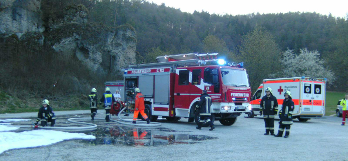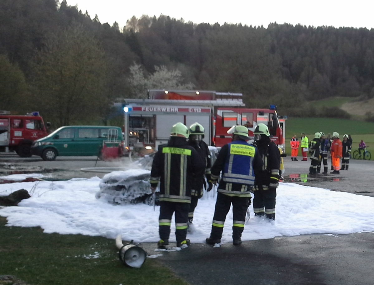 „PKW-Brand – Person in Gefahr – Alarm für die Feuerwehren Tüchersfeld, Pottenstein und Waischenfeld!“ Mit dieser Alarmmeldung wurde der Frühlingsabend des 19.04.2015 für viele ehrenamtliche Einsatzkräfte von Feuerwehr und Rettungsdienst um kurz nach 19:00 Uhr beendet. Bereits auf der Anfahrt zur Einsatzstelle wurden die anrückenden Kräfte informiert, dass der PKW bereits in Vollbrand steht und über einen Gasantrieb verfügt.