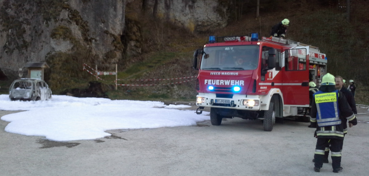 Am Ort des Geschehens wurde durch die Wehren aus Pottenstein und Tüchersfeld umgehend ein Löschangriff vorgenommen. Durch den Einsatz eines PA-Trupps und Schwerschaum war der Brand auch schnell unter Kontrolle. Für die anrückende Wehr aus Waischenfeld konnte deshalb „Alarm-Stopp“ gegeben werden.